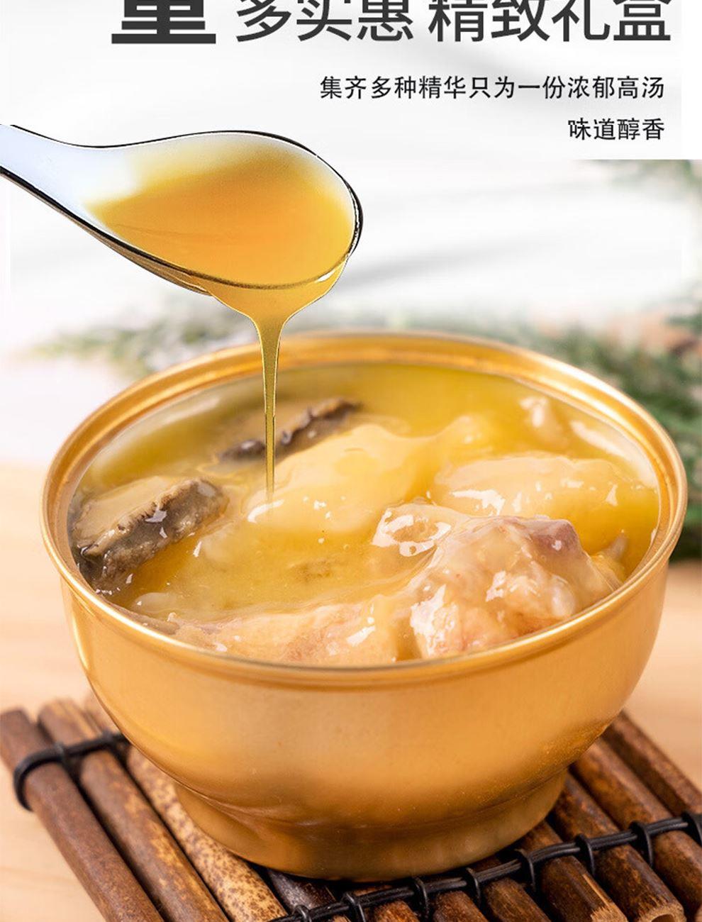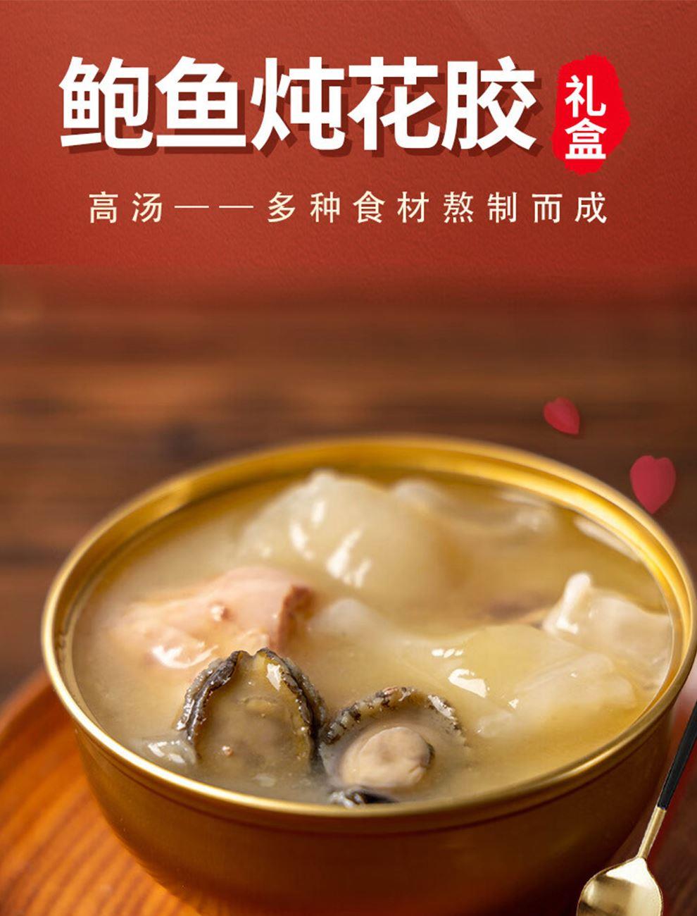 规格:252克*6碗/盒、固形物不低于40% 卖点: 1. 鲍鱼: - 作为海味珍品,鲍鱼肉质鲜嫩,口感弹牙。富含蛋白质、多种维生素和微量元素,具有极高的营养价值。 2. 花胶: - 花胶素有“海洋人参”之称,富含胶原蛋白、多种氨基酸等营养成分,对皮肤有很好的滋养作用 3、金汤提味增鲜, 味道浓郁,金汤味道醇厚,融合了多种食材的精华,既有南瓜的香甜,又有骨汤的鲜美。 - 与鲍鱼和花胶的味道相互融合,提升了整道菜肴的风味。