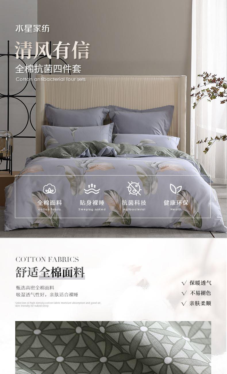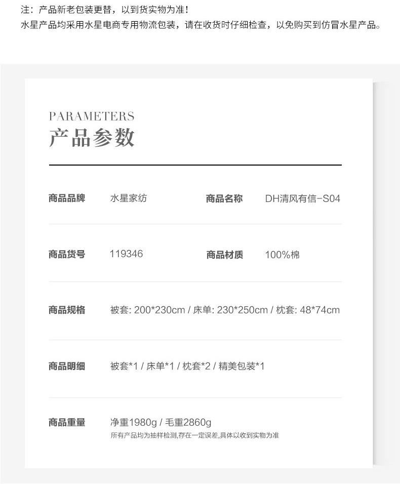 材 质:棉 规 格:1.5m床 被套:200×230cm 床单:230×250cm 枕套:48×74cm×2