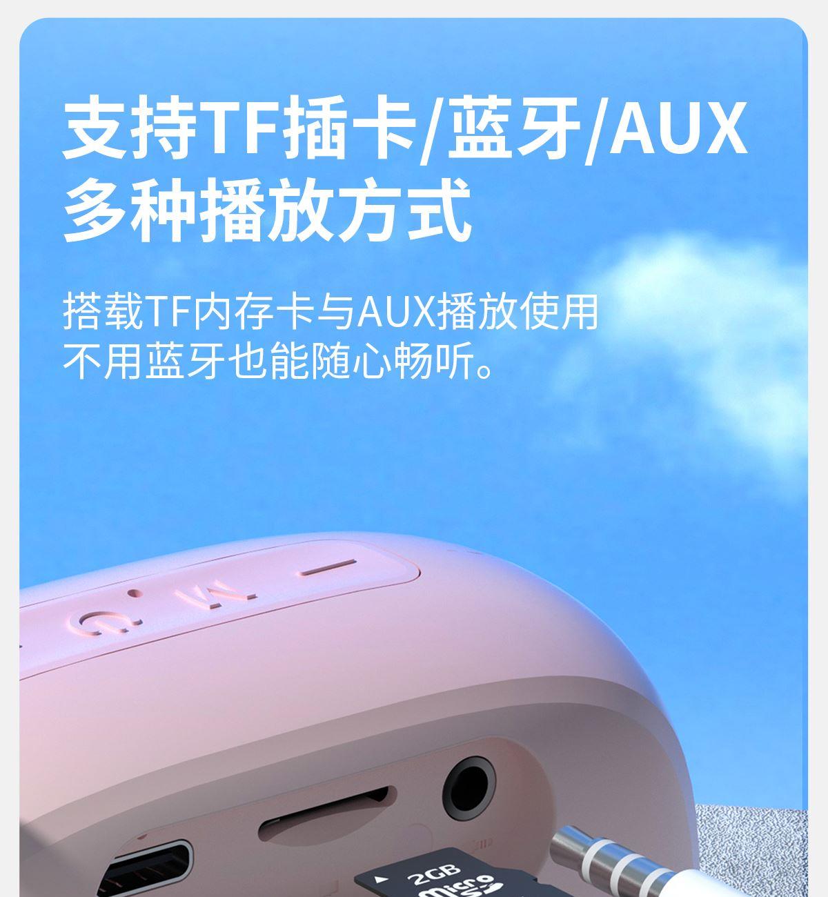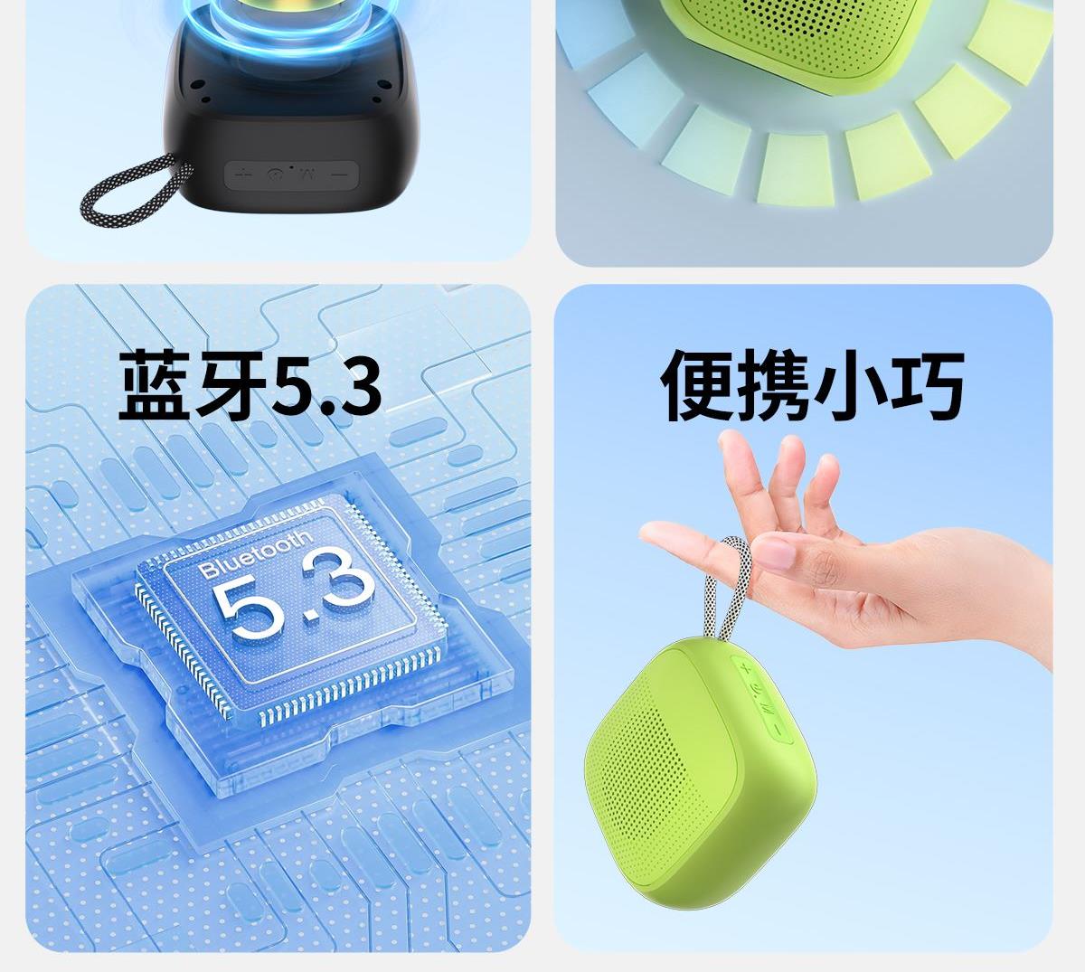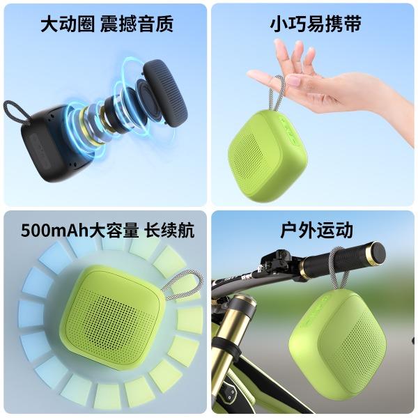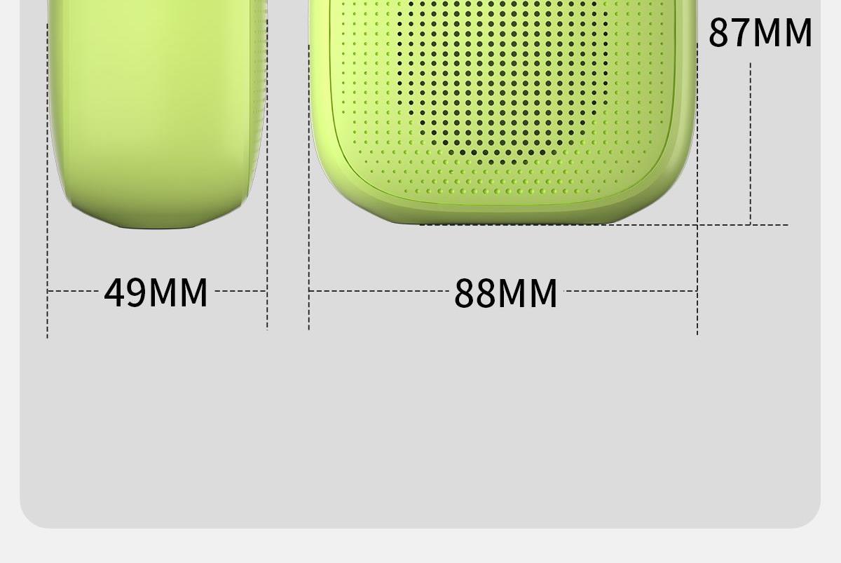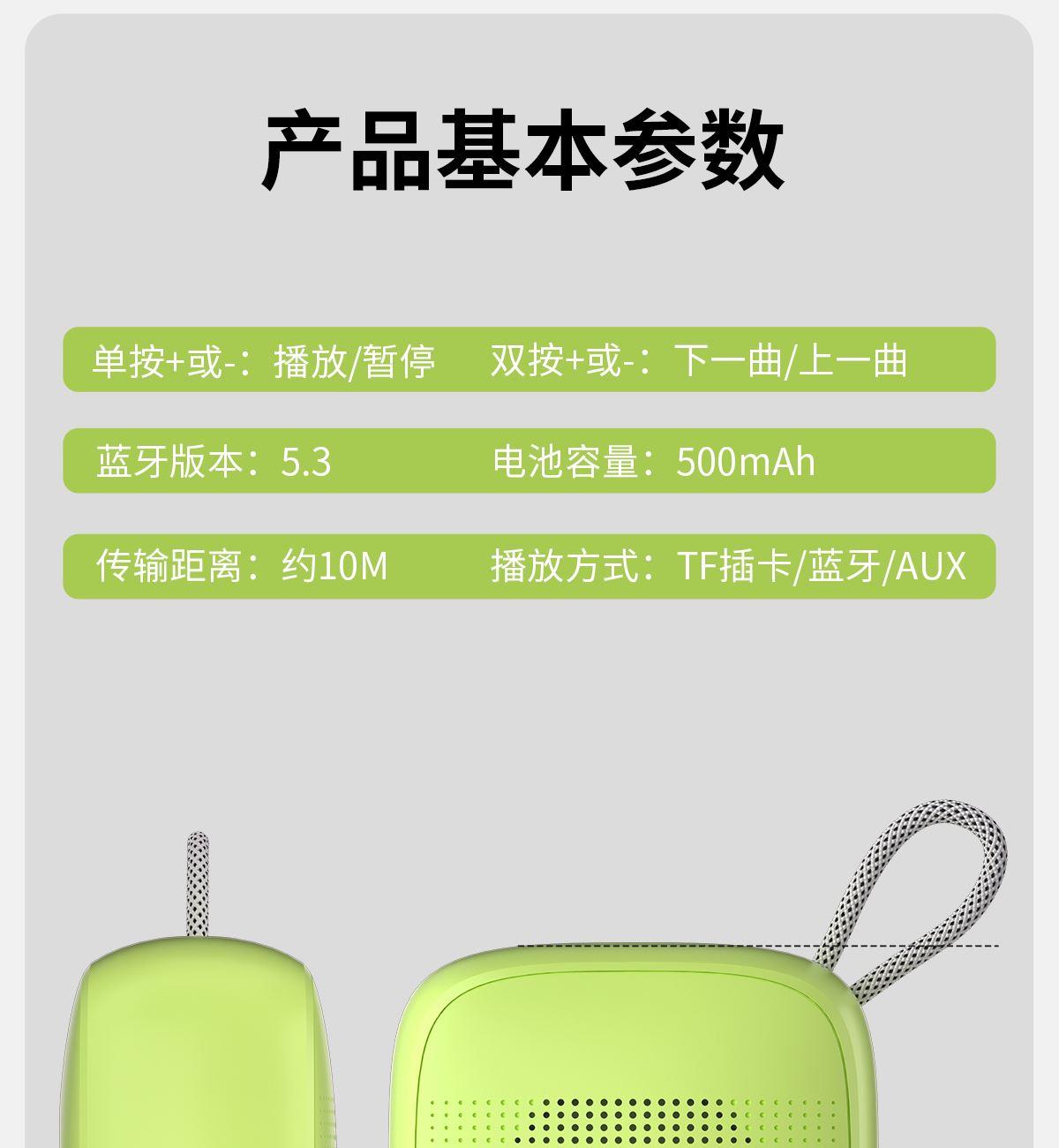 产品尺寸:8*8*4.65cm 产品颜色:绿 粉 月岩白 黑 灰 产品材质:ABS+布网 产品净重:219g 电池容量:500毫安 接收距离: ≤10m 播放时长: 1.5-2小时 产品特点 续航持久 大音量不破音 传输距离10米左右 无延迟 搭配蓝牙5.3 广泛兼容各种设备 支持TF插卡/蓝牙/AUX 多种播放方式