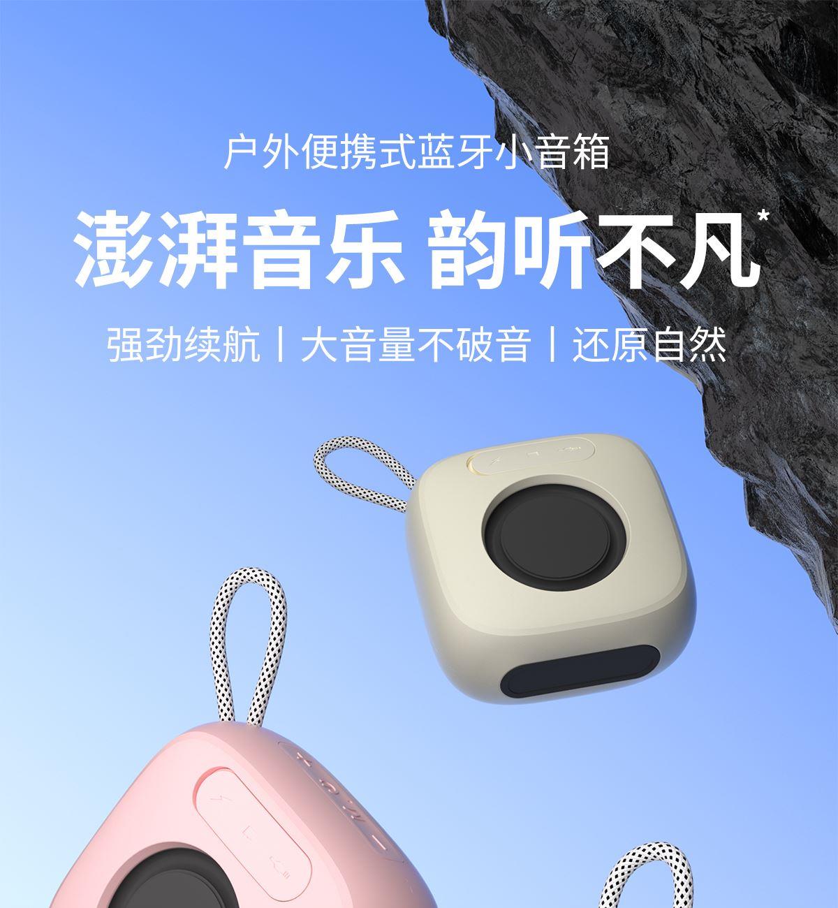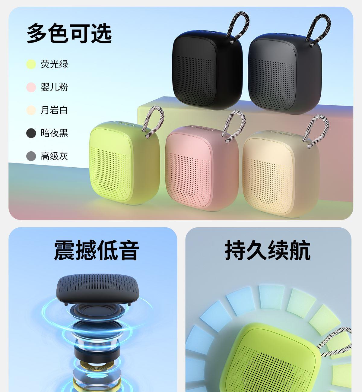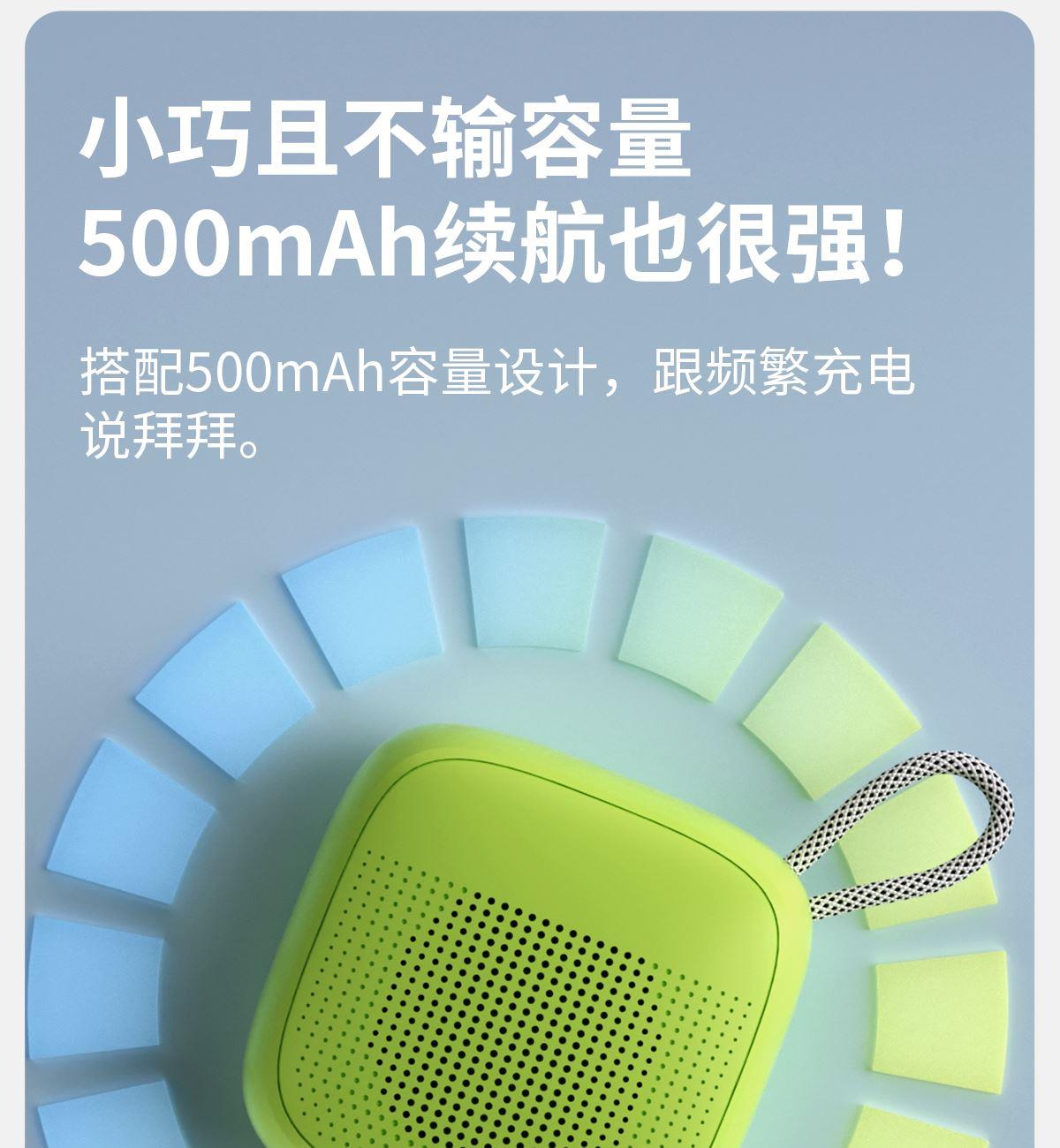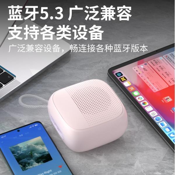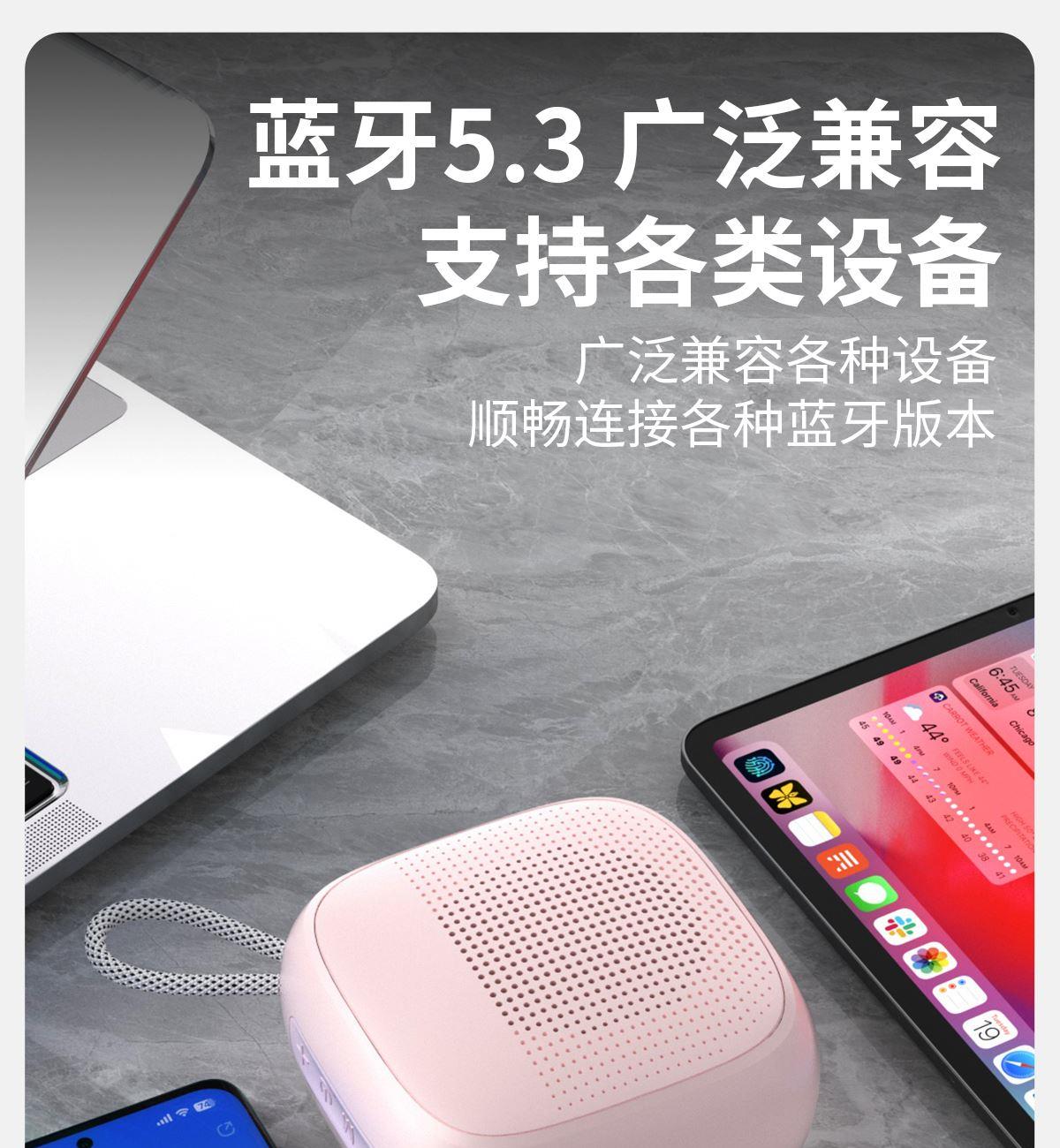 产品尺寸:8*8*4.65cm 产品颜色:绿 粉 月岩白 黑 灰 产品材质:ABS+布网 产品净重:219g 电池容量:500毫安 接收距离: ≤10m 播放时长: 1.5-2小时 产品特点 续航持久 大音量不破音 传输距离10米左右 无延迟 搭配蓝牙5.3 广泛兼容各种设备 支持TF插卡/蓝牙/AUX 多种播放方式