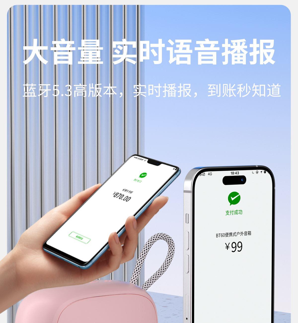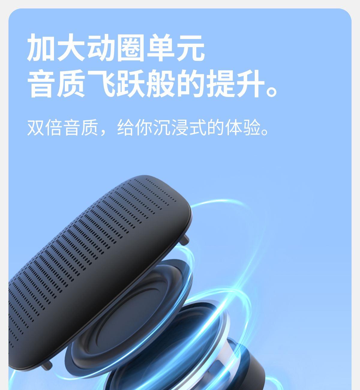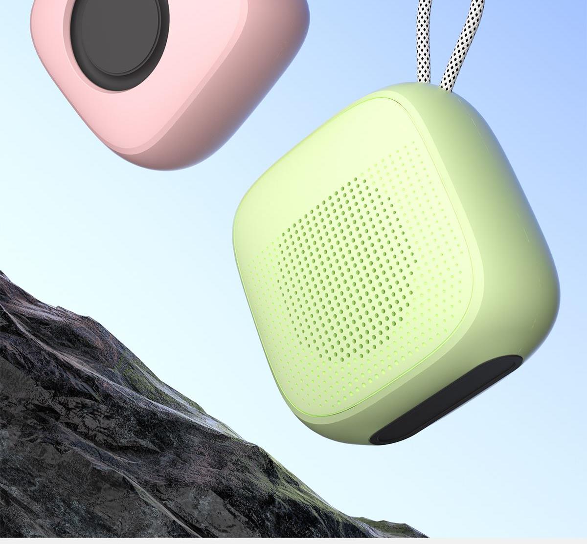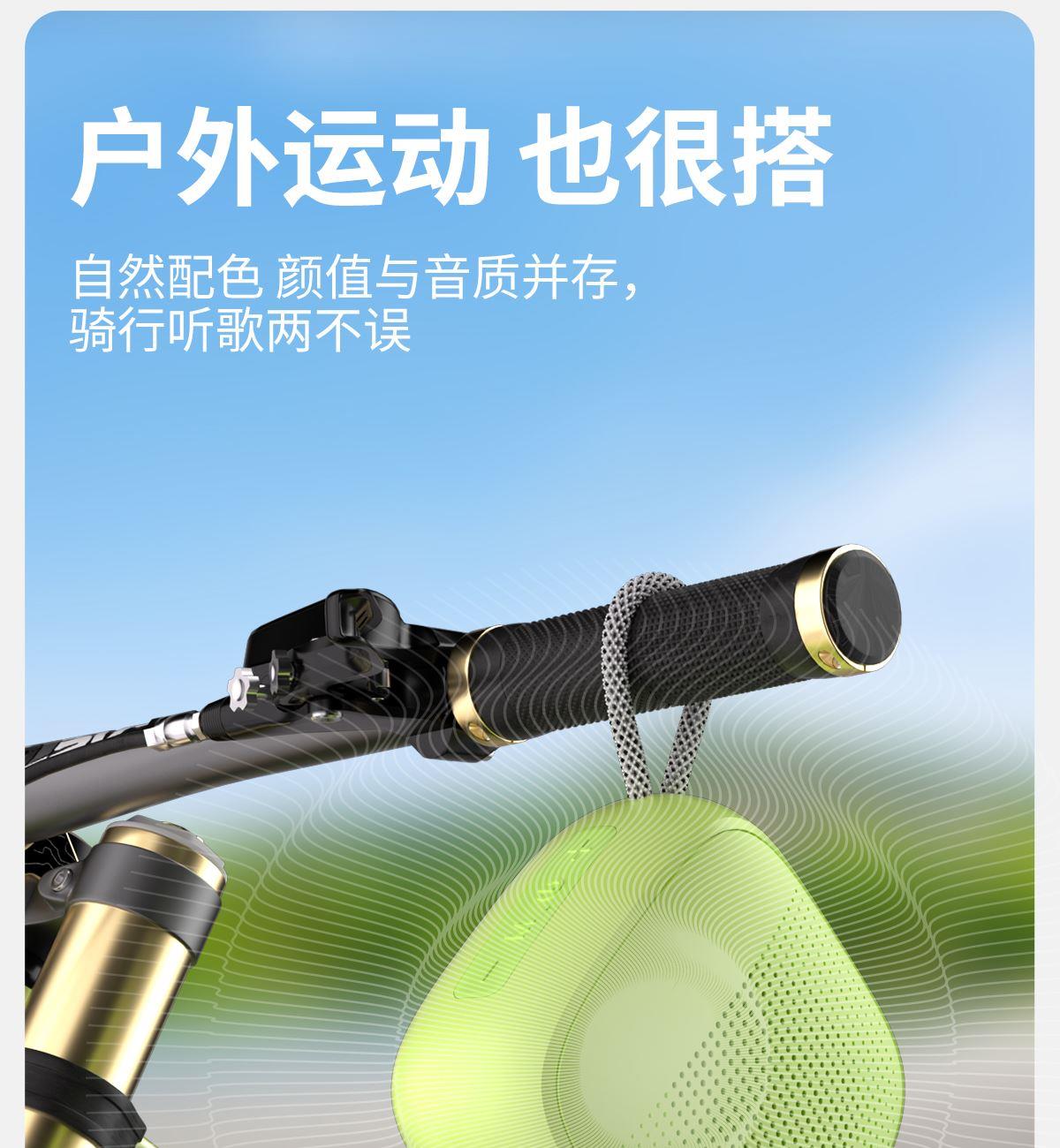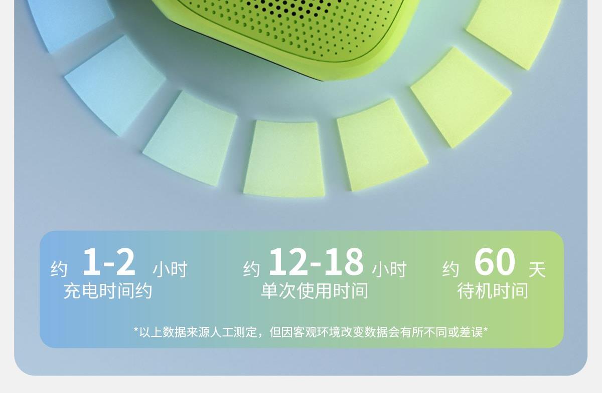 产品尺寸:8*8*4.65cm 产品颜色:绿 粉 月岩白 黑 灰 产品材质:ABS+布网 产品净重:219g 电池容量:500毫安 接收距离: ≤10m 播放时长: 1.5-2小时 产品特点 续航持久 大音量不破音 传输距离10米左右 无延迟 搭配蓝牙5.3 广泛兼容各种设备 支持TF插卡/蓝牙/AUX 多种播放方式