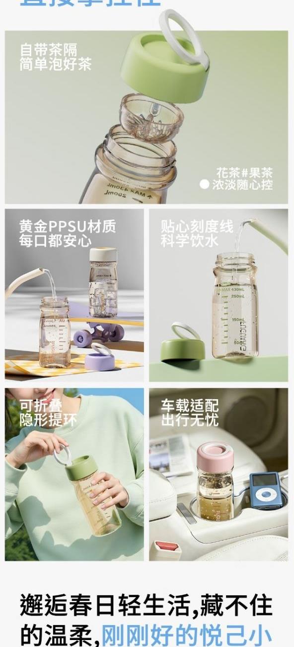 颜色:绿色 粉色 白色 紫色 尺寸:68*162mm 材质:美国FDA认证母婴级PPSU黄金塑料母婴级杯身+滤网,耐高温达到180度。 圆润杯口,弧形ppsu茶隔过滤网,重构健康饮水体验。 加厚硅胶材质,密封不漏水。 包装:单瓦盒