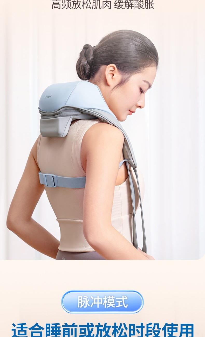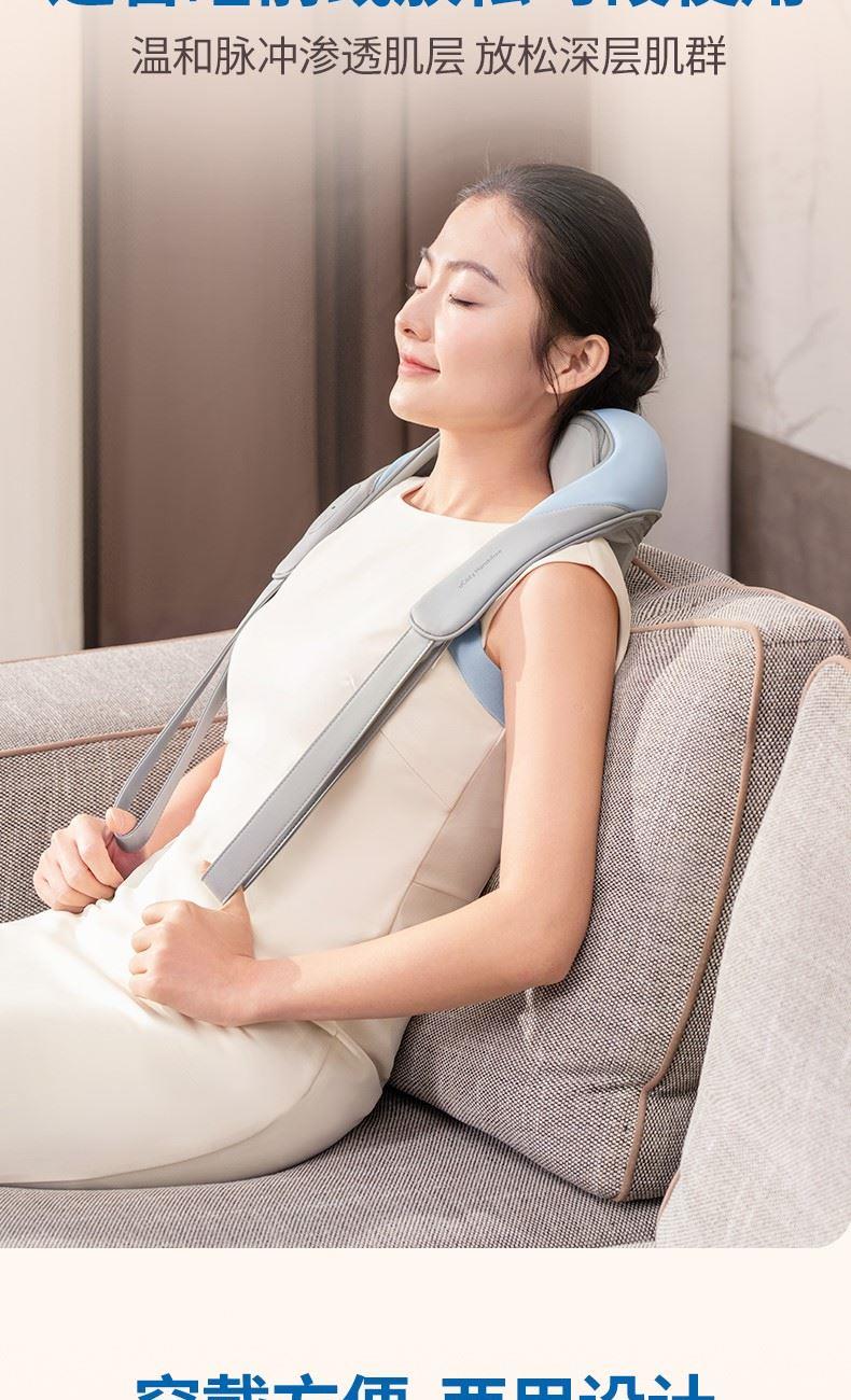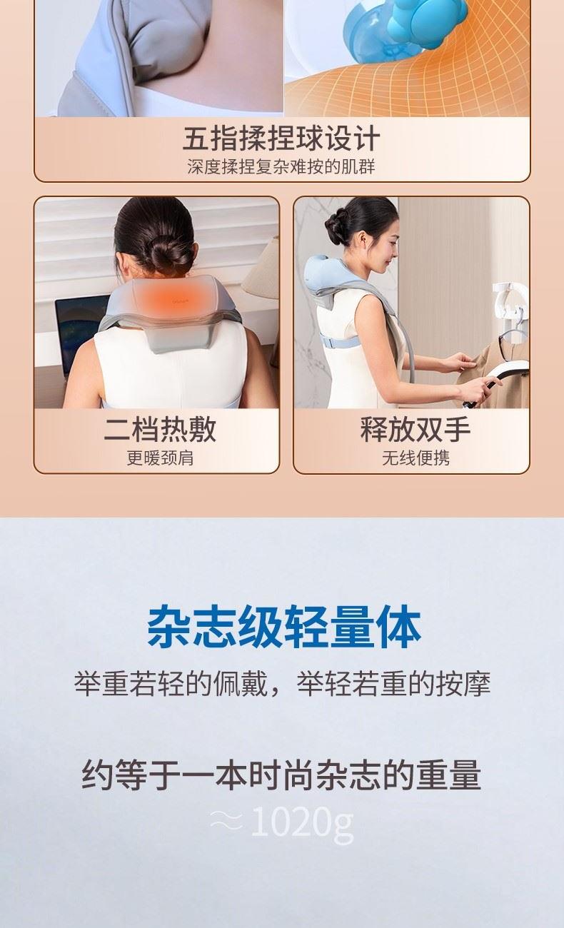 消耗功率:5V-2AUSB输入 产品尺寸:56(长)x28(宽)x17(高)cm 自动定时:10min 净重:约1.1kg 毛重:约1.6kg 1、轻享如羽,劲揉到位;轻松佩戴不压肩 2、V手抓捏解放双手温感热敷,无压佩戴体验,深层舒缓颈肩 3、无线操作,轻巧便携,一机多用,多场景适用 4、90min长时续航,轻量级1020g,可拆洗,Type-c接口设计