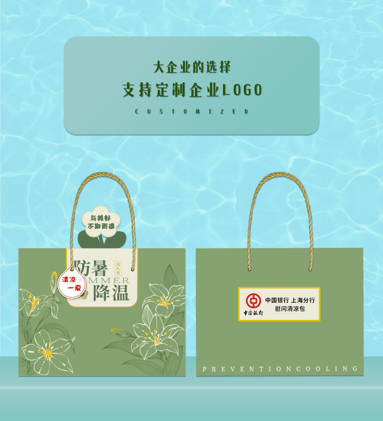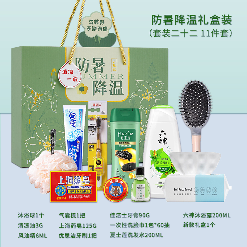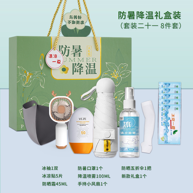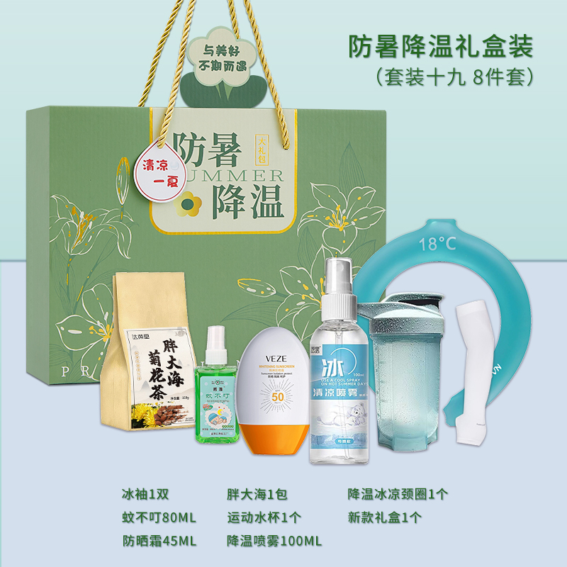 1.注:商城报价对应首张主图款式! 其他套装参考细节图,费用另计! 2. 咨询下单请备注好产品信息! 3.首图款式产品明细:防暑降温礼盒装(套装二十 10件套):冰凉贴5片,绿豆250ML,冷感毛巾1条,新款礼盒1个,蚊不叮80ML,清凉油3G,优思洁牙刷1把,润喉糖1盒,风油精6ML ,佳洁士牙膏90G
