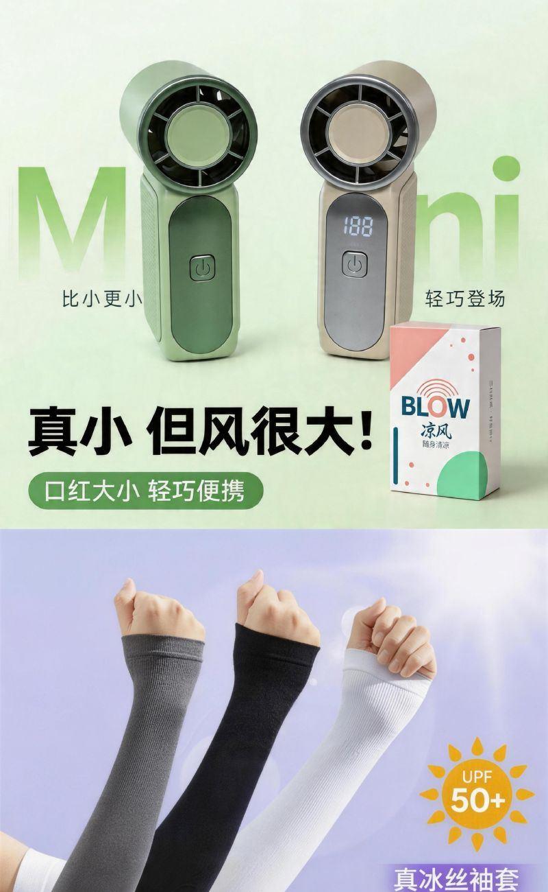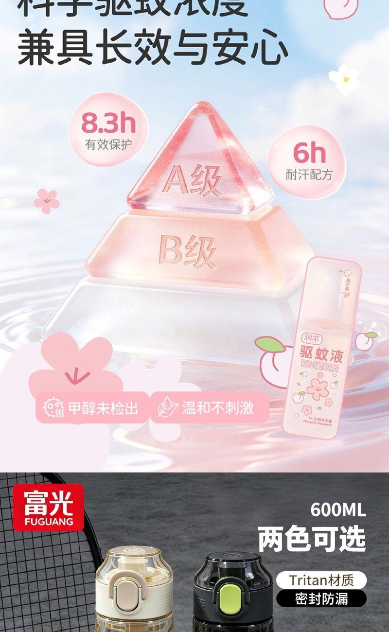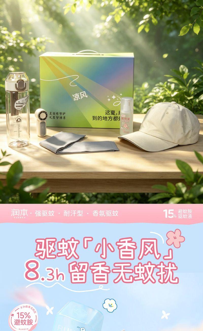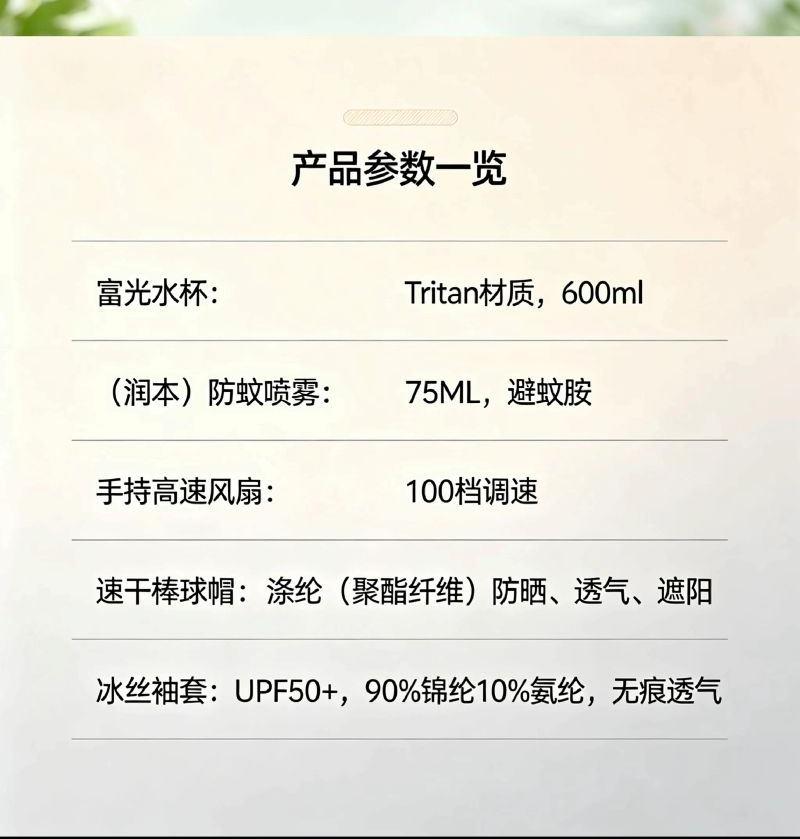 配置: (润本)防蚊喷雾*1 (富光)水杯*1 速干棒球帽*1 手持高速风扇*1 冰丝袖套*1 主要材质和功能: 富光水杯:Tritan材质,600ML (润本)防蚊喷雾:75ML,避蚊胺 速干棒球帽:涤纶(聚酯纤维),防晒,透气,遮阳 冰丝袖套:UPF50+,90%锦纶10%氨纶 手持高速风扇:100档调速