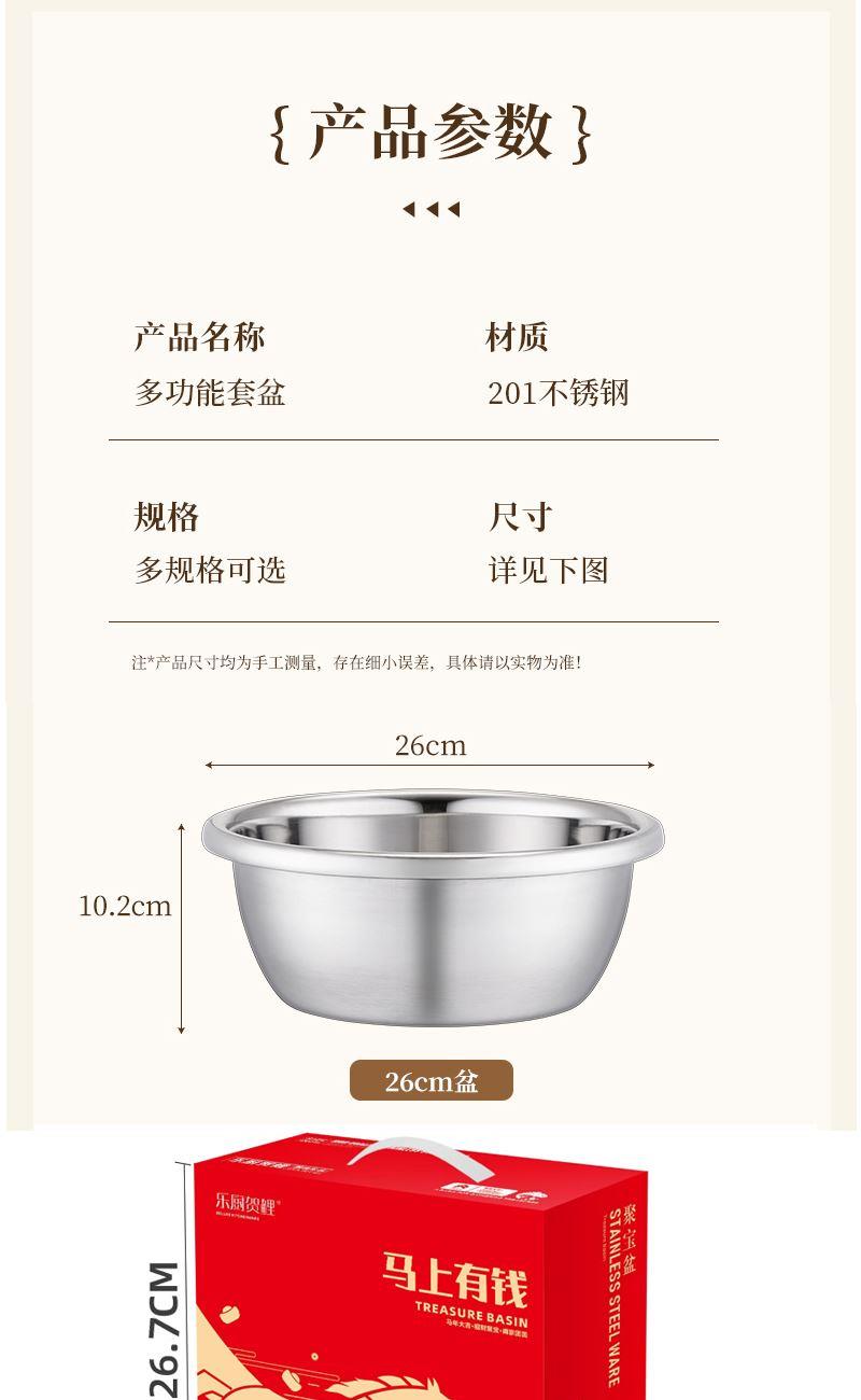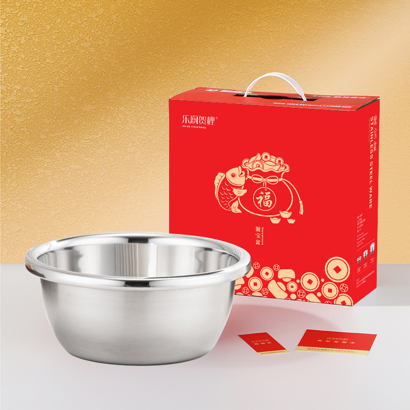 产品规格:26cm 产品材质:201不锈钢 外箱尺寸:95*55*55 cm 条 码:6959460801907 聚宝盆,顾名思义就是装满金银财宝,取之不尽用之不完的宝盆。 送礼送聚宝盆,美好寓意,广纳八方财富,汇聚四方鸿运。 加厚盆,宽边设计方便端拿,精抛工艺,清洗方便。 好礼品,是日日用得上,为你的消费者从日常生活入手, 颜值在线,厨房不再单调,精美礼盒包装,送礼有面子。 马上有钱,助力开门红,宣传必备礼品。