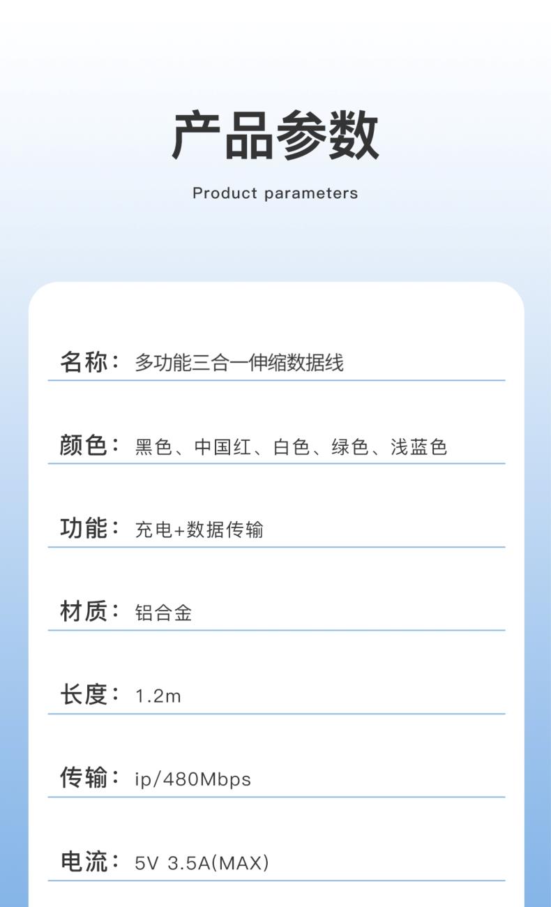 长 度:120cm 材 质:ABS+TPE面条线 颜 色:红 蓝 白 黑 绿 接 口:苹果接口 安卓接口 Type-c接口 输出电流:5A 功 能:充电 传输数据 产品净重:46g
