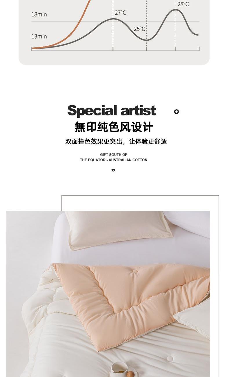 规 格:200×230(±2)cm 2500g 面 料:水洗棉 填 充:牛奶纤维(1500g) 细腻、柔软的面料,冬日的杯奶茶的温暖。 有机、健康的牛奶丝填充,冬日更贴心的丝滑呵护。 無印纯色风设计,双面撞色效果更突出,让体验更舒适