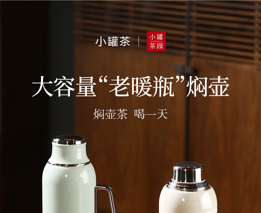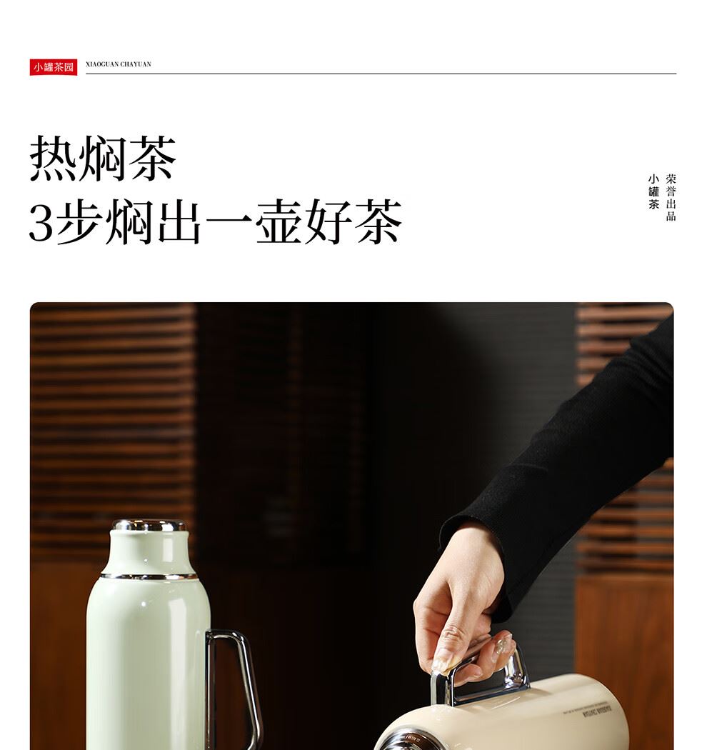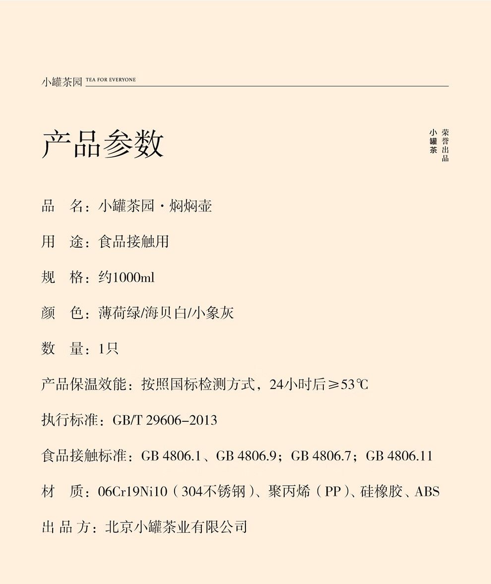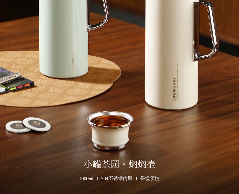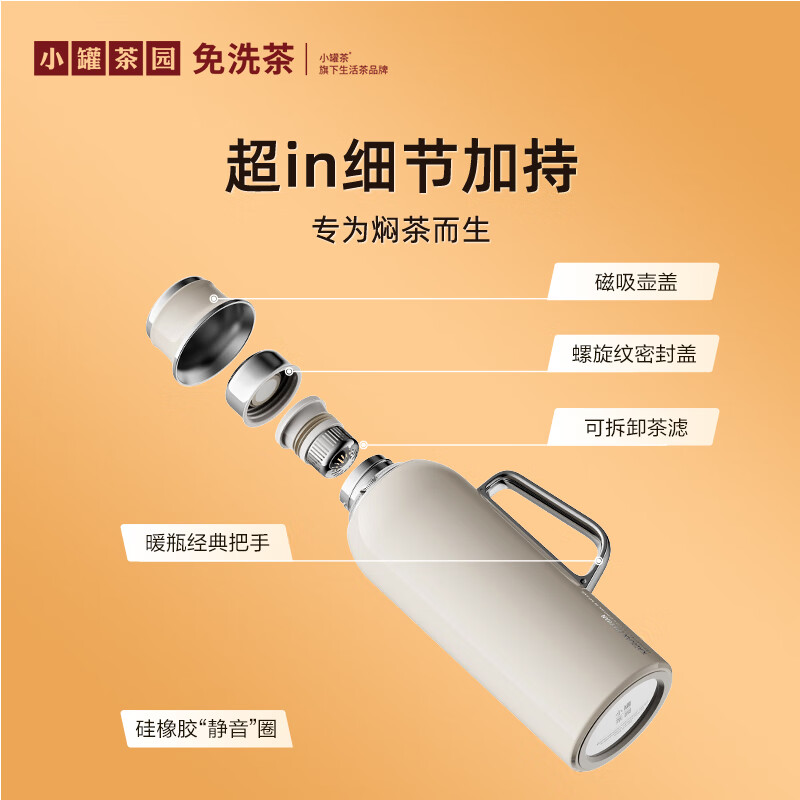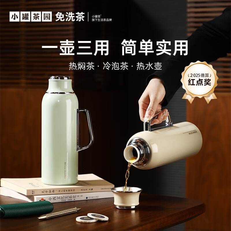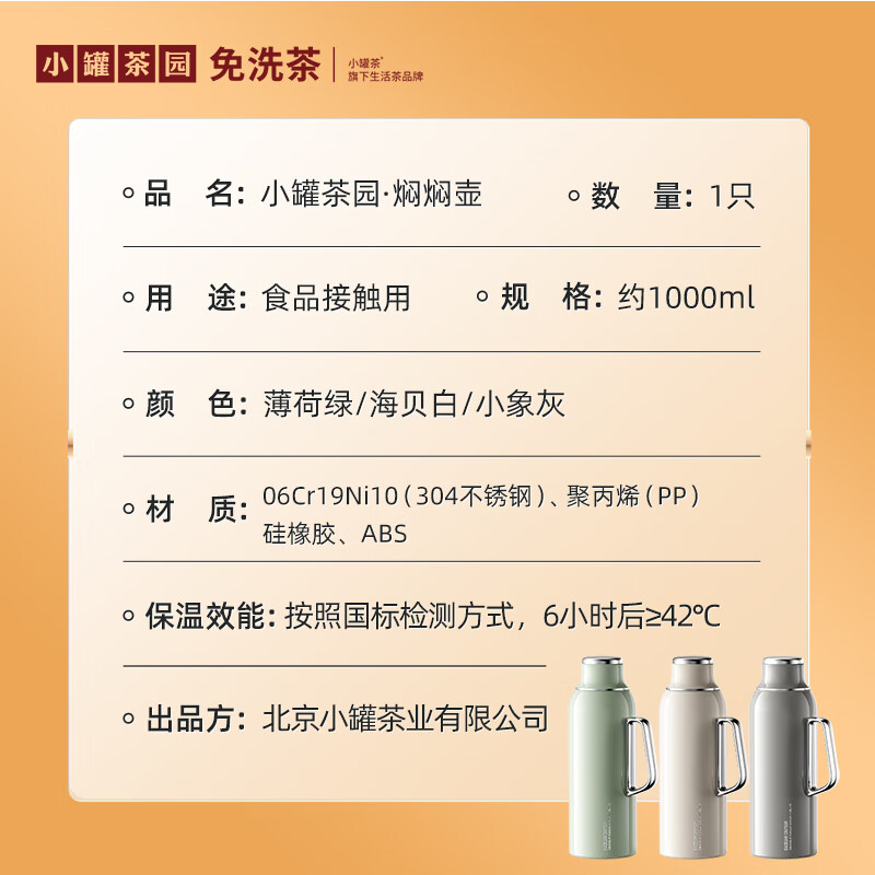 小罐茶园 x 免洗茶(小罐茶旗下生活茶pin牌) 大容量“老暖瓶”焖壶 焖壶茶 喝一天 保温保冷 | 焖泡皆可 | 四季适用 3款清雅配色 自用悦目 礼赠轻奢 磁吸壶盖设计 既是杯盖又是茶杯 磁吸壶盖,开合干脆利落,既是壶盖又是茶盏;双层敞口造型,端茶不烫手,喝茶更自在。 小罐茶园·焖焖壶 用途:食品接触用 规格:约1000ml 颜色:薄荷绿/海贝白/小象灰 数量:1只 出品方:北京小罐茶业有限公司