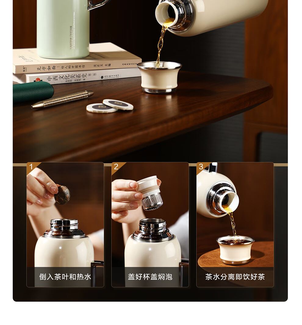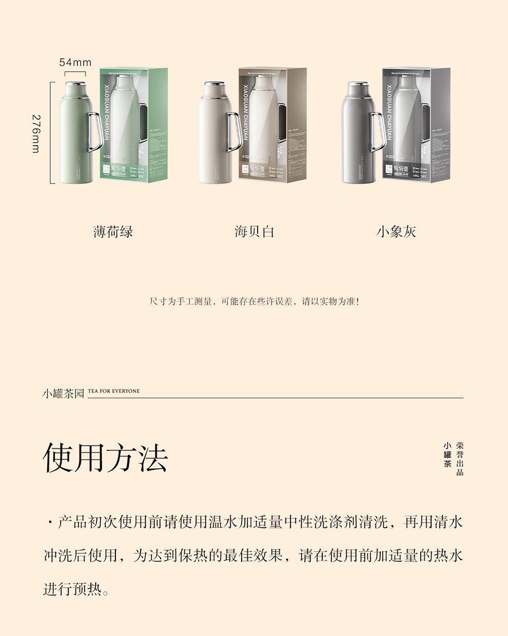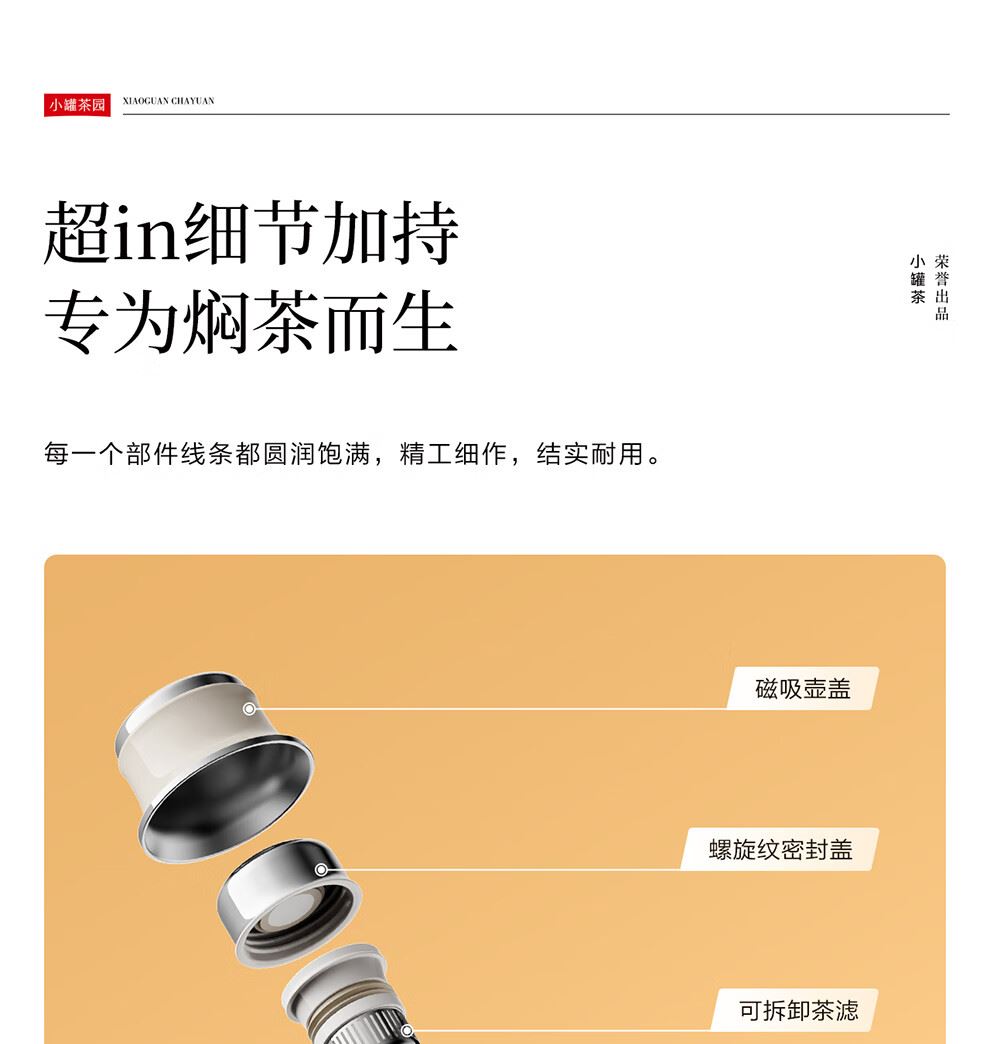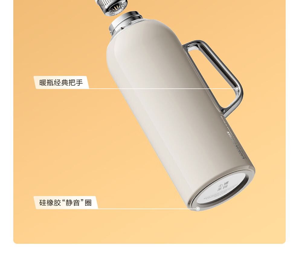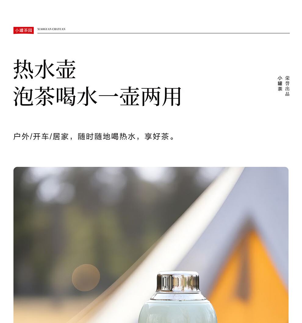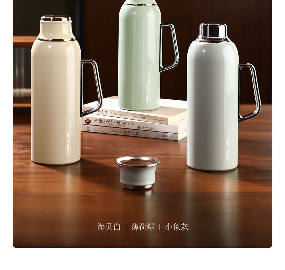 小罐茶园 x 免洗茶(小罐茶旗下生活茶pin牌) 大容量“老暖瓶”焖壶 焖壶茶 喝一天 保温保冷 | 焖泡皆可 | 四季适用 3款清雅配色 自用悦目 礼赠轻奢 磁吸壶盖设计 既是杯盖又是茶杯 磁吸壶盖,开合干脆利落,既是壶盖又是茶盏;双层敞口造型,端茶不烫手,喝茶更自在。 小罐茶园·焖焖壶 用途:食品接触用 规格:约1000ml 颜色:薄荷绿/海贝白/小象灰 数量:1只 出品方:北京小罐茶业有限公司