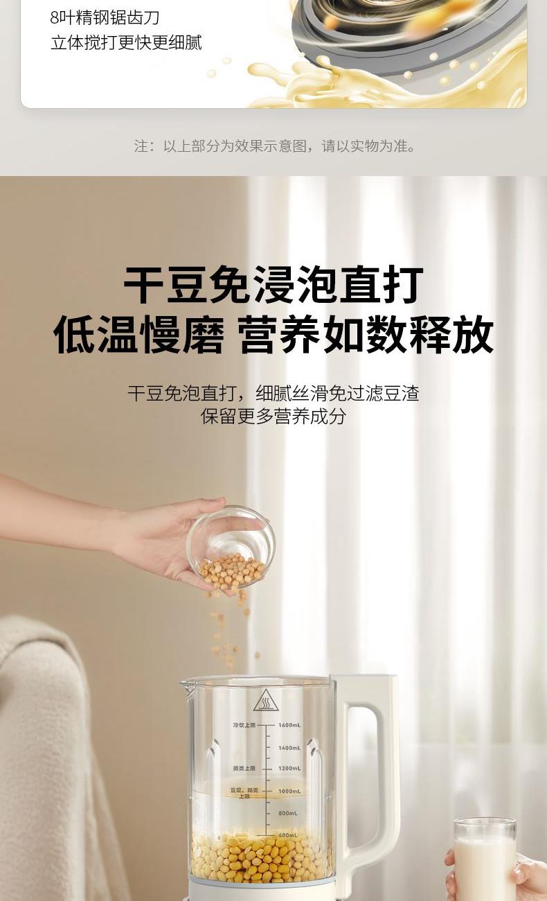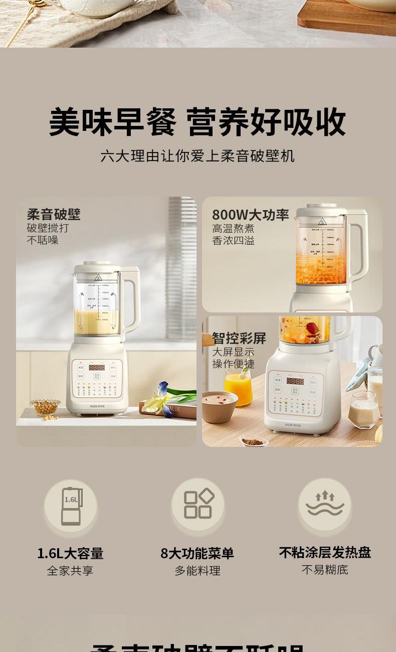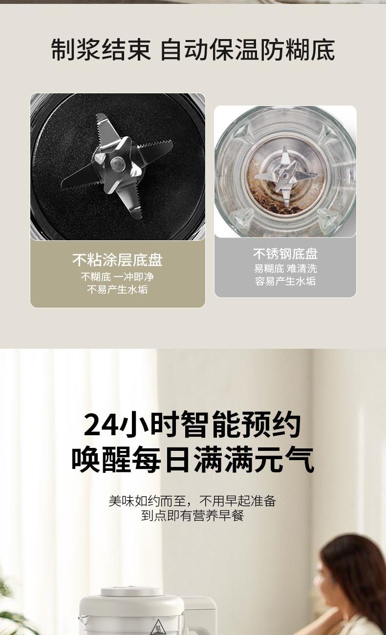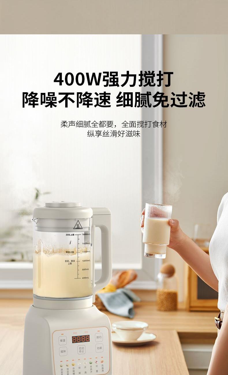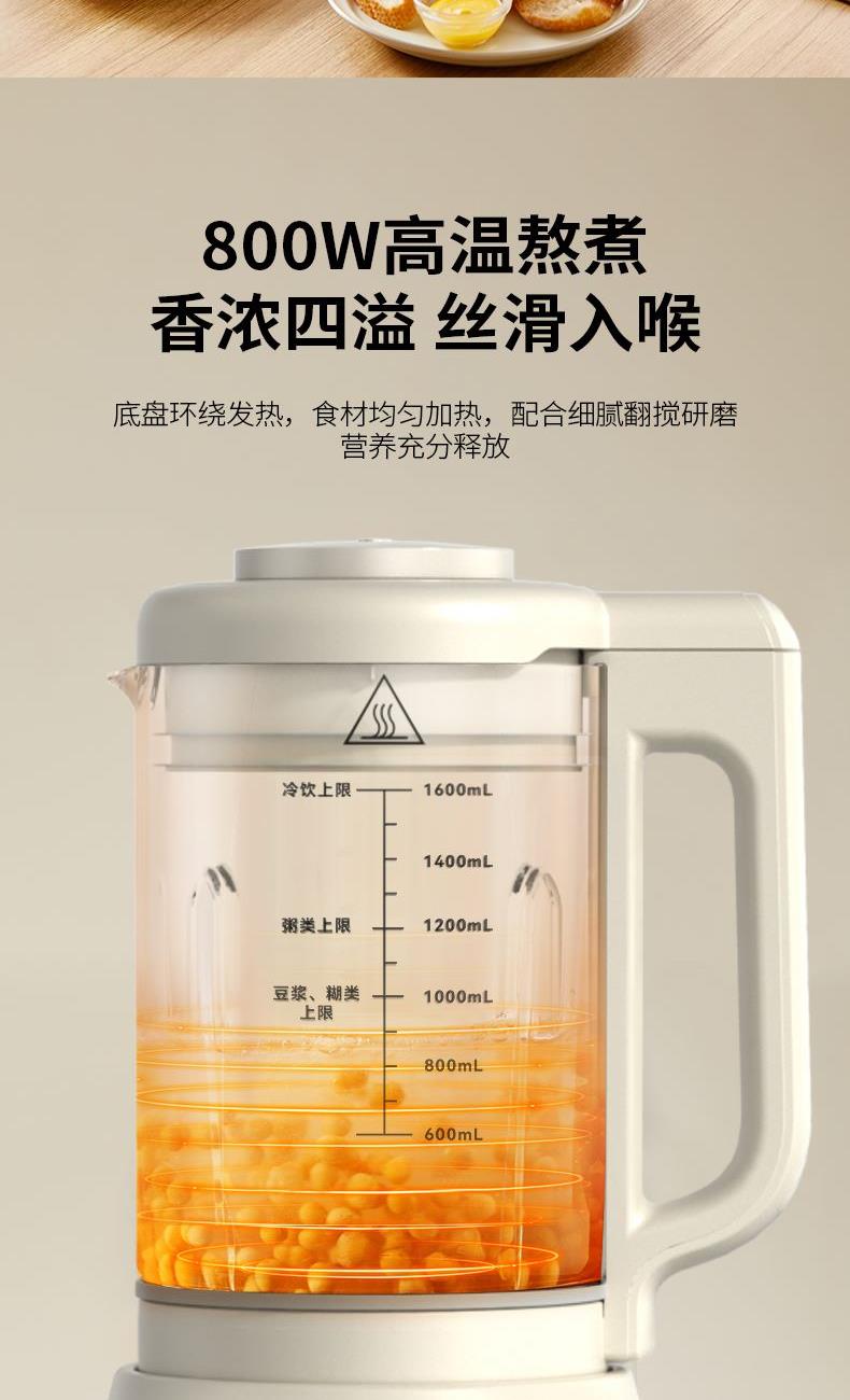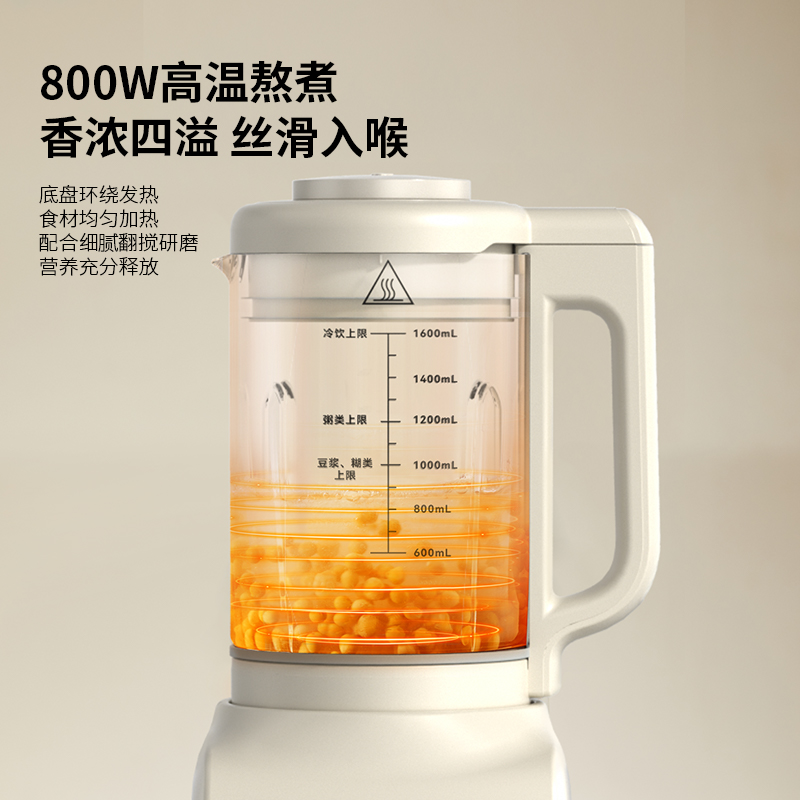 额定电压:220V~ 加热功率:800W 搅拌功率:400W 额定频率:50Hz 材质:杯体材质:高硼硅玻璃,杯盖:PP,密封圈:硅橡胶,发热盘、刀片、螺丝:304不锈钢 1200W加热功率高温熬煮释醇香 食品级304不锈钢杯,入口安心 低分贝降噪,不降口感 触选大屏,花式菜单一目了然 智能预约保温,起床即享