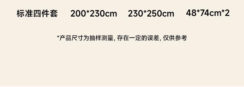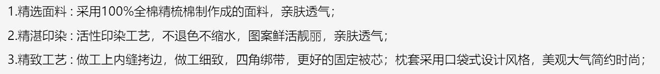 货 号 :HTJ-2403 面 料 :100 %精梳棉 规 格 :被套200*230cm 床单230*250cm 枕套48*74cm*2 重 量 :净重约2kg 毛重约2.3kg 包装尺寸 :41x32x11cm 装 箱明细 :17套 /箱 1.精选面料 : 采用100 %全棉精梳棉制作成的面料,亲肤透气; 2.精湛印染 : 活性印染工艺,不退色不缩水,图案鲜活靓丽,亲肤透气; 3.精致工艺 : 做工上内缝拷边,做工细致,四角绑带,更好的固定被芯;枕套采用口袋式设计风格,美观大气简约时尚;