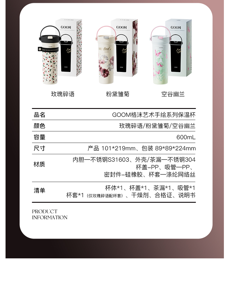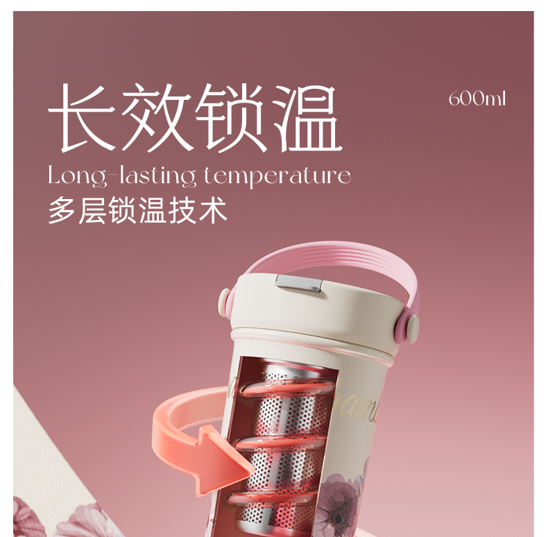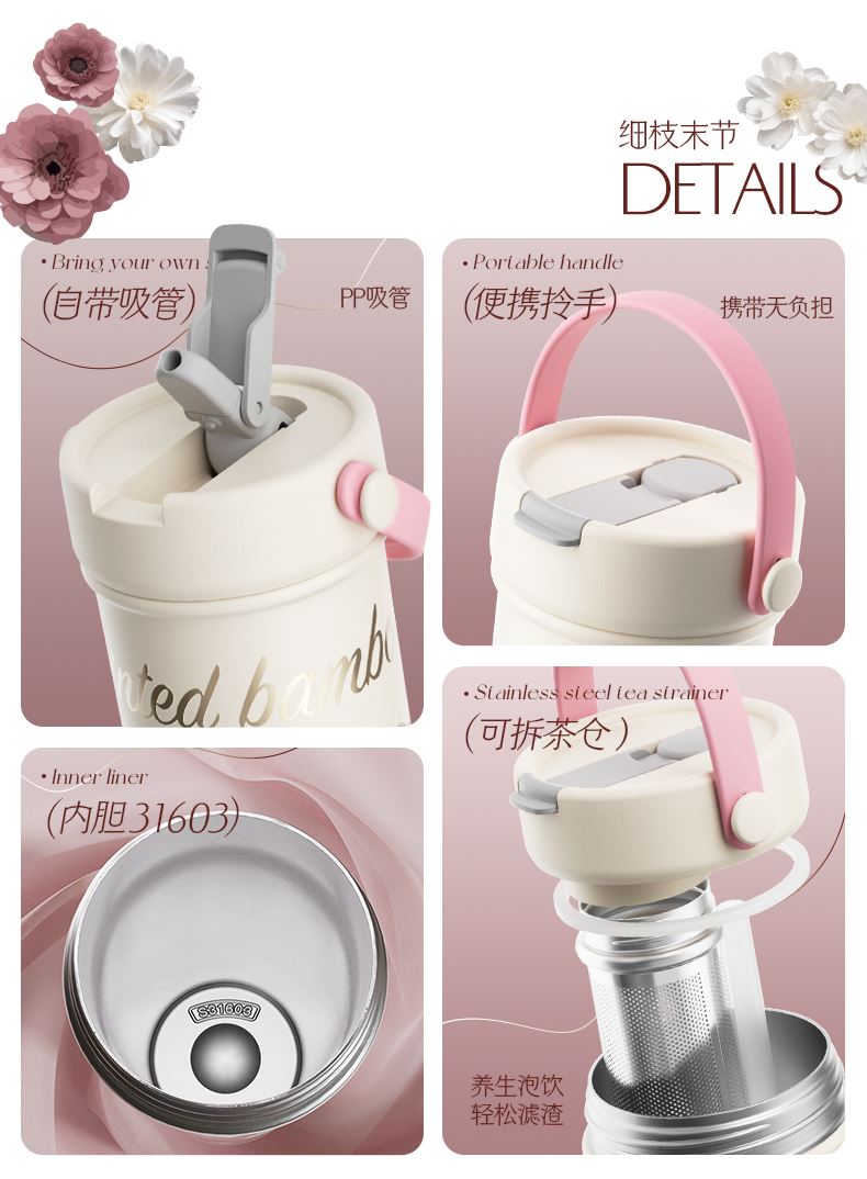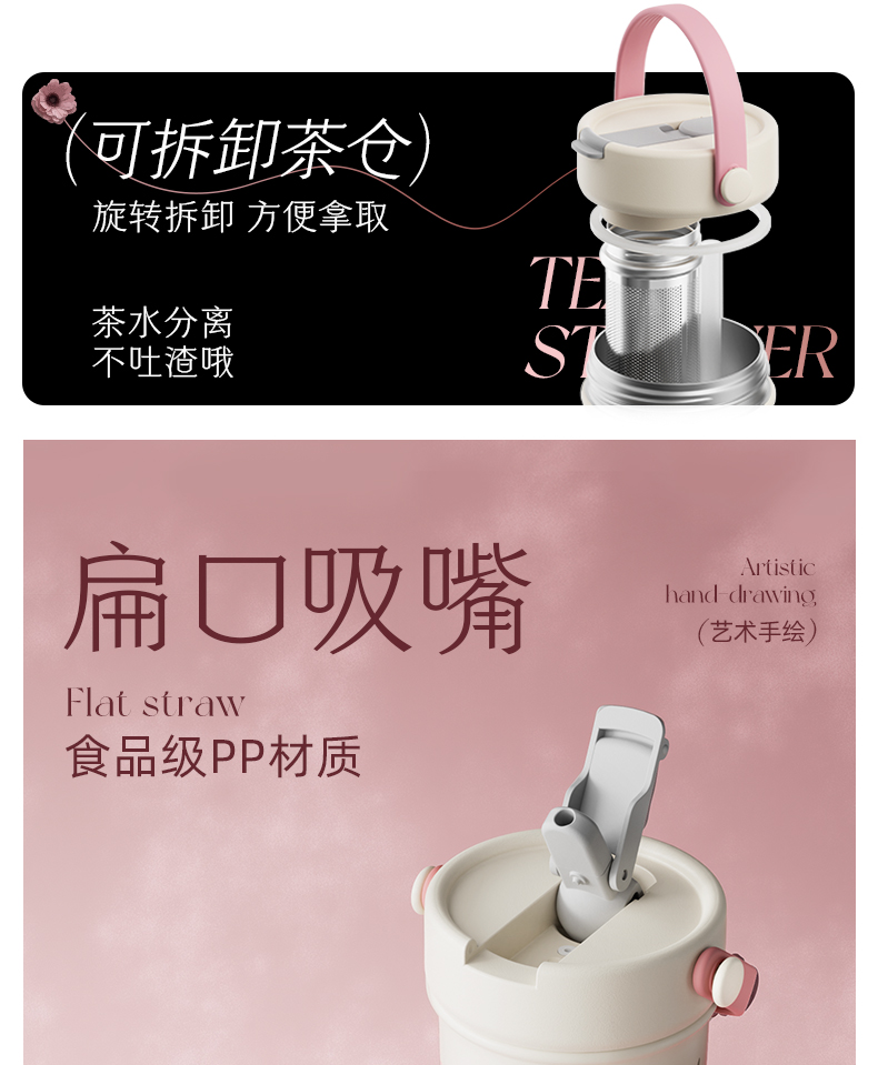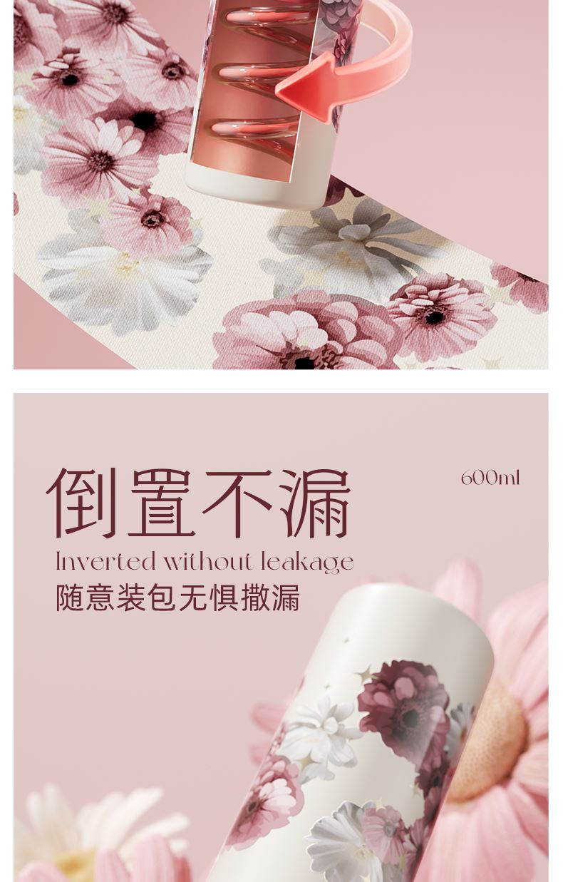颜 色:玫瑰碎语/粉黛雏菊/空谷幽兰 材 质:内胆—奥氏体不锈钢S31603,外壳、茶漏—奥氏体不锈钢S30408,吸管—PP聚丙烯(丙烯均聚物),杯盖—PP聚丙烯(丙烯与乙烯的聚合物),密封件-硅橡胶,杯套—涤纶网络丝 容 量:600ml 单杯尺寸:101*219mm 1、一杯双饮:痛快敞口喝,精致吸管饮 2、密封防漏:360密封,丢进包里不漏水 3、加长茶隔:轻松过滤,可拆卸拿取,清洁更方便 4、安心材质:食品级316内胆、长效保冷保热 5、超大容量:大容量,满足外出喝水需求 6、便携随行:自带硅胶提手,出行更便捷