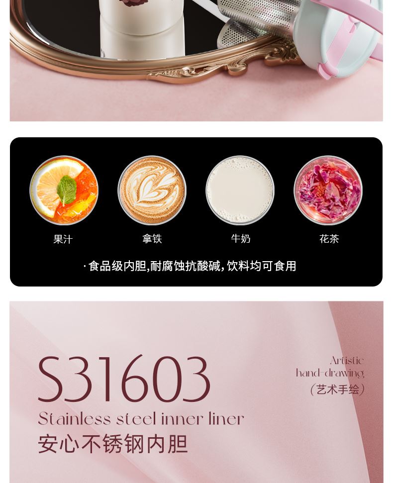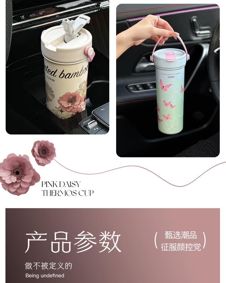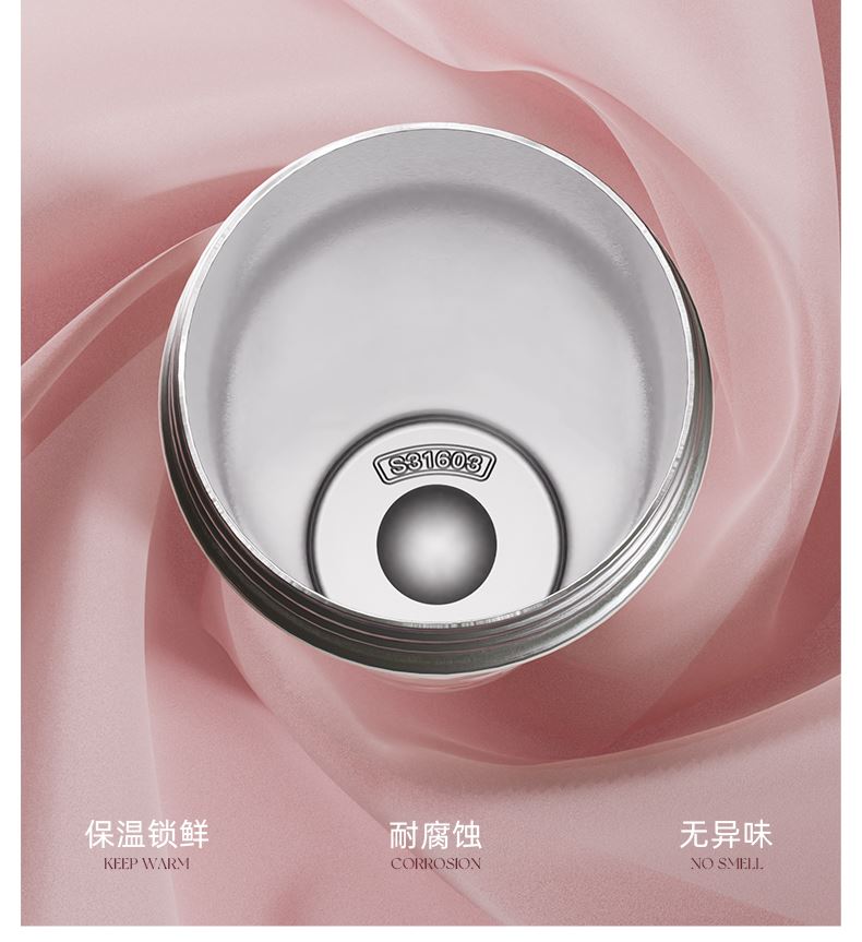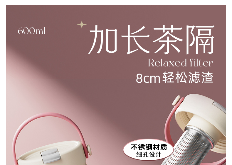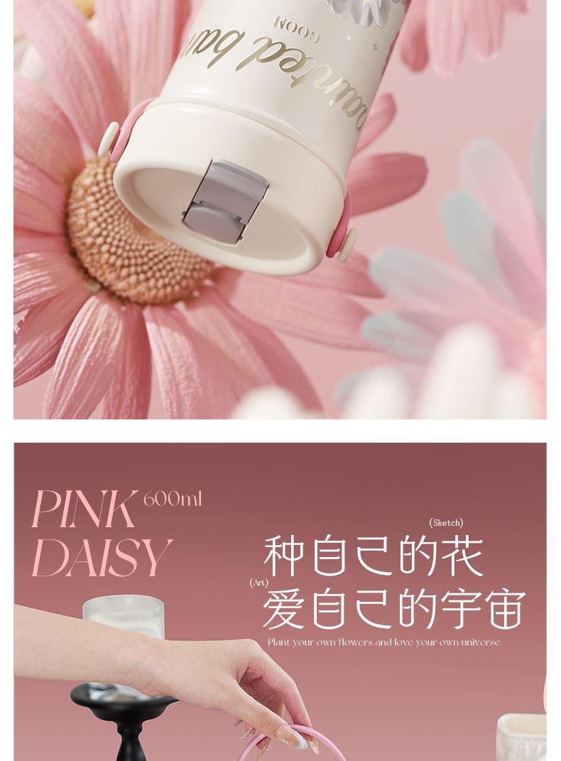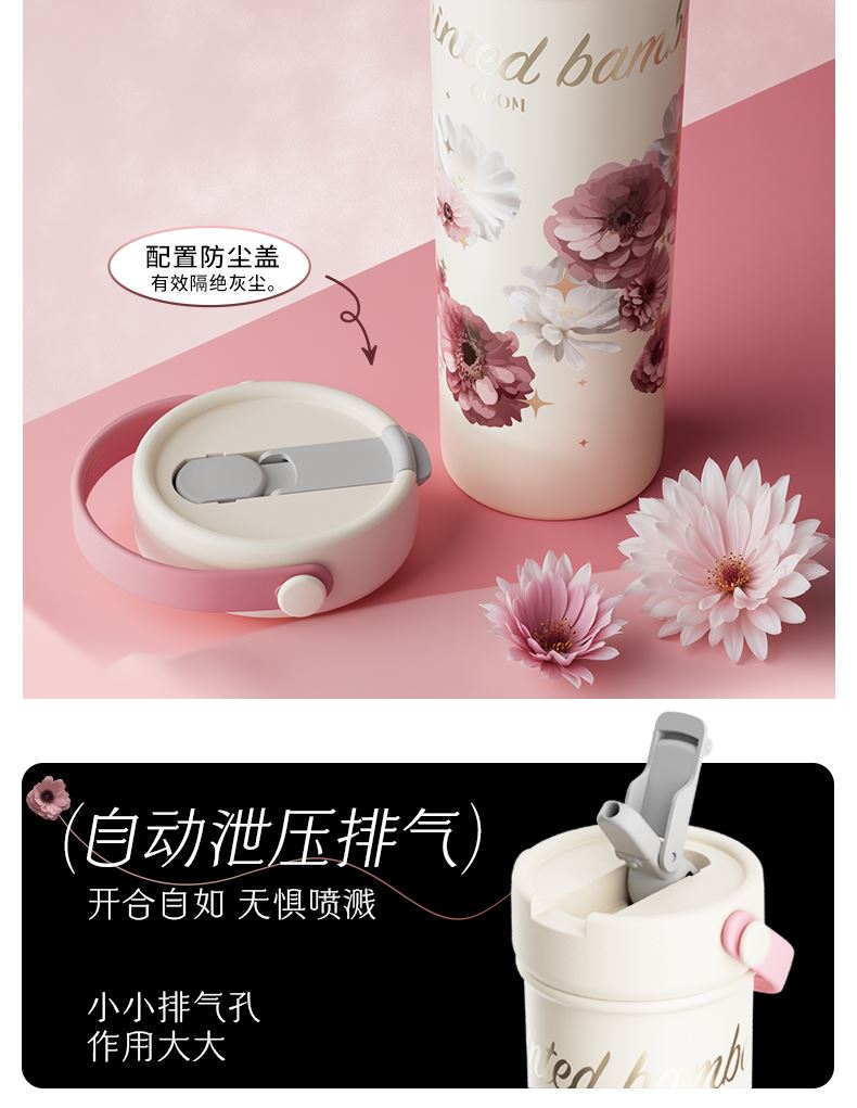 颜 色:玫瑰碎语/粉黛雏菊/空谷幽兰 材 质:内胆—奥氏体不锈钢S31603,外壳、茶漏—奥氏体不锈钢S30408,吸管—PP聚丙烯(丙烯均聚物),杯盖—PP聚丙烯(丙烯与乙烯的聚合物),密封件-硅橡胶,杯套—涤纶网络丝 容 量:600ml 单杯尺寸:101*219mm 1、一杯双饮:痛快敞口喝,精致吸管饮 2、密封防漏:360密封,丢进包里不漏水 3、加长茶隔:轻松过滤,可拆卸拿取,清洁更方便 4、安心材质:食品级316内胆、长效保冷保热 5、超大容量:大容量,满足外出喝水需求 6、便携随行:自带硅胶提手,出行更便捷