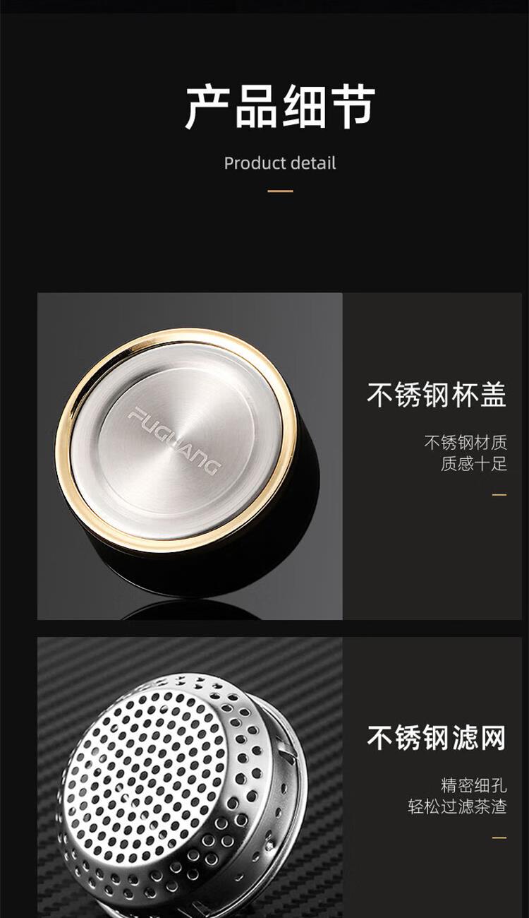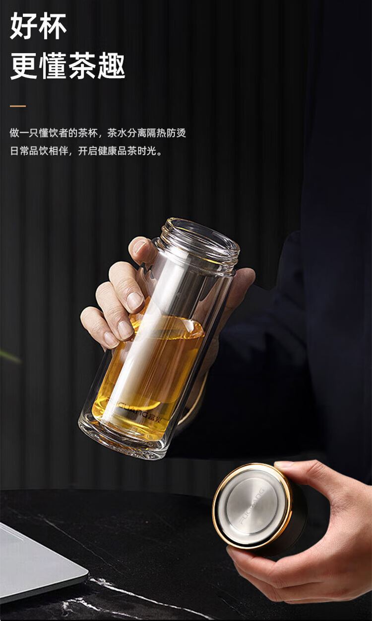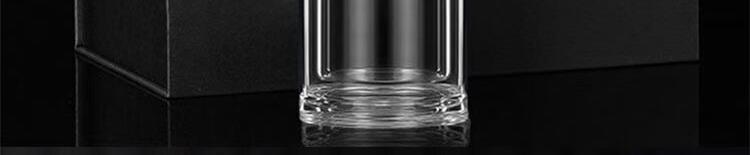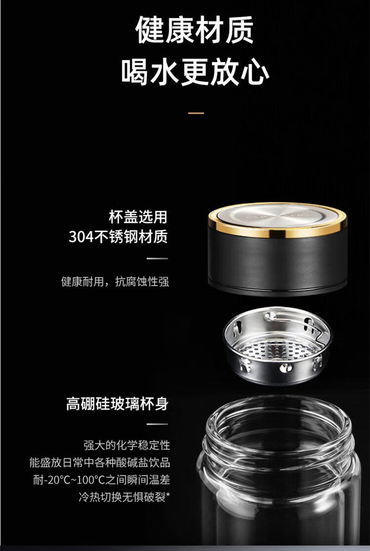 1.杯盖304不锈钢+磨砂手感工艺 2.杯体采用双层高硼硅玻璃 3.内置304食品级不锈钢滤网 4.杯盖密封圈:食品级硅胶圈(无异味) 5.一次成型加厚杯底 6.独立简盒包装.