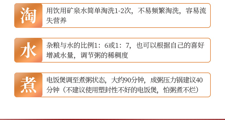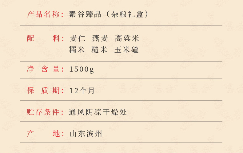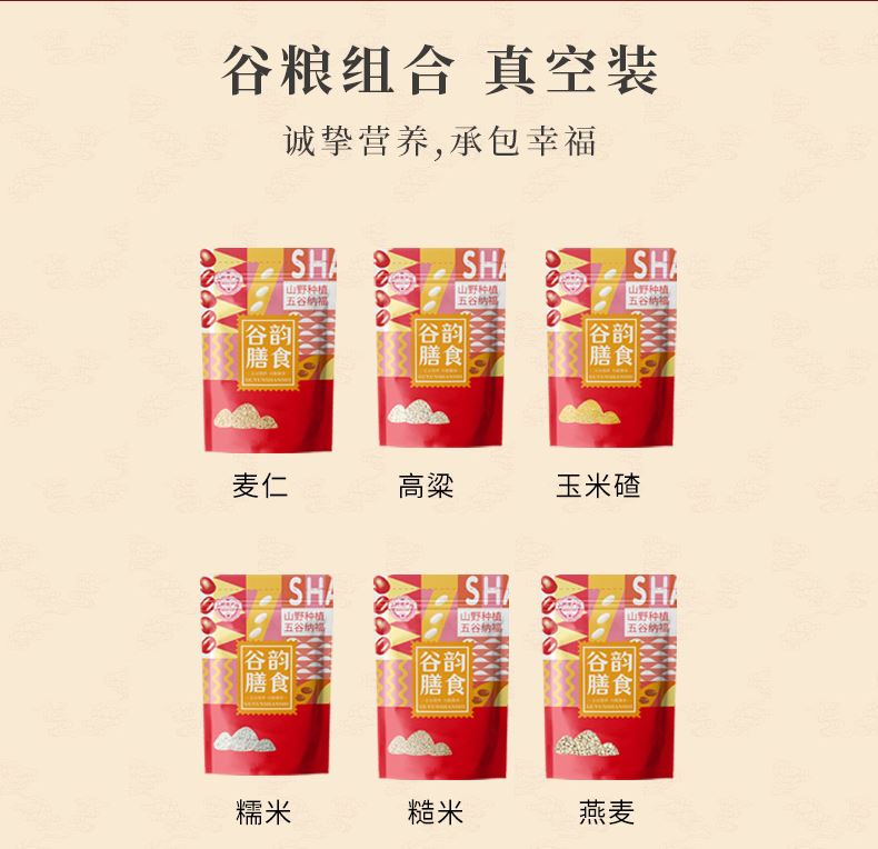 条码:6972761600529 规格:1.5kg,250g*6 配置:玉米碴\麦仁\糯米\糙米\高粱米\燕麦米 包装:真空套彩袋 盒尺寸:36*9.5*26 箱重量:22kg 箱尺寸:60*37.5*54 箱体积:0.122方