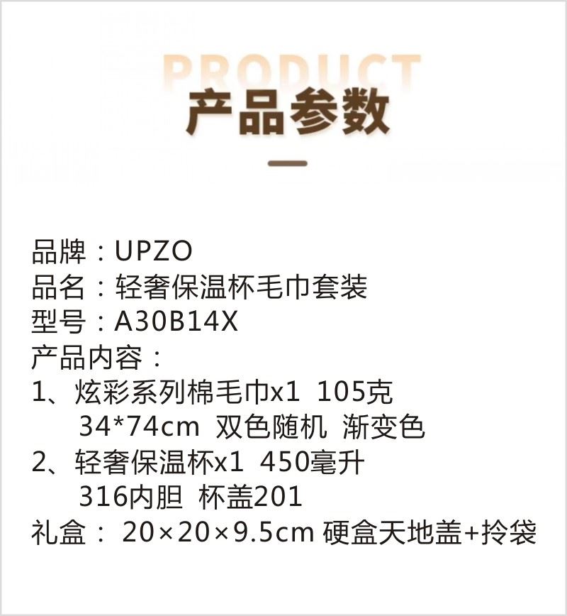 型号: A30B14X 产品内容 1、炫彩系列棉毛巾×1 (双色随机 渐变色) 规格: 34CM*74CM (105g每条) 2、轻奢保温壶×1 450毫升容量 内胆316 杯盖201 礼盒: 20×20×9.5cm 硬盒天地盖+拎袋 轻奢保温杯 带杯盖设计 450毫升容量 316内胆 炫彩系列毛巾精选精梳棉材质结合色织工艺 优质且靓丽