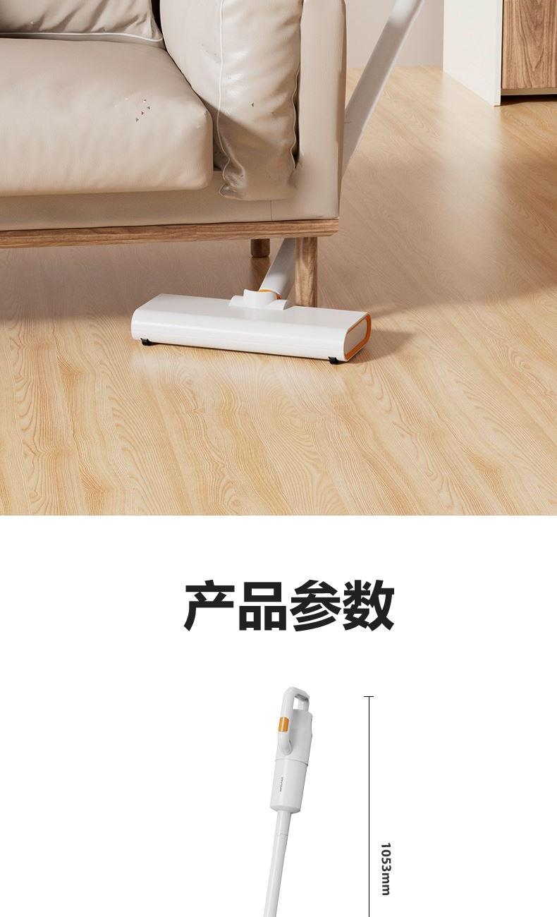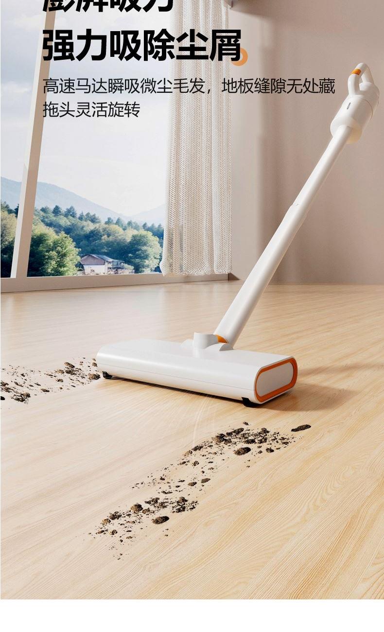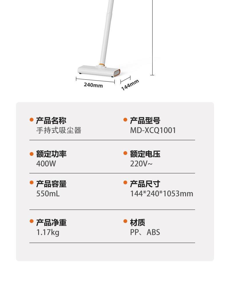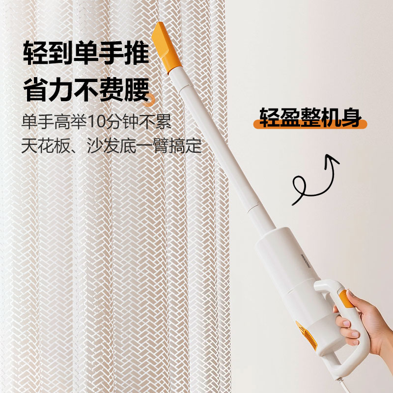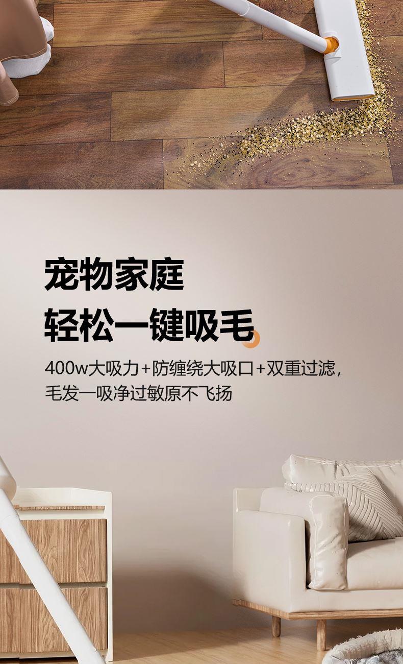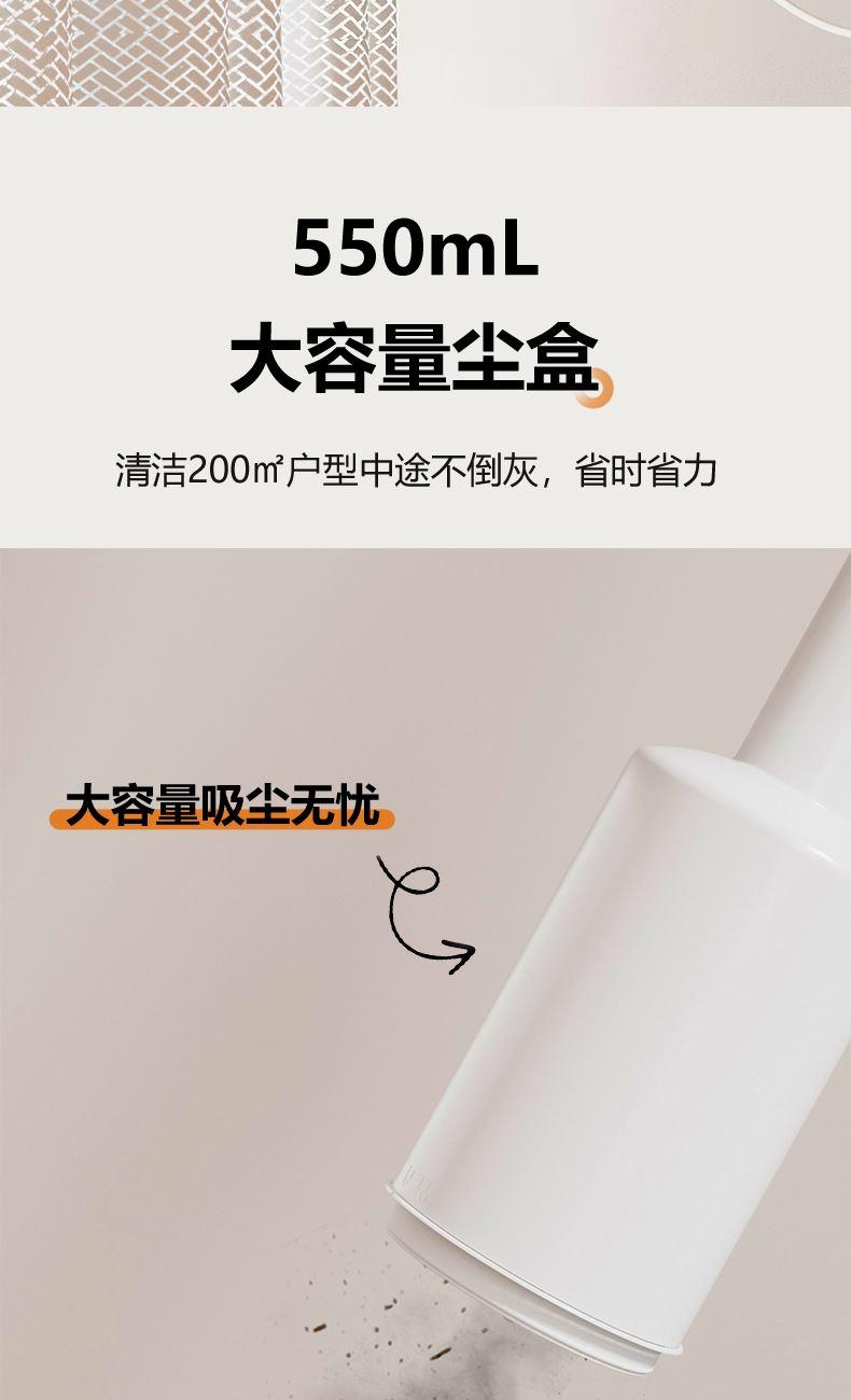 产品净重:1.2KG 产品毛重:1.5KG 额定功率:400W 额定电压:220V~ 容量:550mL 内含:主机x1、扁吸x1、说明书 1.高速运转系统,带来澎湃大吸力; 2.不弯腰,不费力,让打扫变得轻松简单; 3.配置手持扁吸,一机多用,搞定全屋清洁; 4.轻量化主机,单手省力清洁高处,可手持到细微地方 5.纤薄可旋转地刷,探底吸尘不再大动干戈; 6.直入大吸口,不缠毛发,全地面适用;