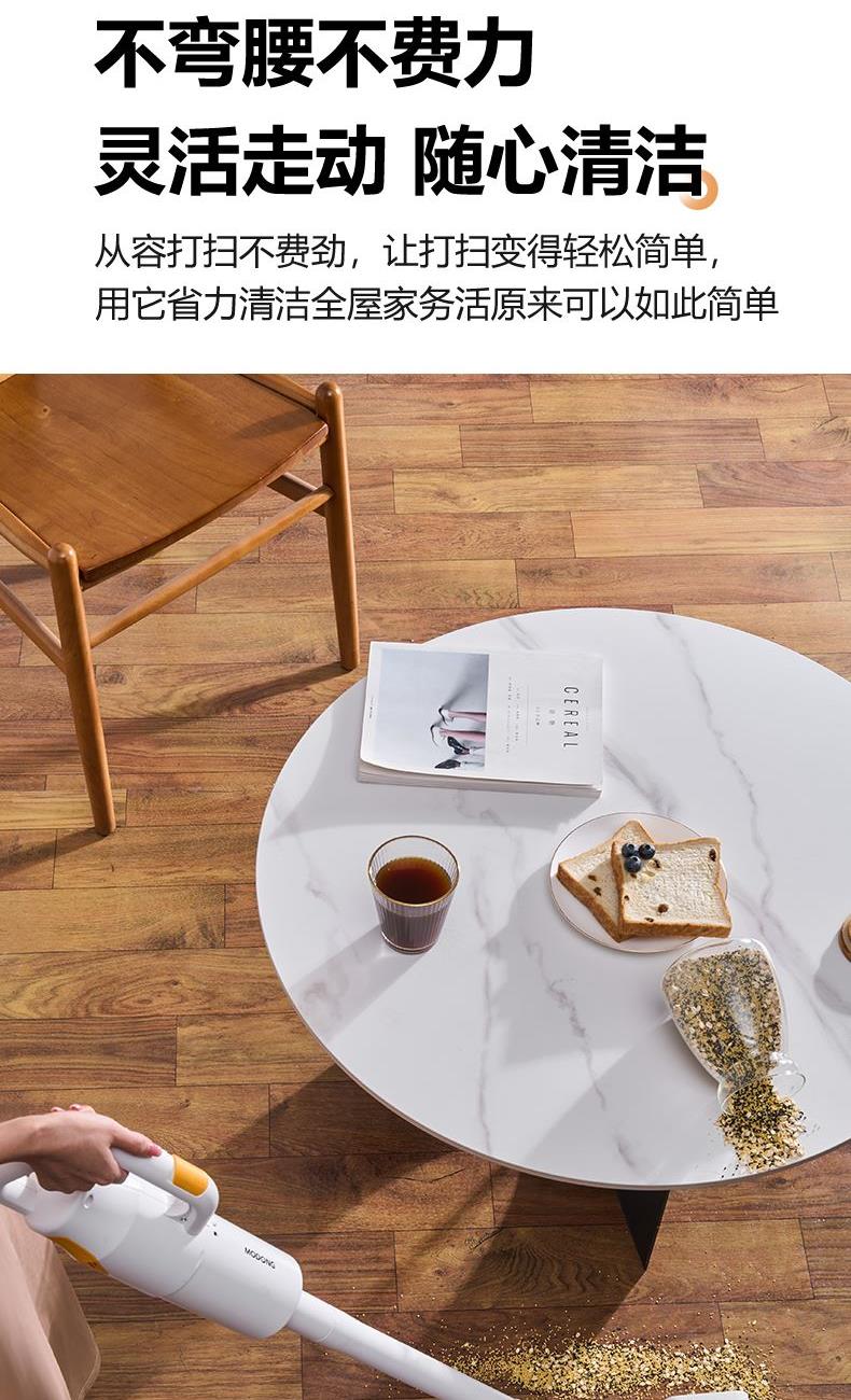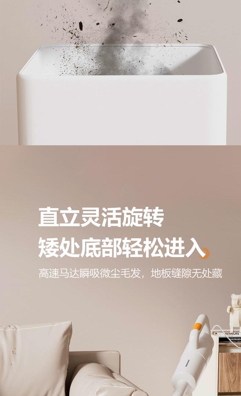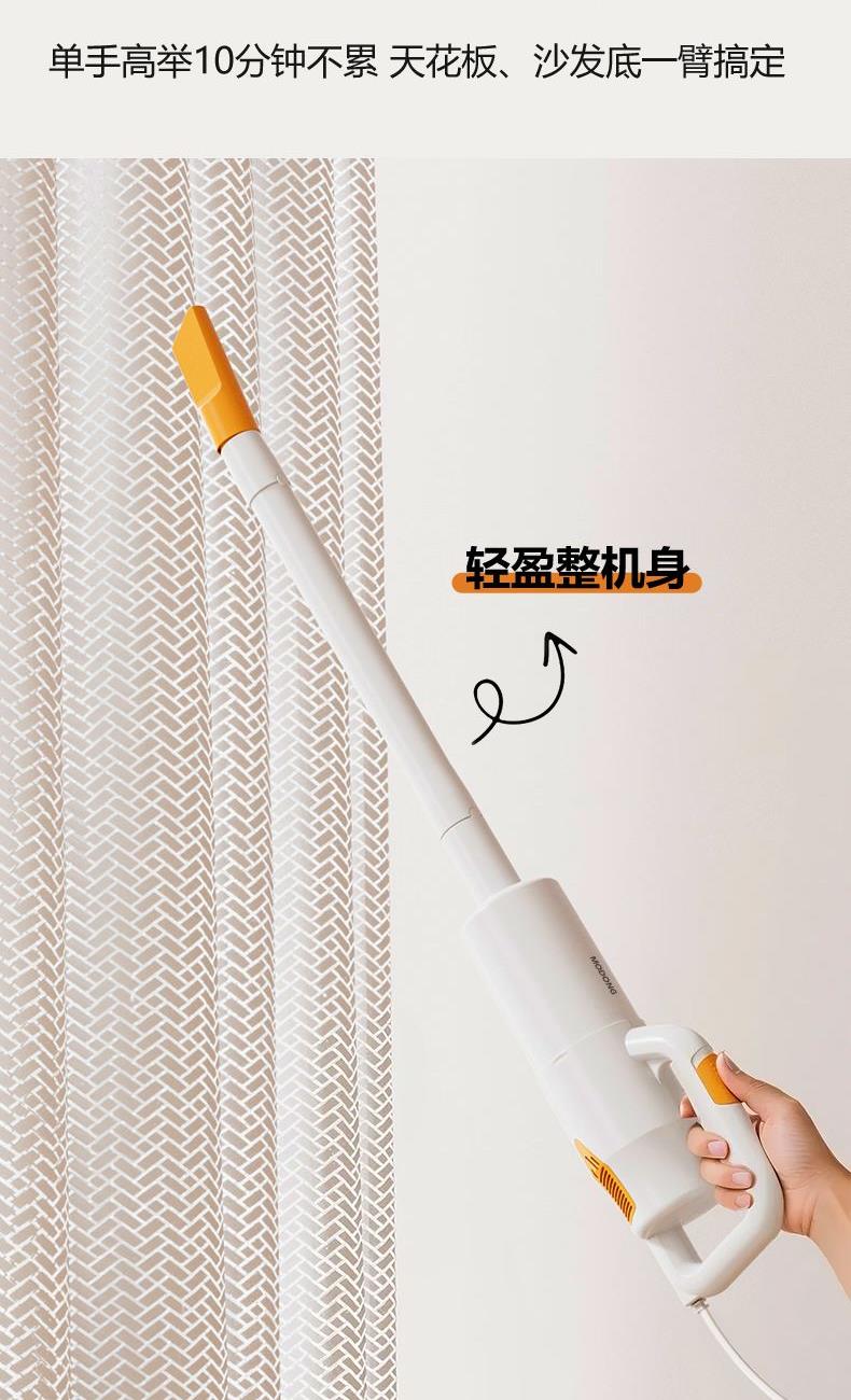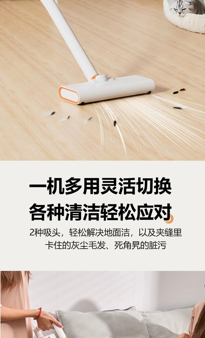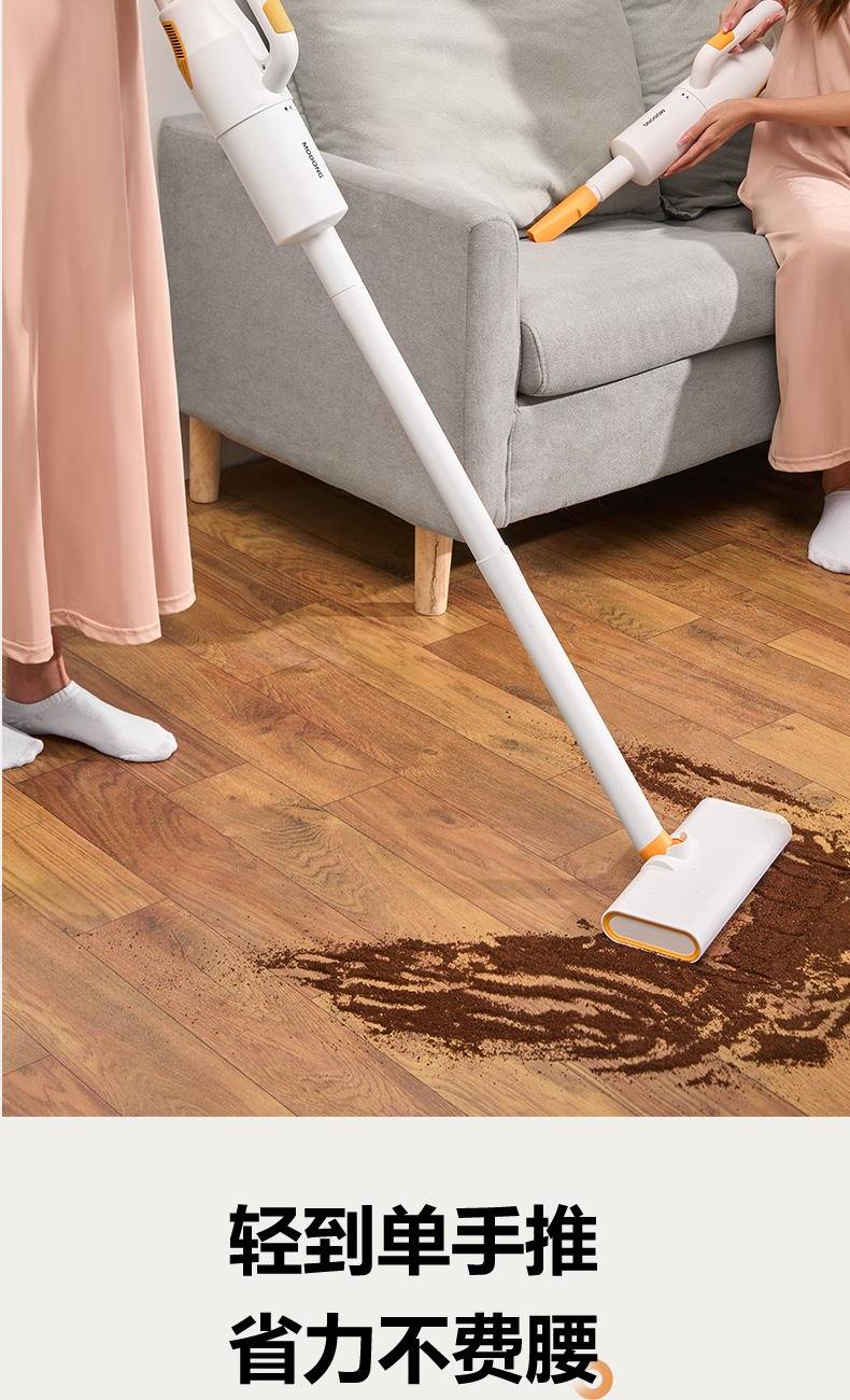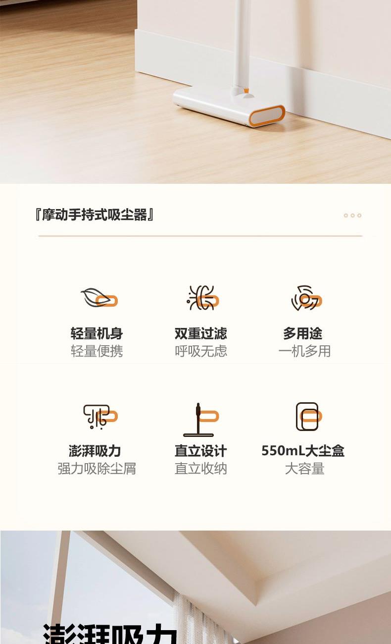 产品净重:1.2KG 产品毛重:1.5KG 额定功率:400W 额定电压:220V~ 容量:550mL 内含:主机x1、扁吸x1、说明书 1.高速运转系统,带来澎湃大吸力; 2.不弯腰,不费力,让打扫变得轻松简单; 3.配置手持扁吸,一机多用,搞定全屋清洁; 4.轻量化主机,单手省力清洁高处,可手持到细微地方 5.纤薄可旋转地刷,探底吸尘不再大动干戈; 6.直入大吸口,不缠毛发,全地面适用;