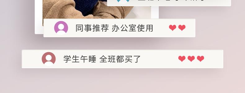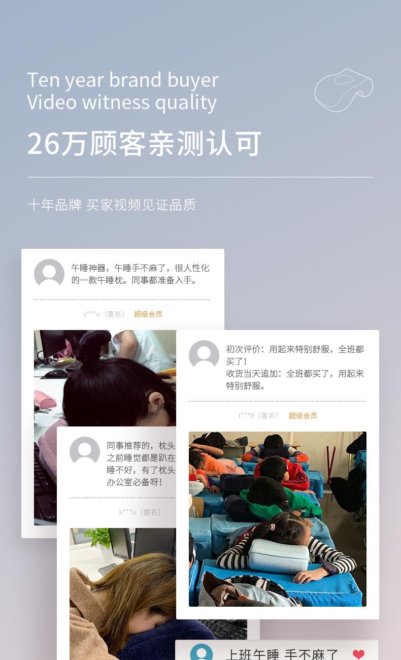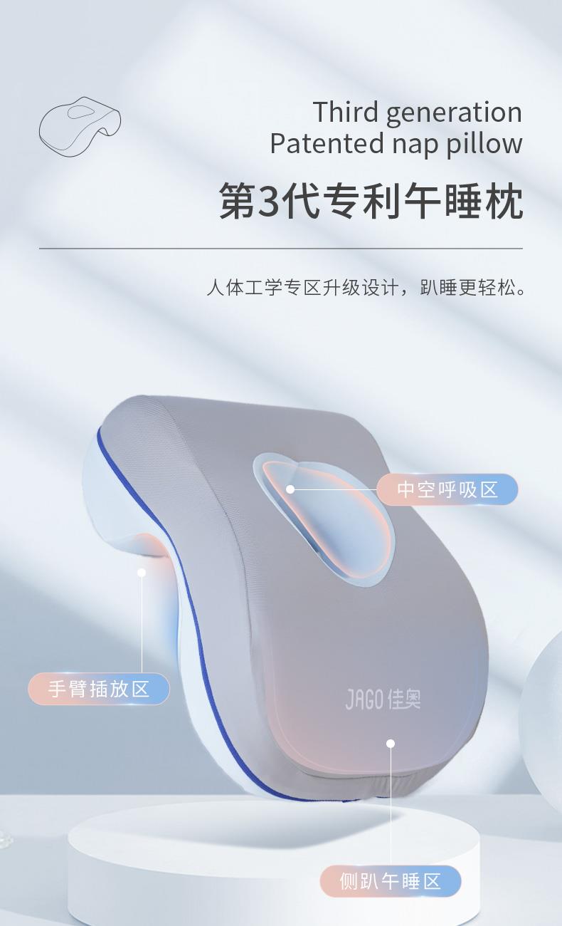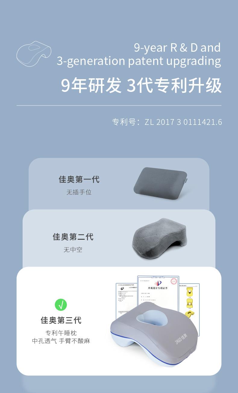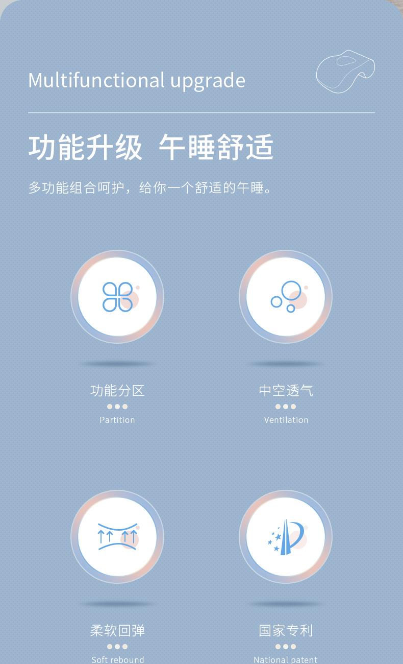午睡枕:1. L型挖空,手臂不麻; 2.加大中空,呼吸顺畅; 3..加高坡面,脖子不酸; 护理坐垫:1.加大中空设计,避免疼痛区域与座椅直接接触 2.前端双凹槽设计,贴合大腿型; 3.人体工学设计,曲面支撑,分散臀部受压面积;