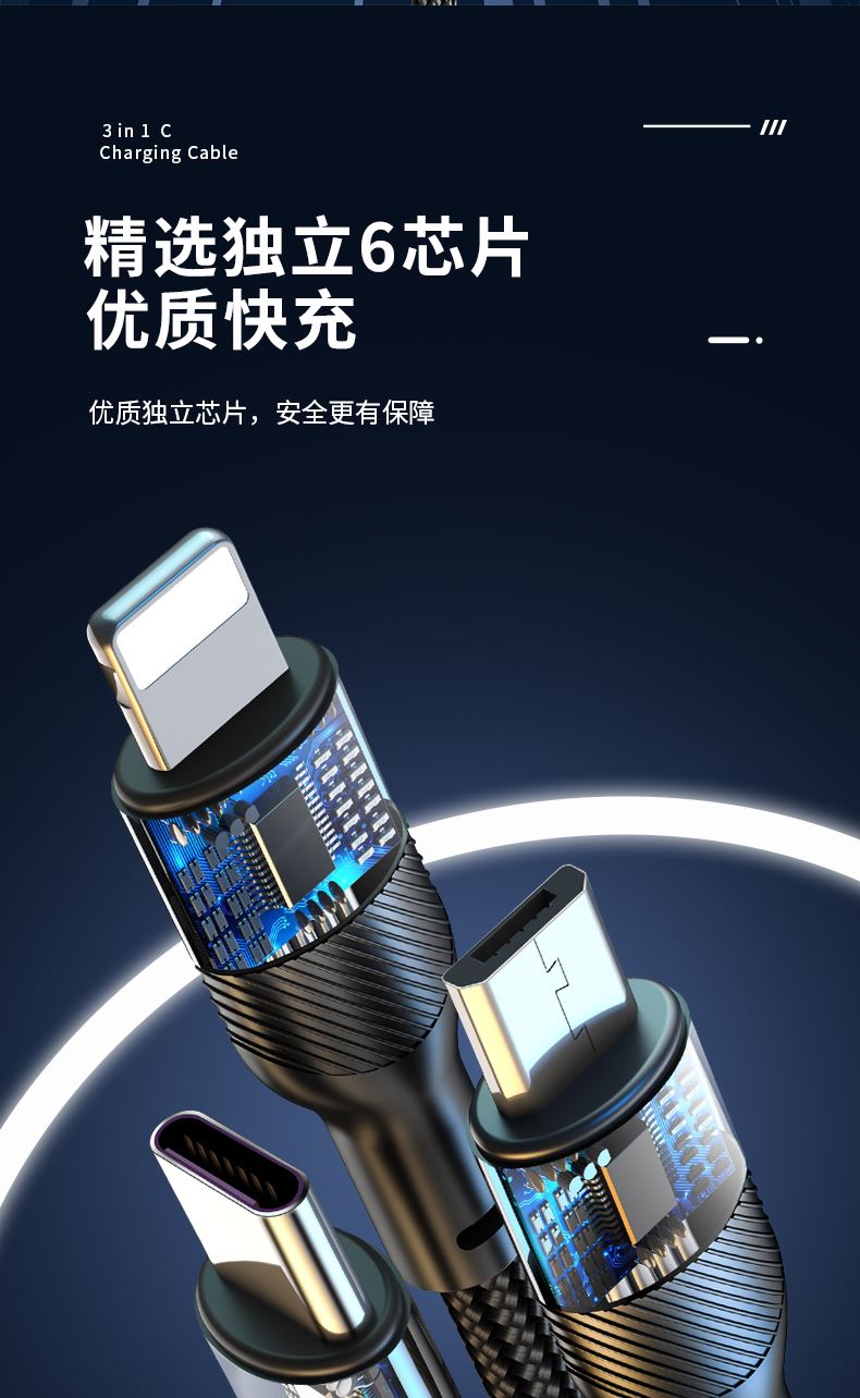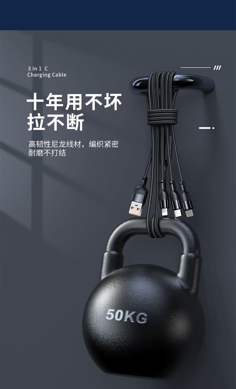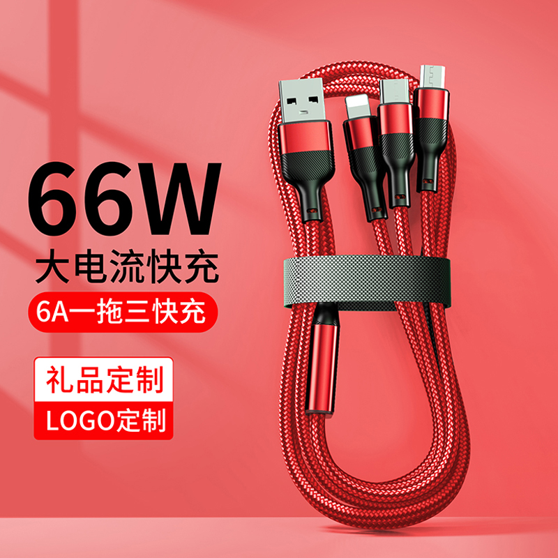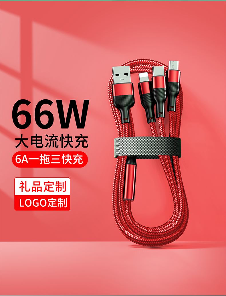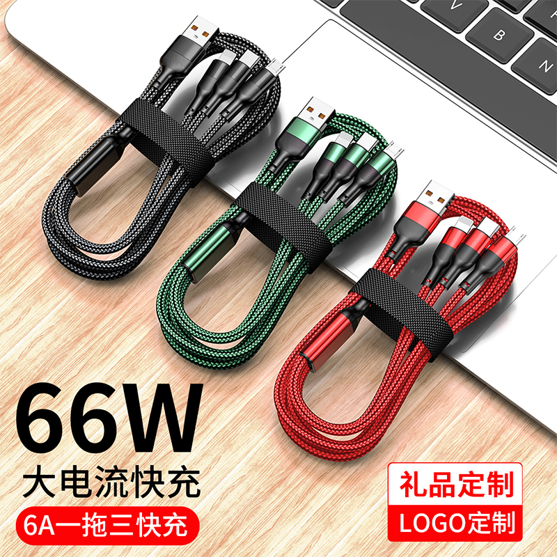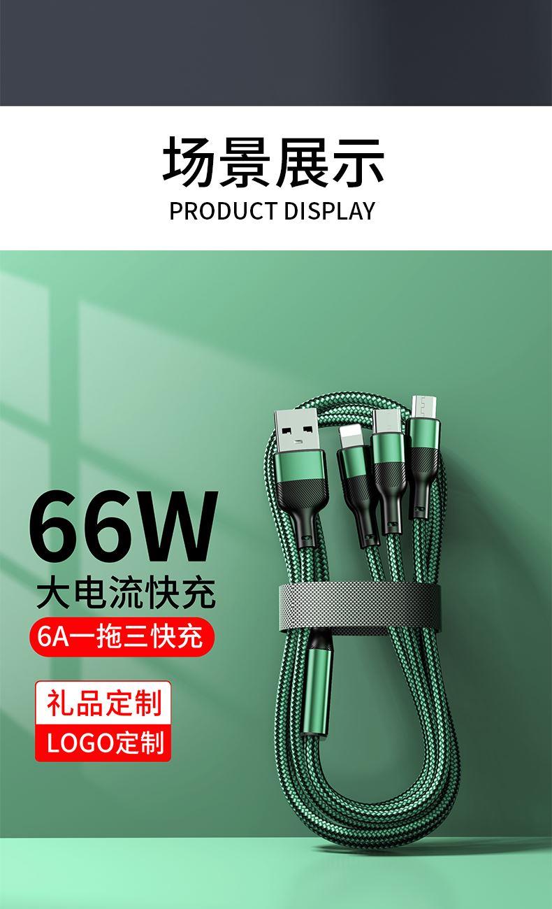 颜色:红色 绿色 黑色 材质:编织线 尺寸:1.2M 包装:彩盒包装 【功能特点】: 66W超级快充,充电更快 加粗编织线,一体成型充电头 三种接口满足各种手机 1.2米长度设计,使用方便 编织线耐磨耐用,不易折断