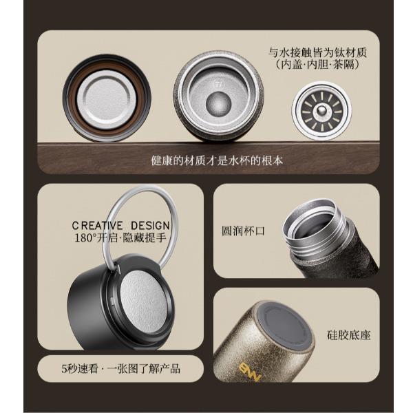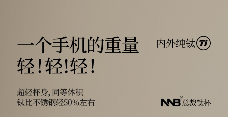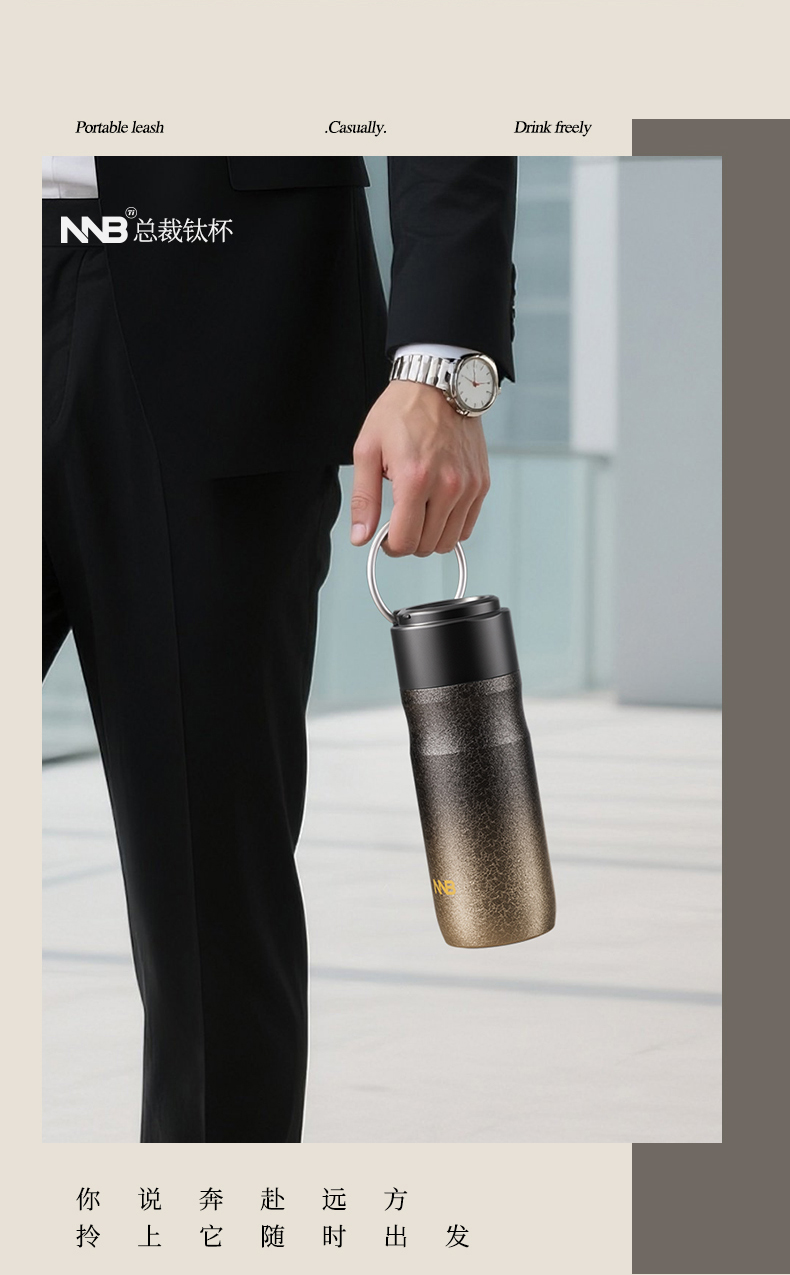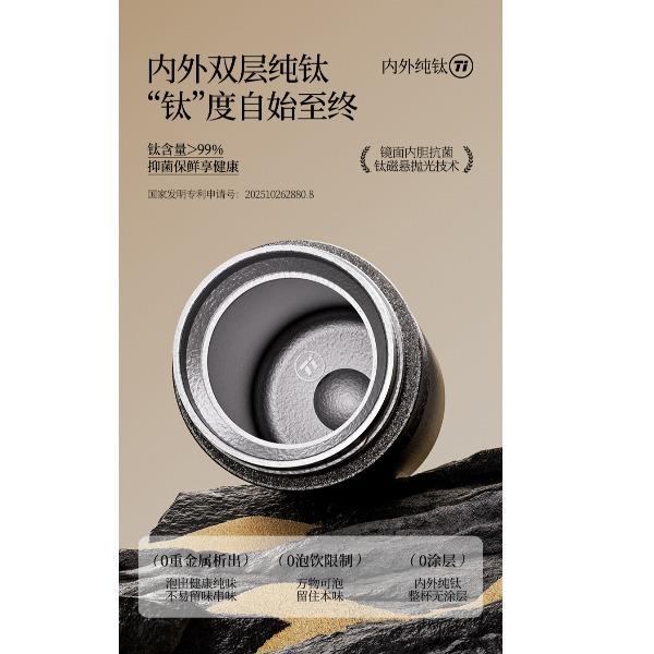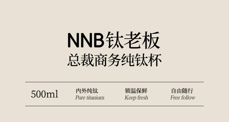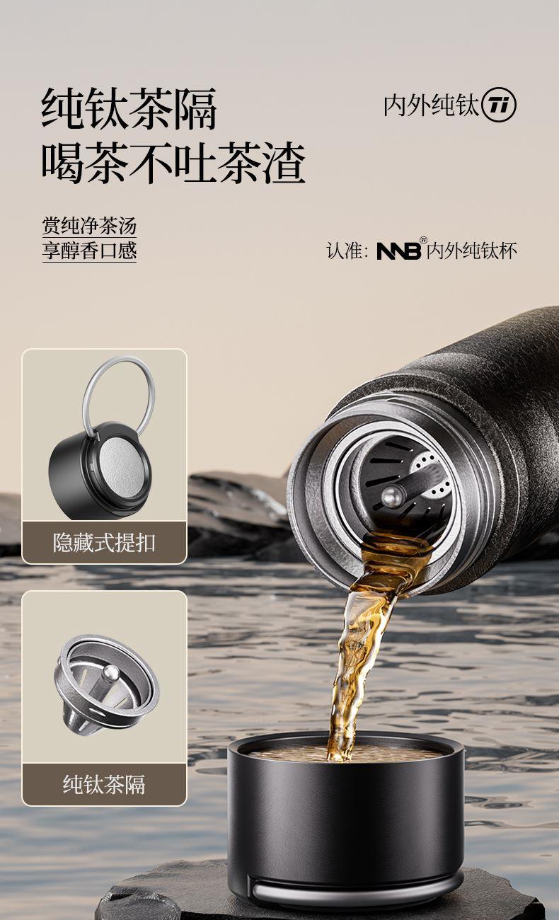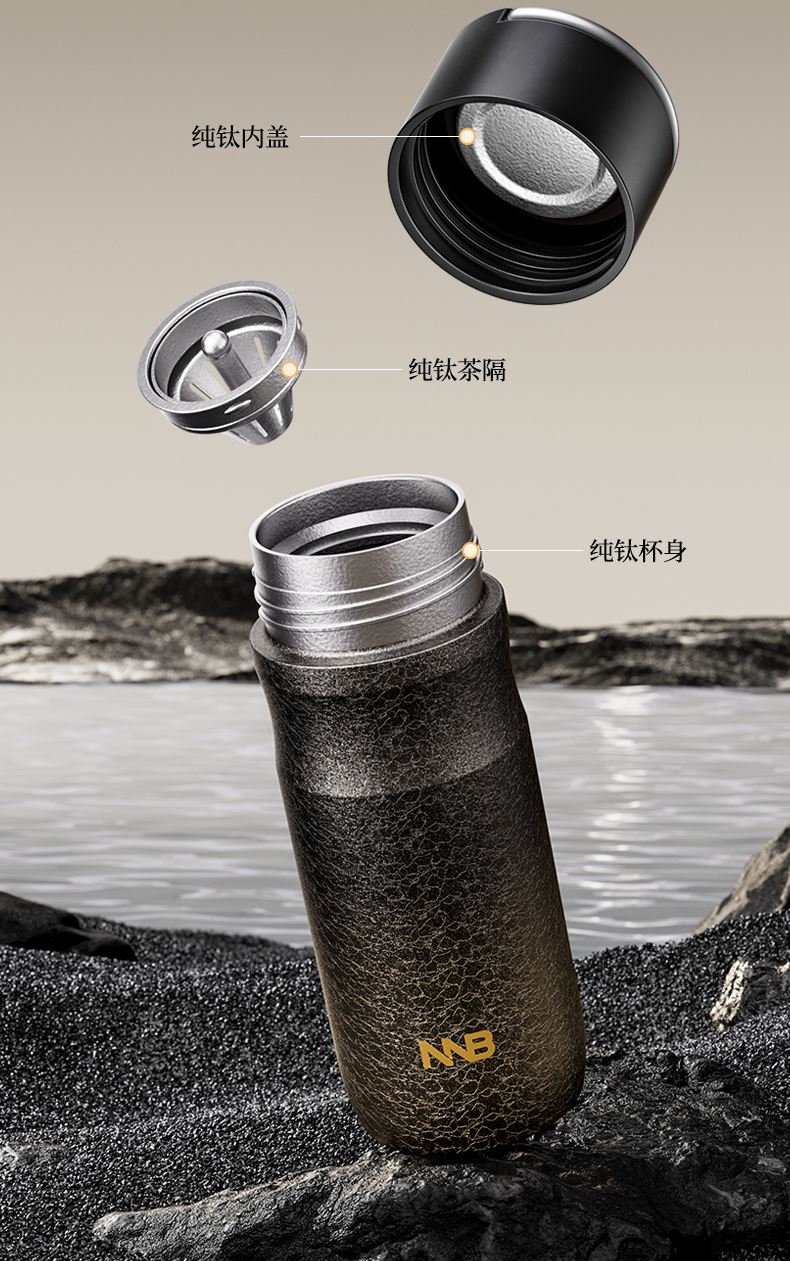 产品规格: 品 牌:NNB/牛牛杯 容 量:500ml 尺 寸:6.4*7.1*19.8cm 内 胆:纯钛(TA1) 外 壳:纯钛(TA1) 杯 盖:PP聚丙烯 密封图:硅橡胶 包 装:彩盒/礼盒 产品特点: ✅ 99.5%高纯度钛材,耐酸碱抗腐蚀 ✅ 双层真空锁温技术,6-8h保温锁冷 ✅ 钛磁悬镜面抛光技术 ✅ 执行标准:QB/T 5612-2021《钛杯》