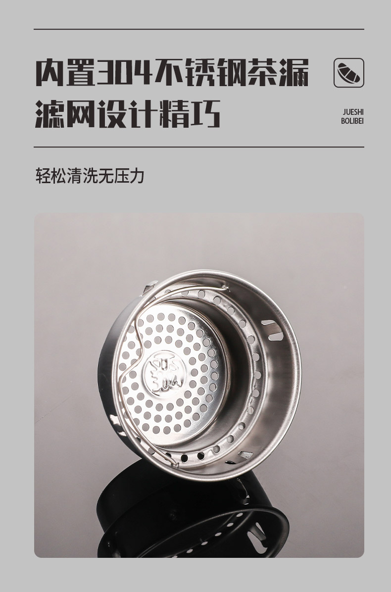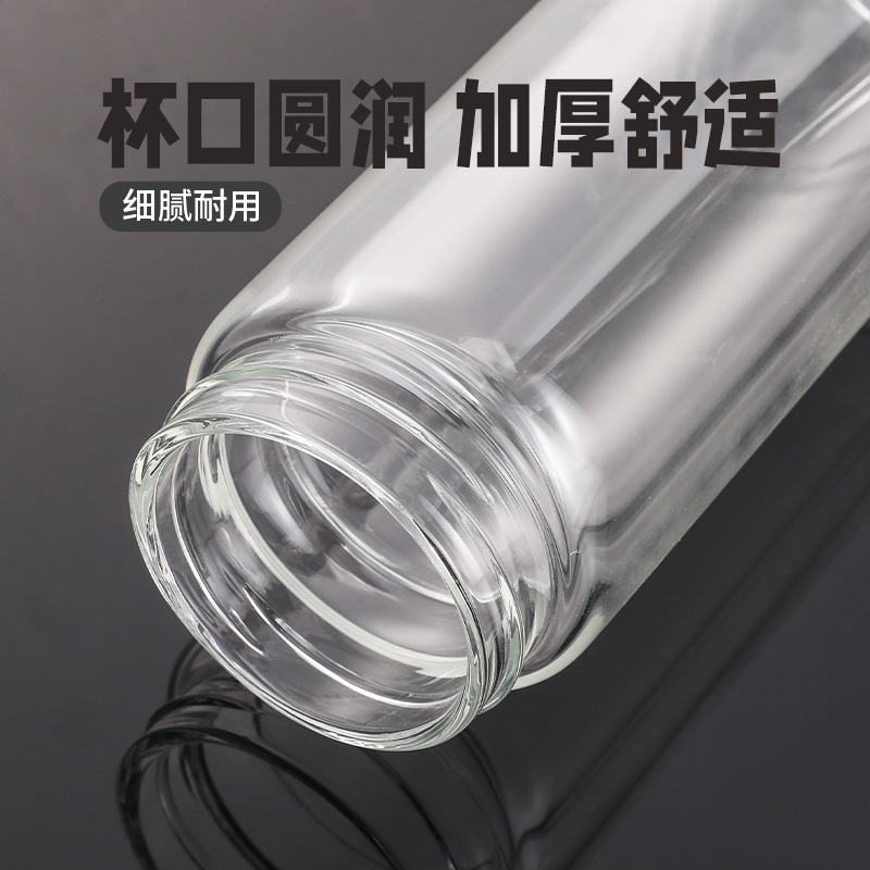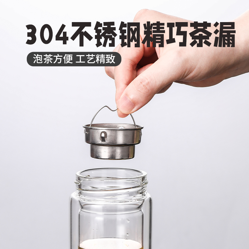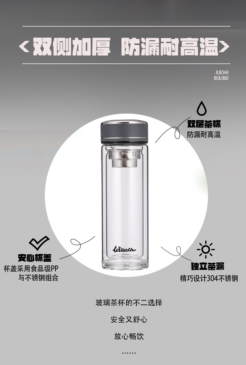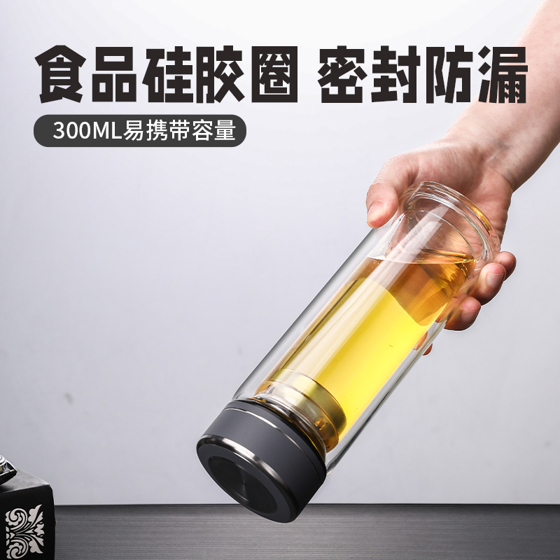 材 质:高硼硅玻璃 容 量:300ml 彩盒尺寸:6.9*6.9*20.5cm 1. 杯身采用双层高硼硅玻璃,有效隔热防烫; 2. 304不锈钢茶漏,有效阻隔茶渣入口; 3. 杯盖密封性良好无滴漏; 4. 杯口圆润光滑,触感温润舒适; 5. 底座坚固耐磨,有效保护杯体。