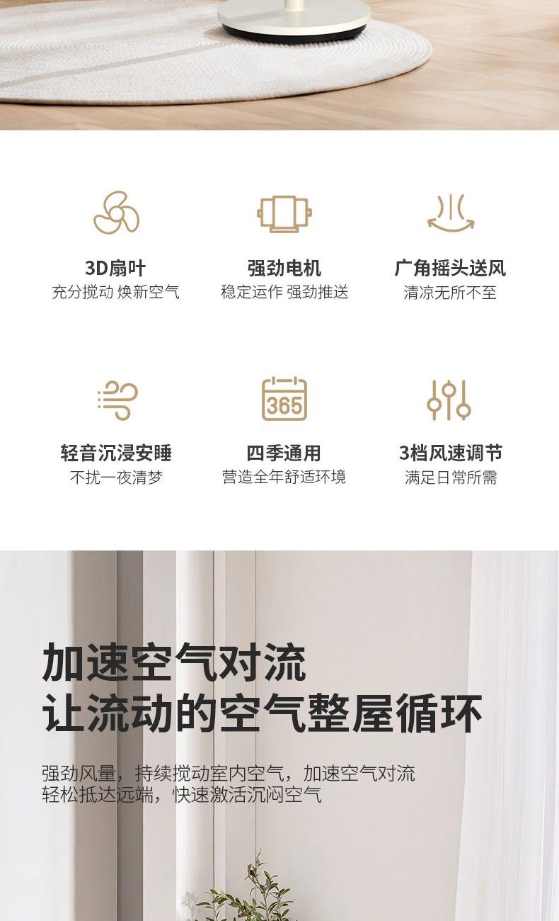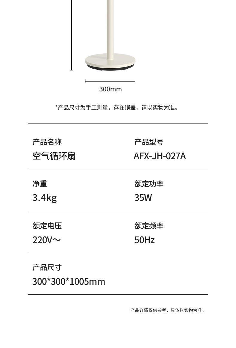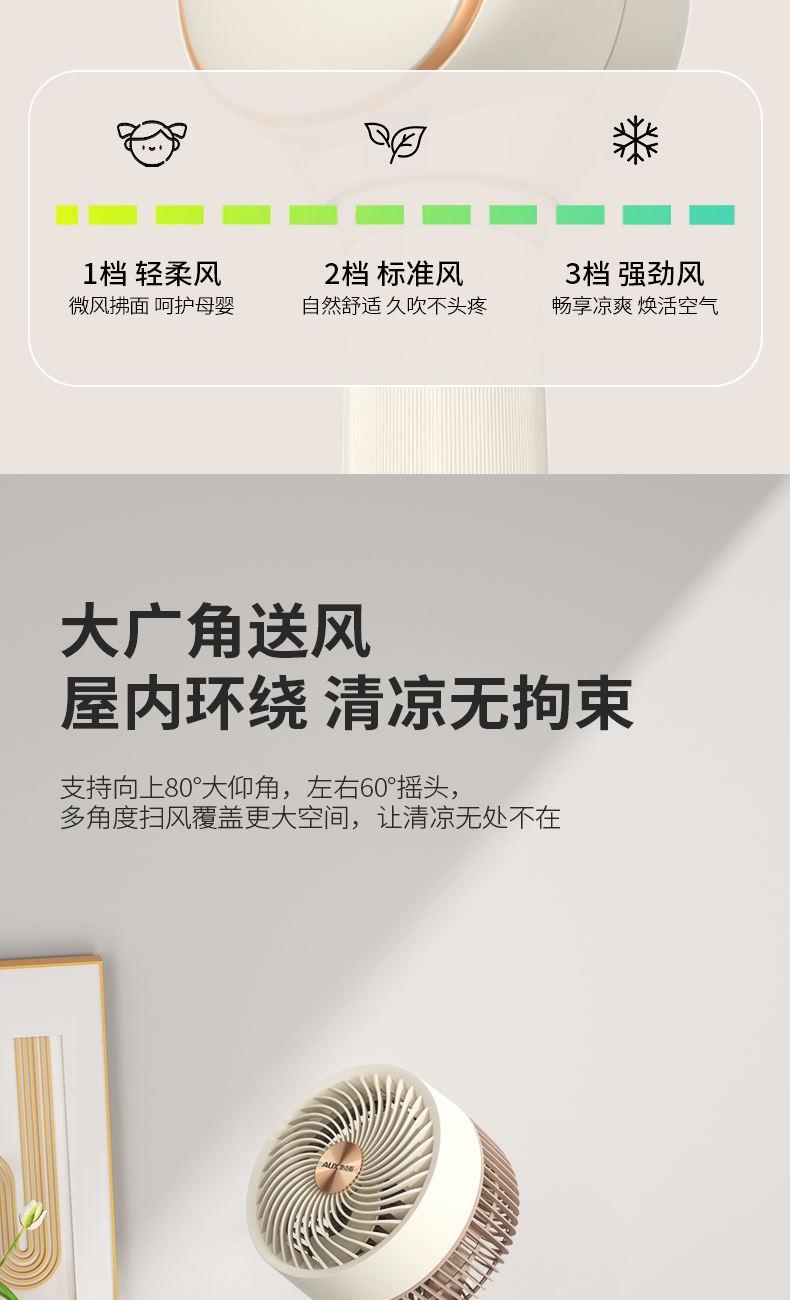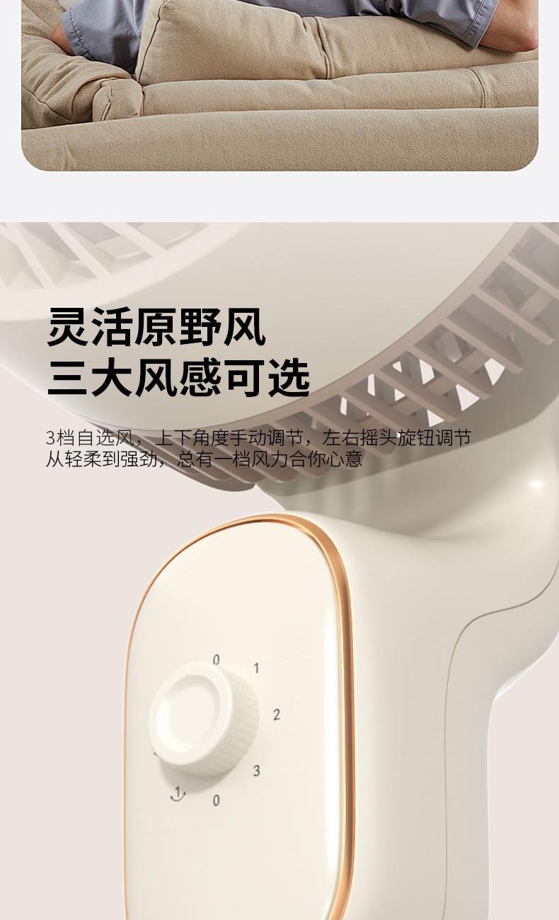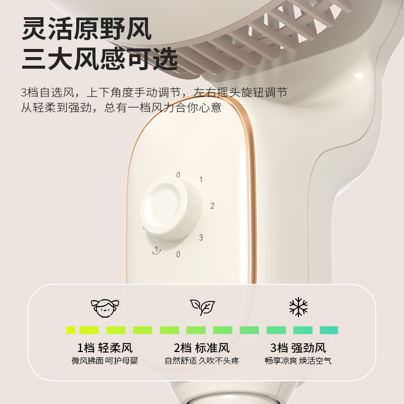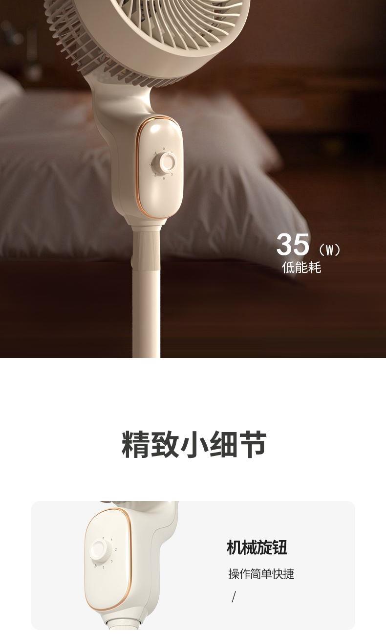 额定电压:220V~ 额定功率:35W 额定频率:50Hz 电源线长:150cm 材 质:前网、后网、风叶、底座:PP,立柱管:ABS > 3档风速调节,机械旋钮,操作简单 > 柔风低噪,节能省电 > 隐藏式提手,方便提拿 > 台立两用,上下左右摇头 > 贴心设计香薰盒,可放置防蚊虫香薰,驱赶蚊虫