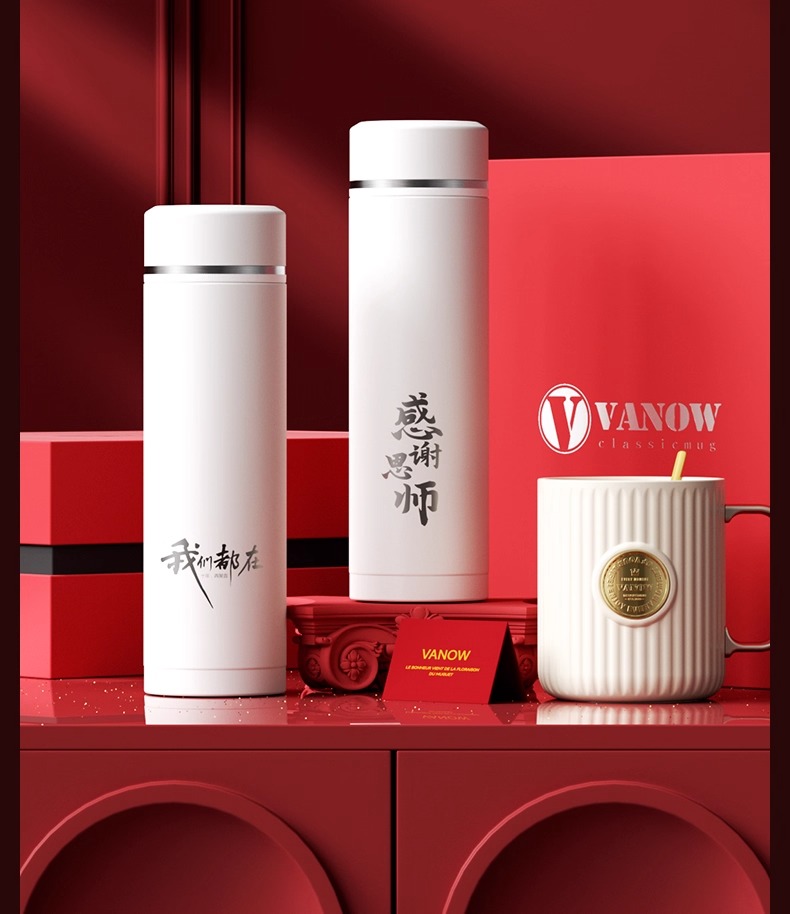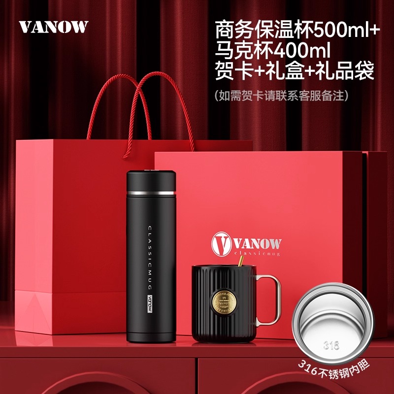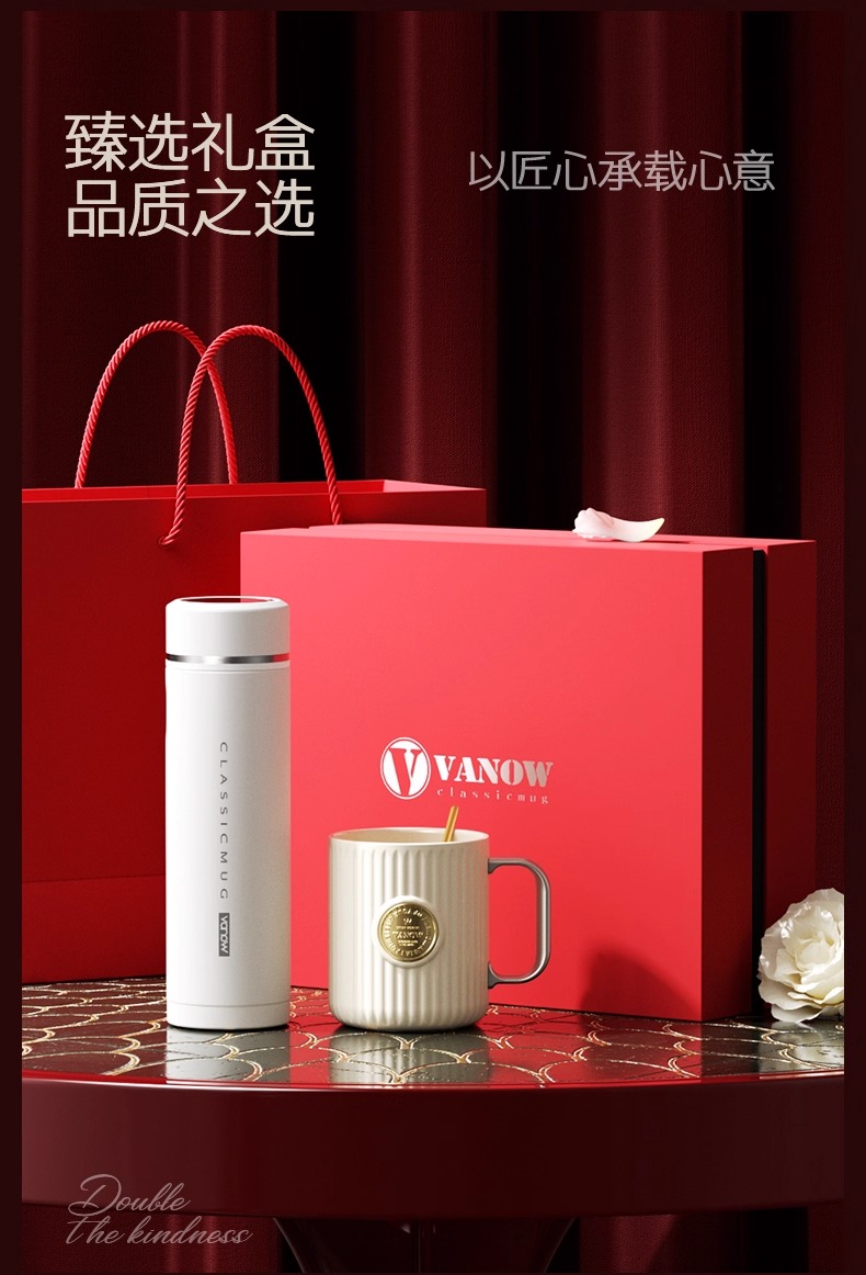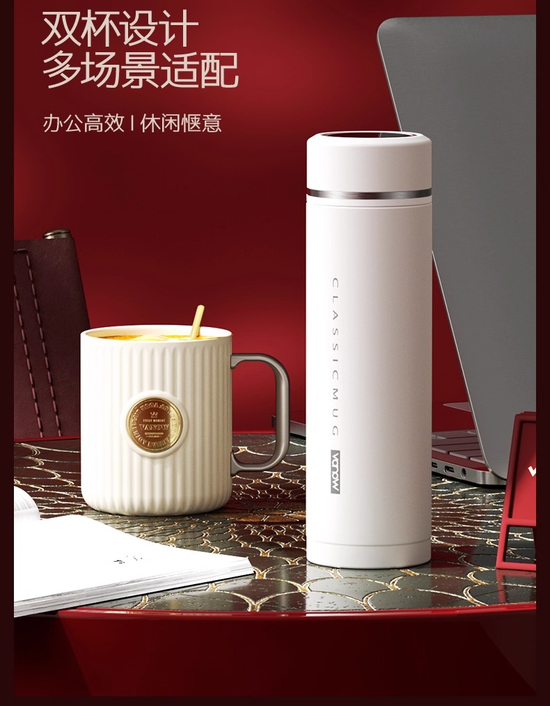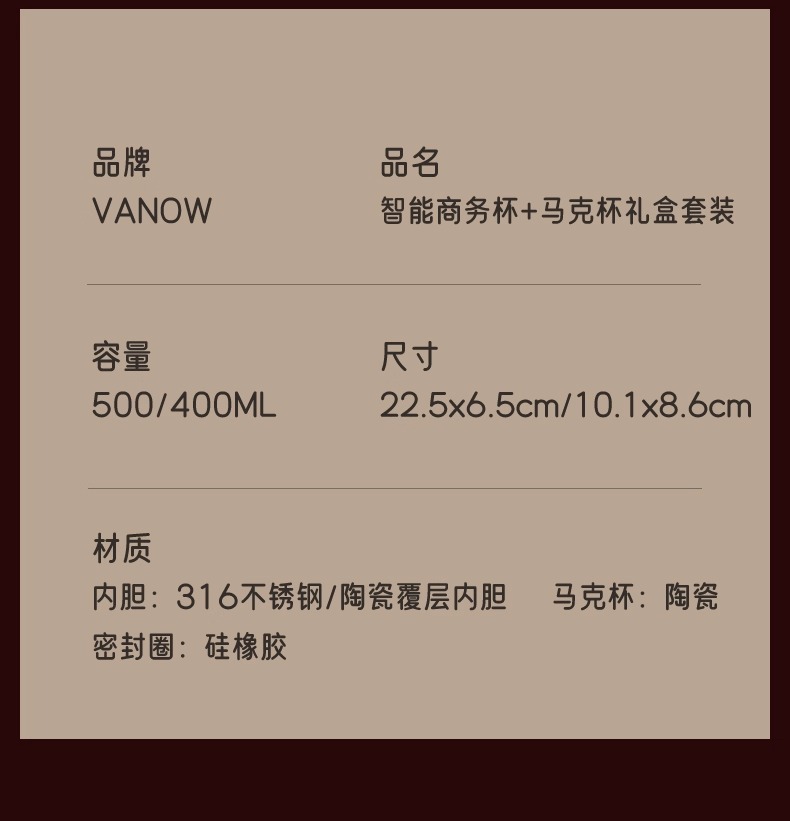 型号:VO-03TZ、VO-03TZ-C 颜色:素雅白,绅士黑 容量:500ml/400ml 尺寸:225*65mm/101*86mm 材质:316不锈钢内胆/陶瓷覆层内胆,陶瓷马克杯,硅橡胶