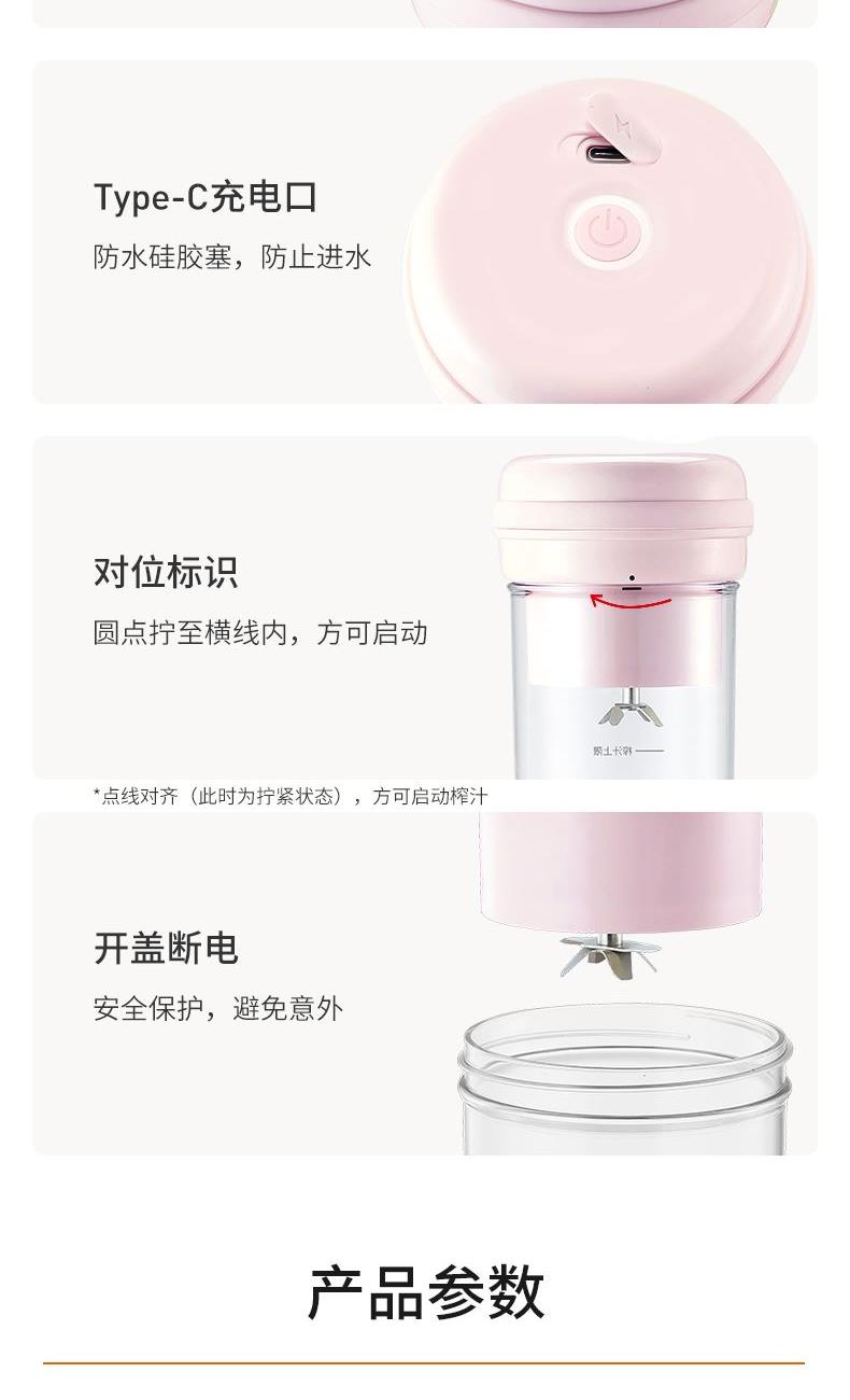 参数: 容量:250ml 功率:35W 搅拌杯材质: 食品级ABS 毛重:(彩盒)0.4Kg 内包尺寸:95×95×215mm 25台/箱 功能特点:小巧机身,便携随行; 内置1500mAh锂电池; tritan杯体,不含双酚A; 250毫升mini容量