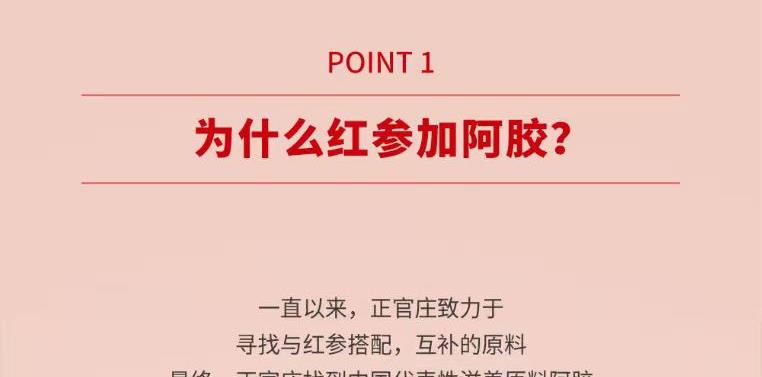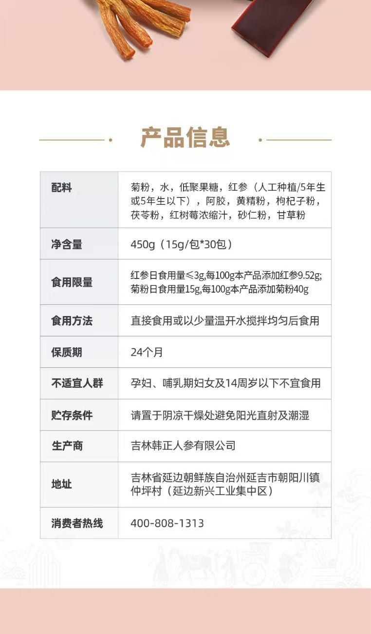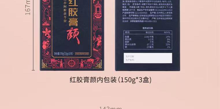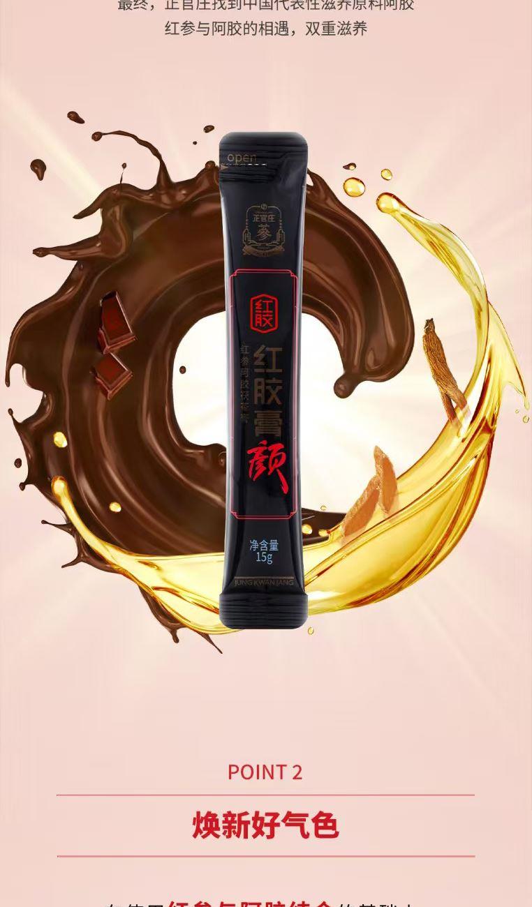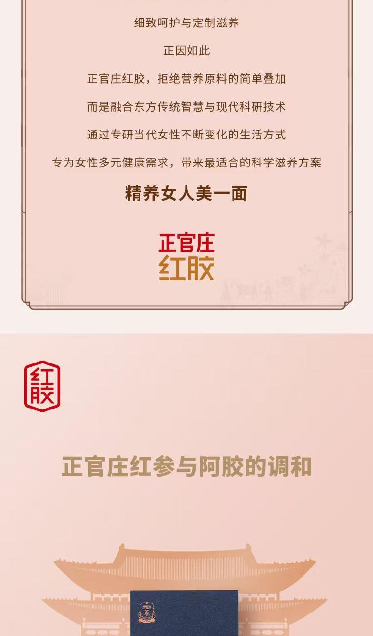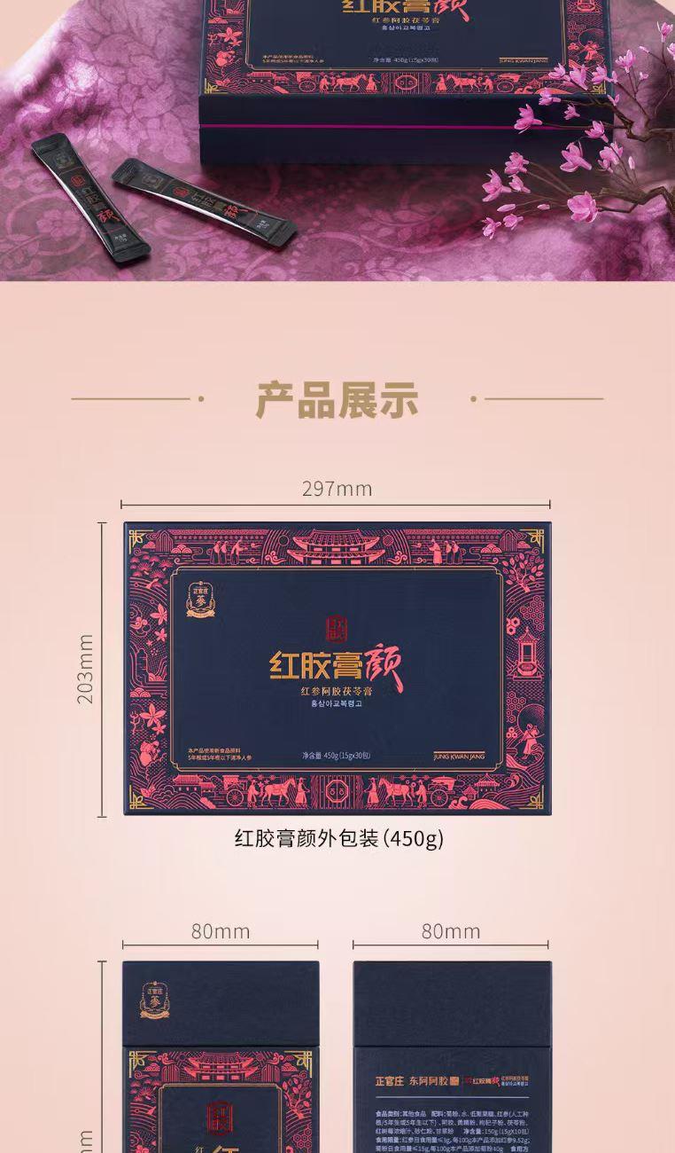 【规格】:450g/盒(15g*30包) 【保质期】:24个月 【产品尺寸】:300*57*205mm 【整箱尺寸】:430*320*350mm 【食用方法】:每日1次,每次1包。 正官庄红参与东阿阿胶的调和,以红参与阿胶建立身 体平衡。添加对女性有益的砂仁、甘草、茯苓,使气色 更加红润。