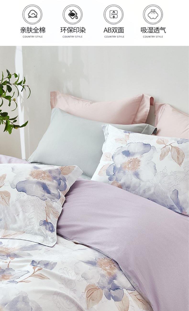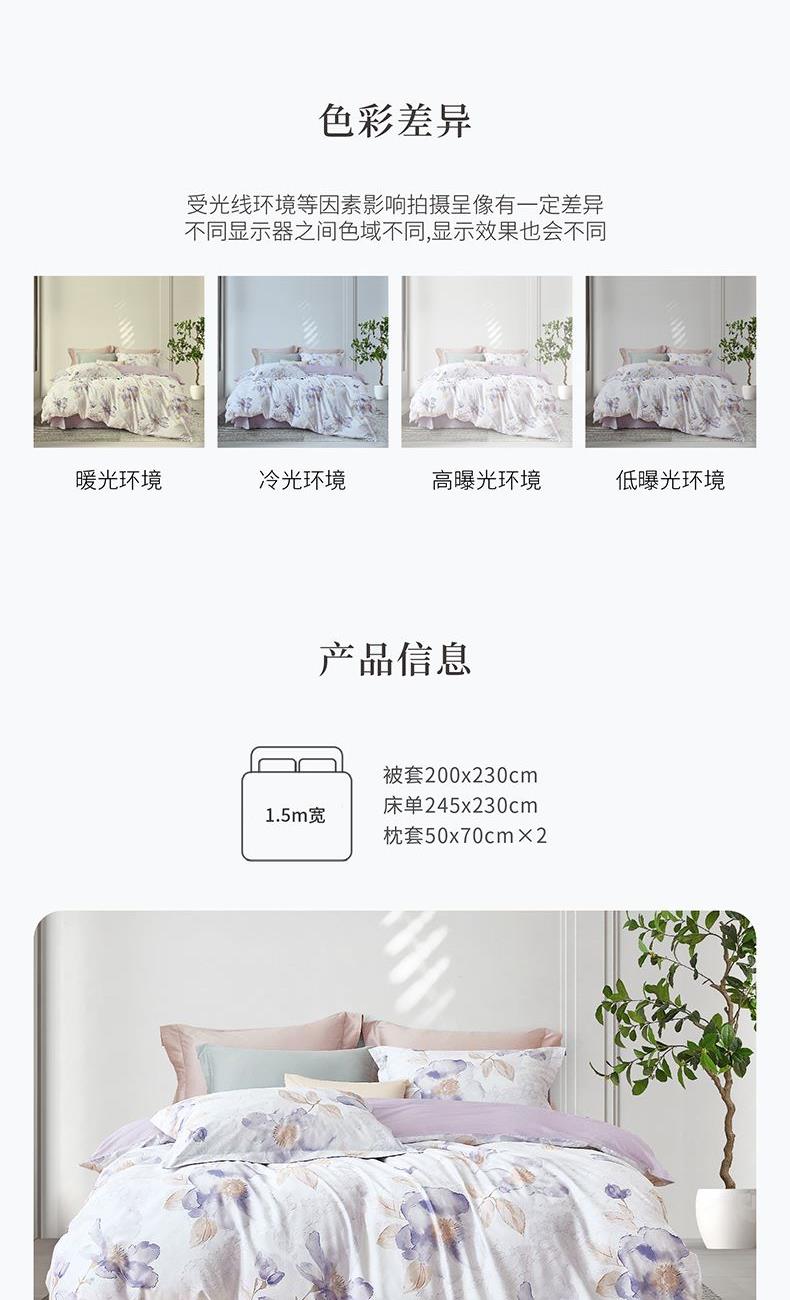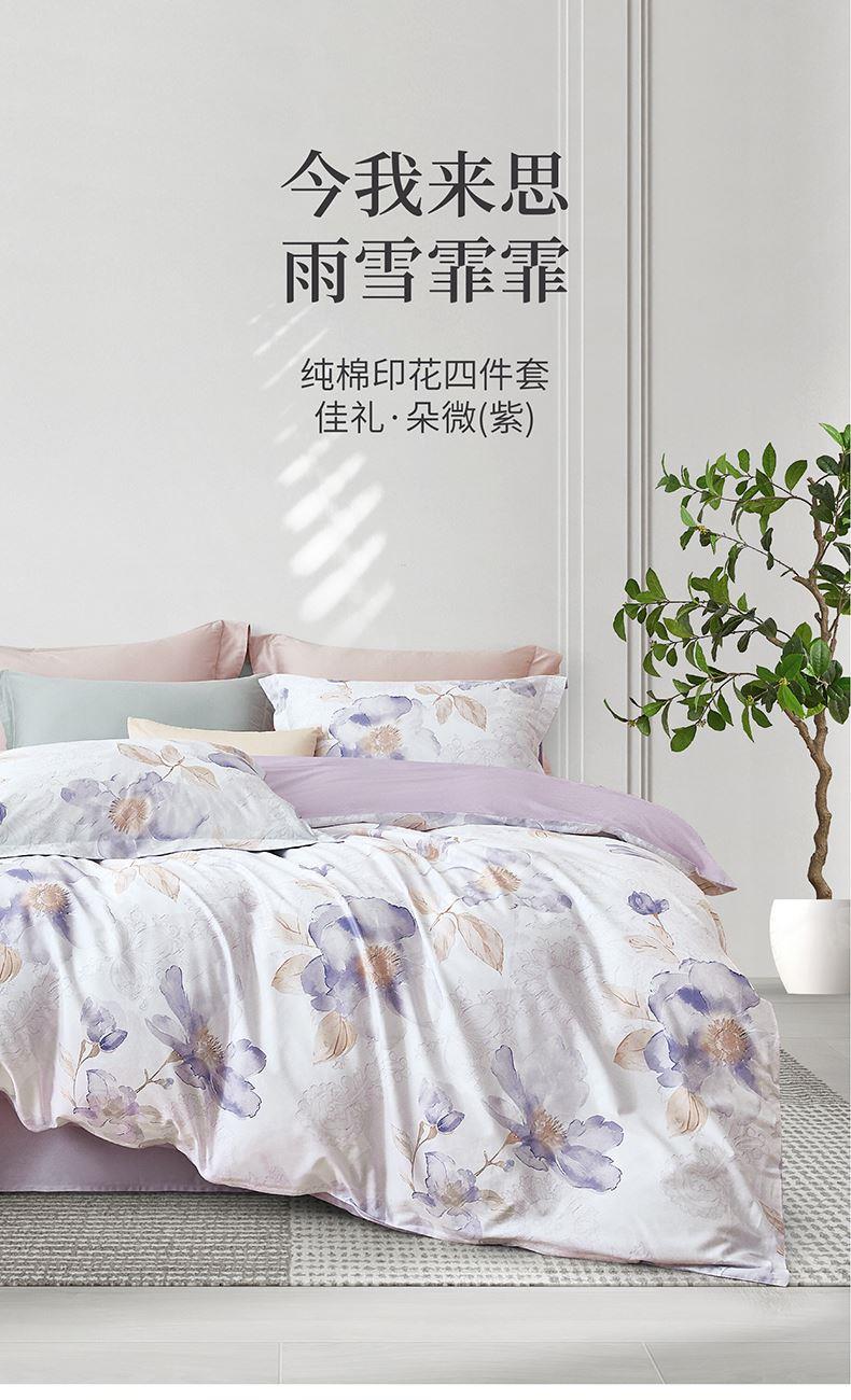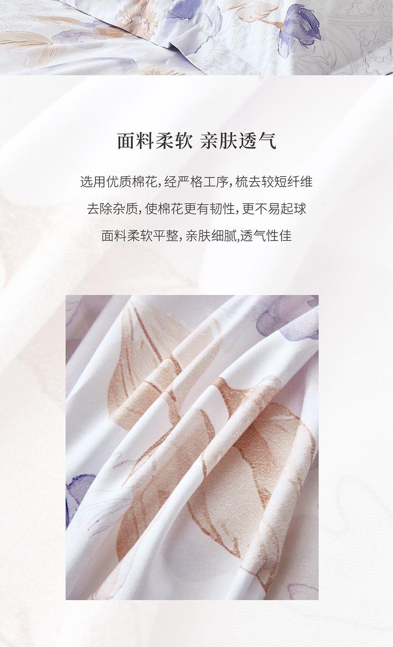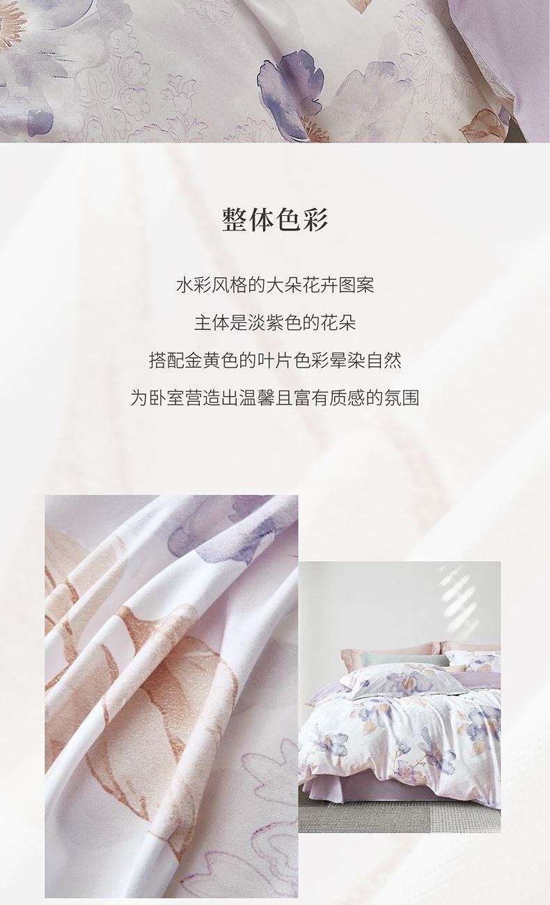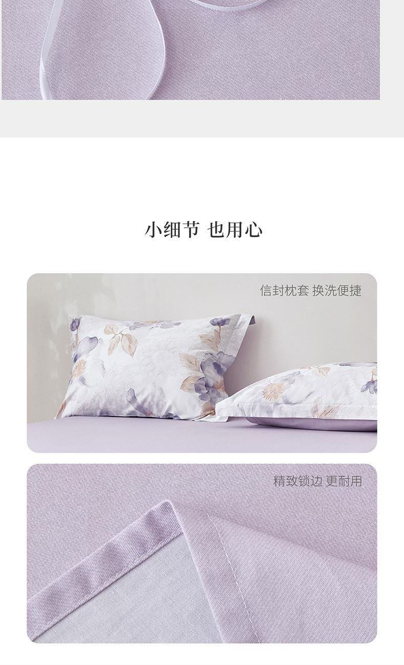 面 料:棉 尺 寸:被套:200×230cm 床单:245×230cm 短枕:50×70cm×2 整体色彩:水彩风格的大朵花卉图案,主体是淡紫色的花朵,搭配金黄色的叶片,色彩晕染自然。为卧室营造出温馨且富有质感的氛围。 面料:选用优质棉花,经严格工序,梳去较短纤维,去除杂质,使棉花更有韧性,更不易起球。面料柔软平整,亲肤细腻,透气性佳。 工艺:精简的四件套组合,短枕大气。