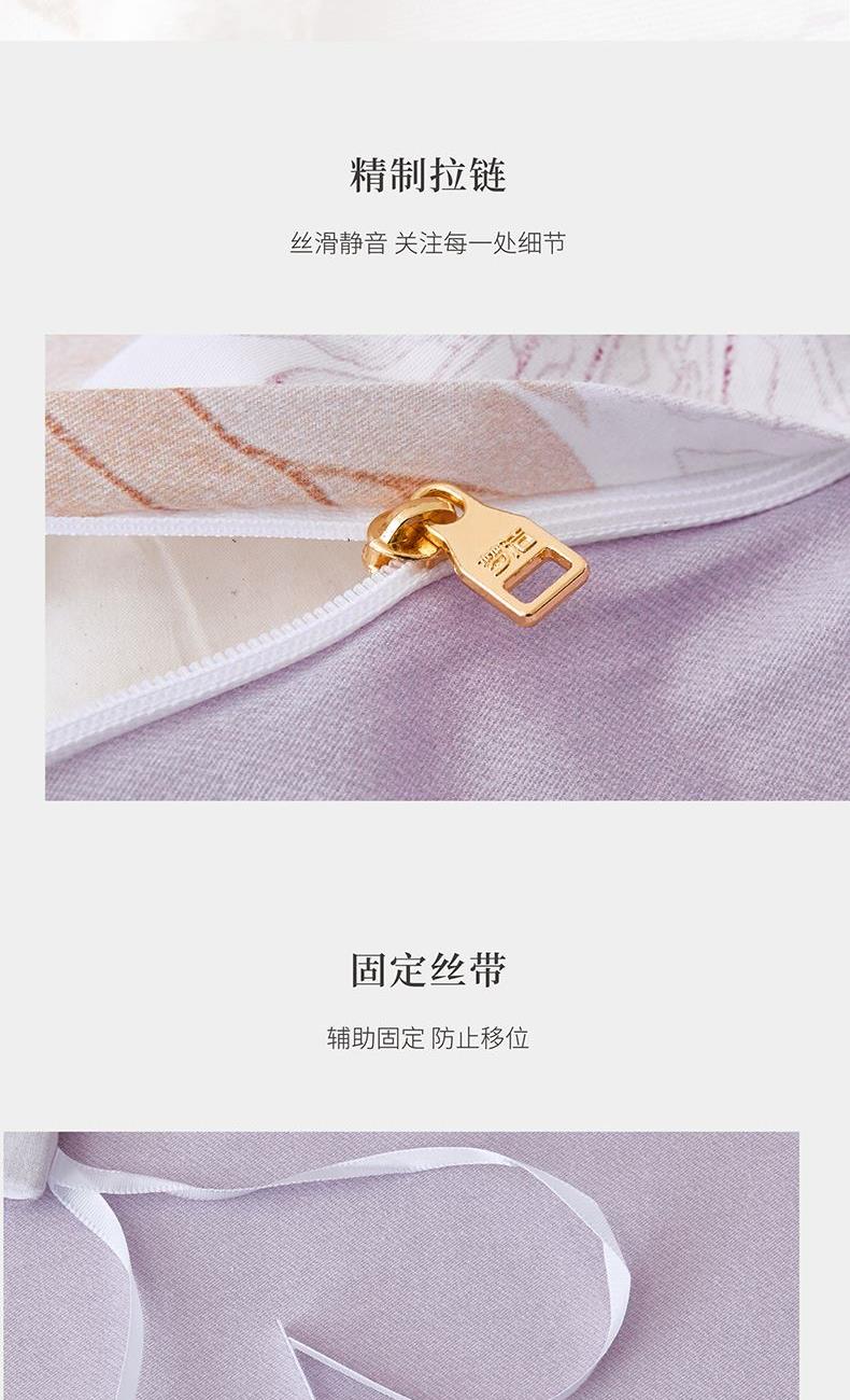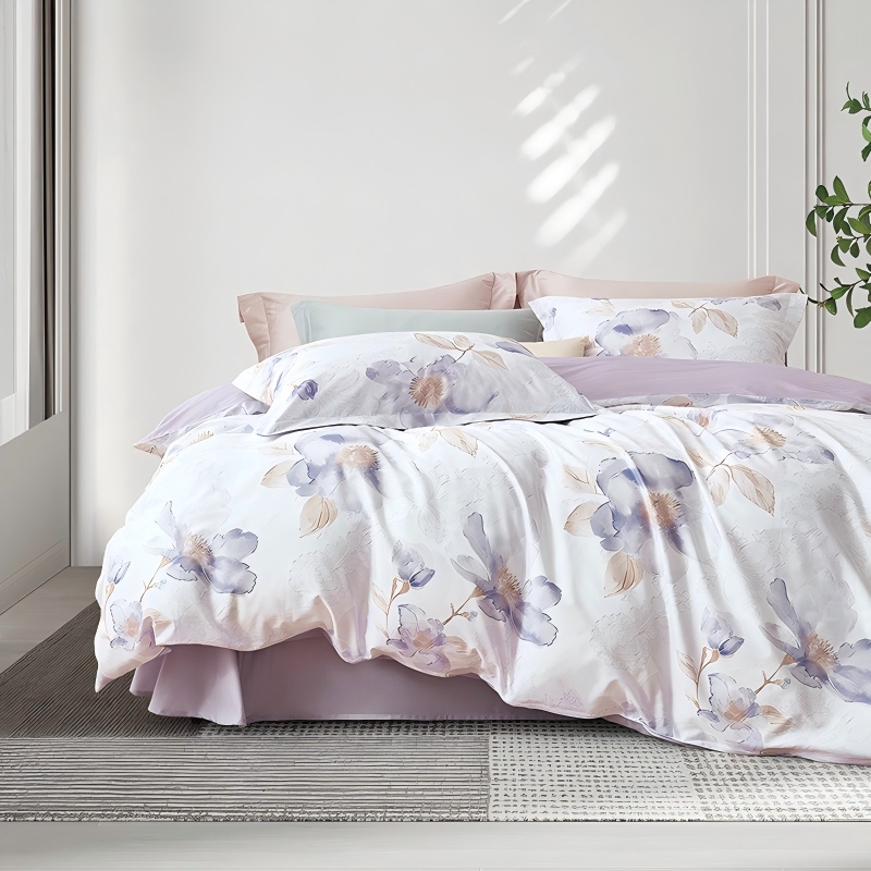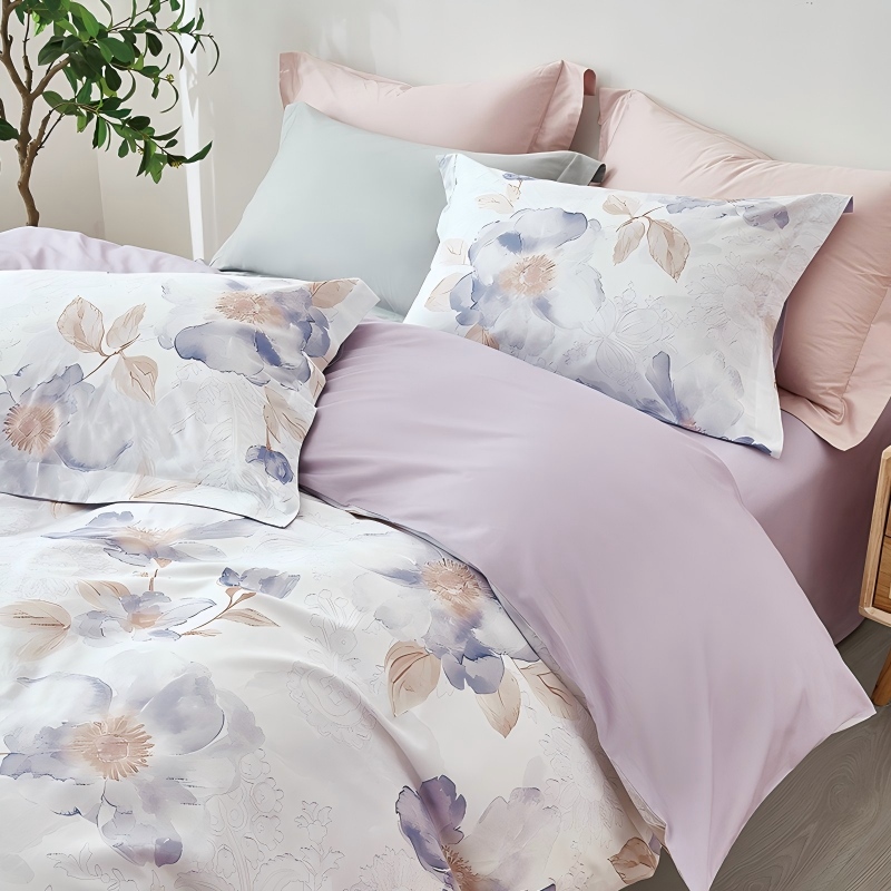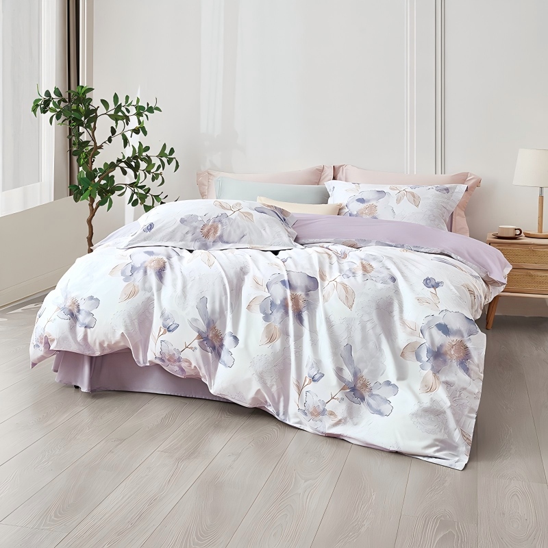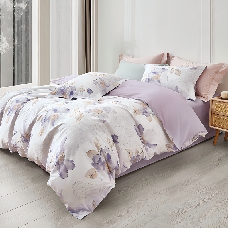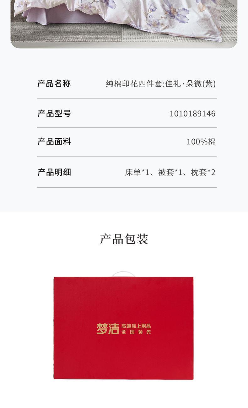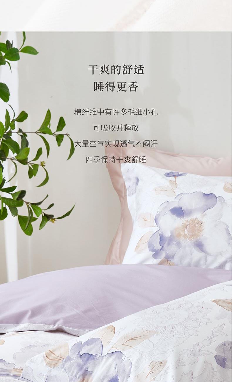 面 料:棉 尺 寸:被套:200×230cm 床单:245×230cm 短枕:50×70cm×2 整体色彩:水彩风格的大朵花卉图案,主体是淡紫色的花朵,搭配金黄色的叶片,色彩晕染自然。为卧室营造出温馨且富有质感的氛围。 面料:选用优质棉花,经严格工序,梳去较短纤维,去除杂质,使棉花更有韧性,更不易起球。面料柔软平整,亲肤细腻,透气性佳。 工艺:精简的四件套组合,短枕大气。