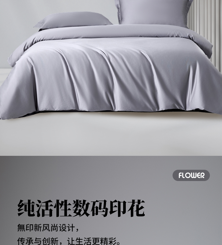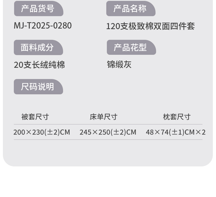 规 格:被套-200×230(±2)cm 床单-245×250cm(±2) 枕套-48×74(±1)cm×2 面 料:120支长绒纯棉 花 型:锦缎灰 120支长绒棉,贡缎织造,细腻的棉纱。 创新的工艺,用心的品质,认真的细节,对用户的尊重. 纯活性数码印花,無印新风尚设计,创新,让生活更精彩