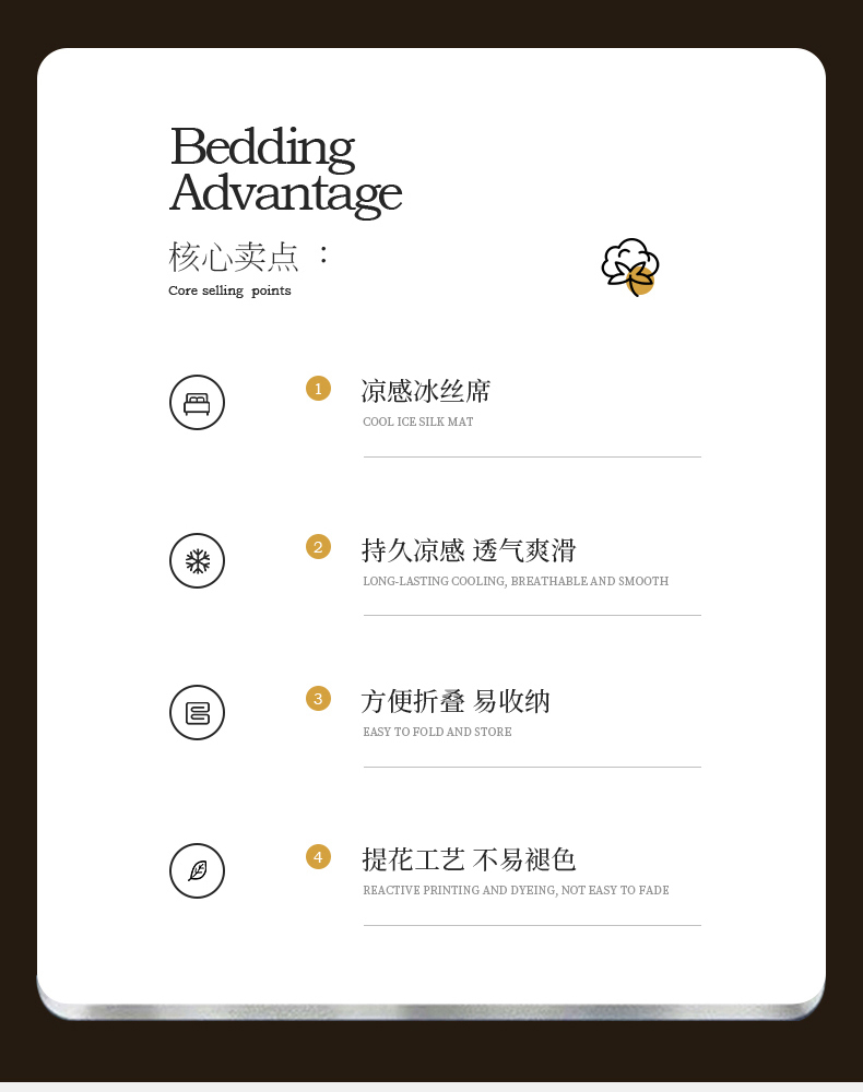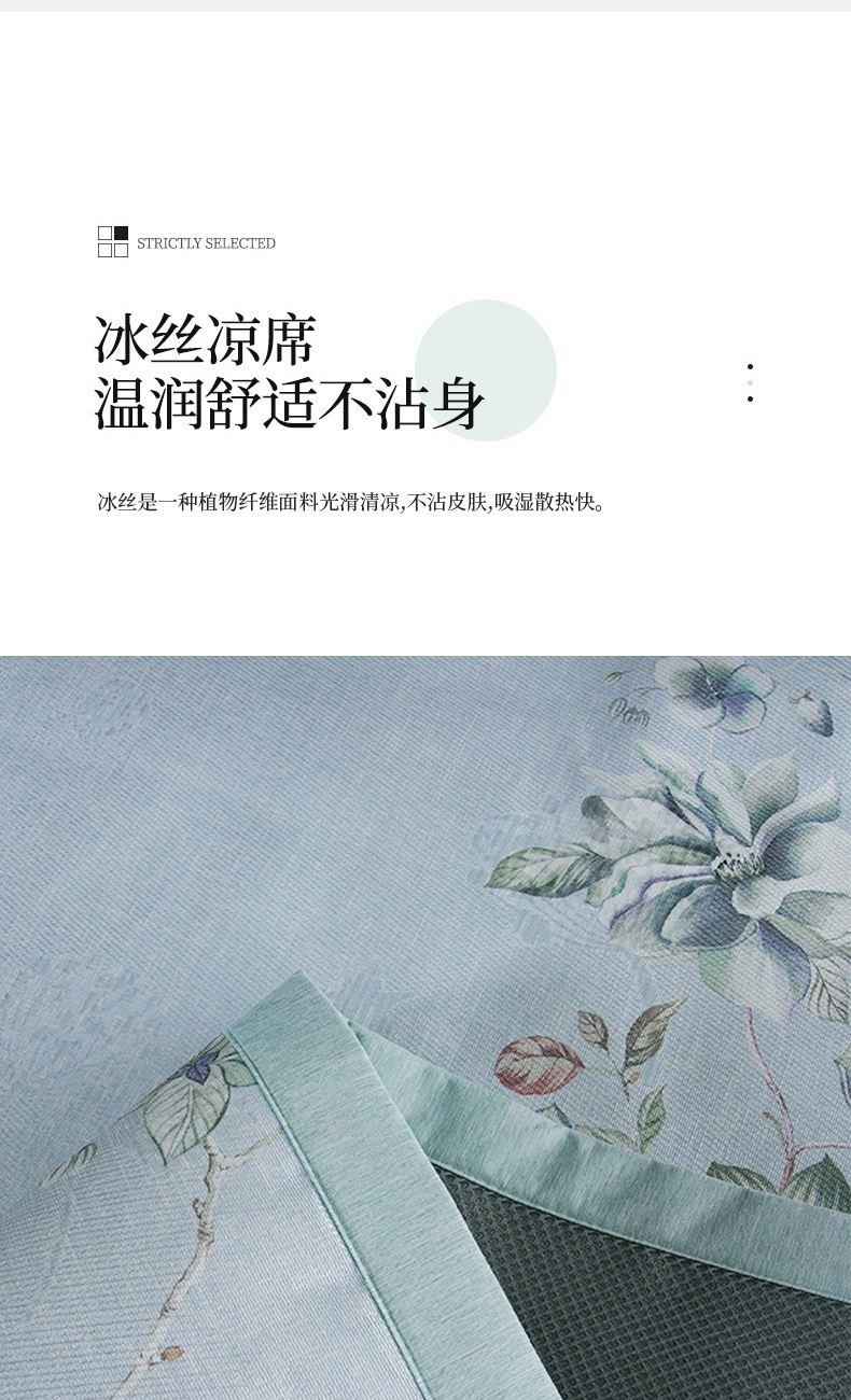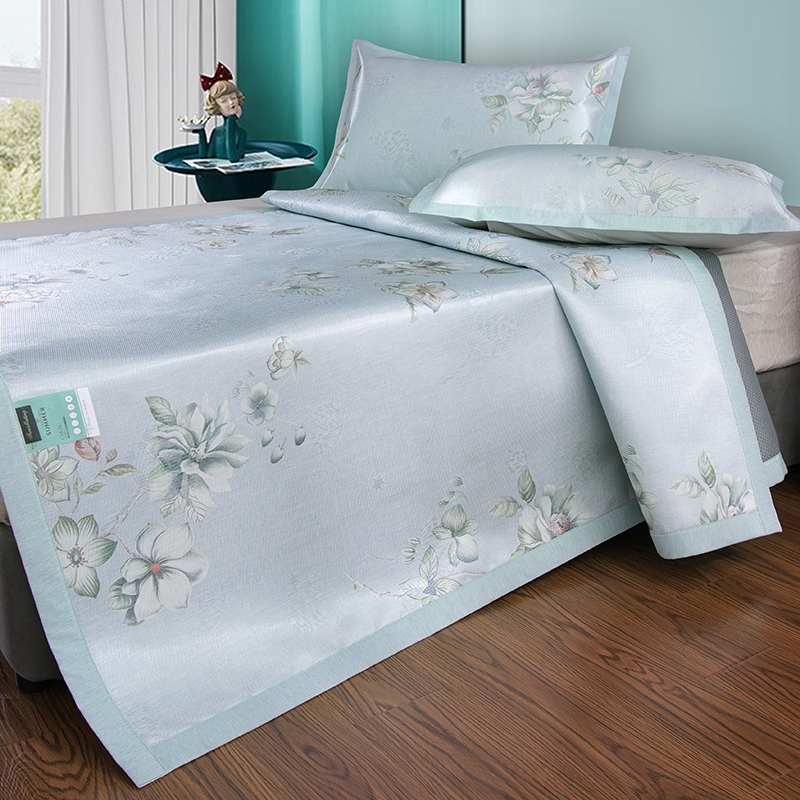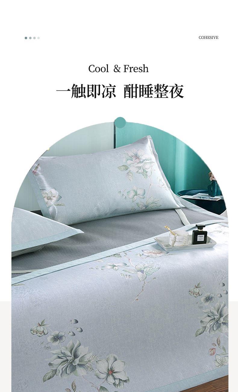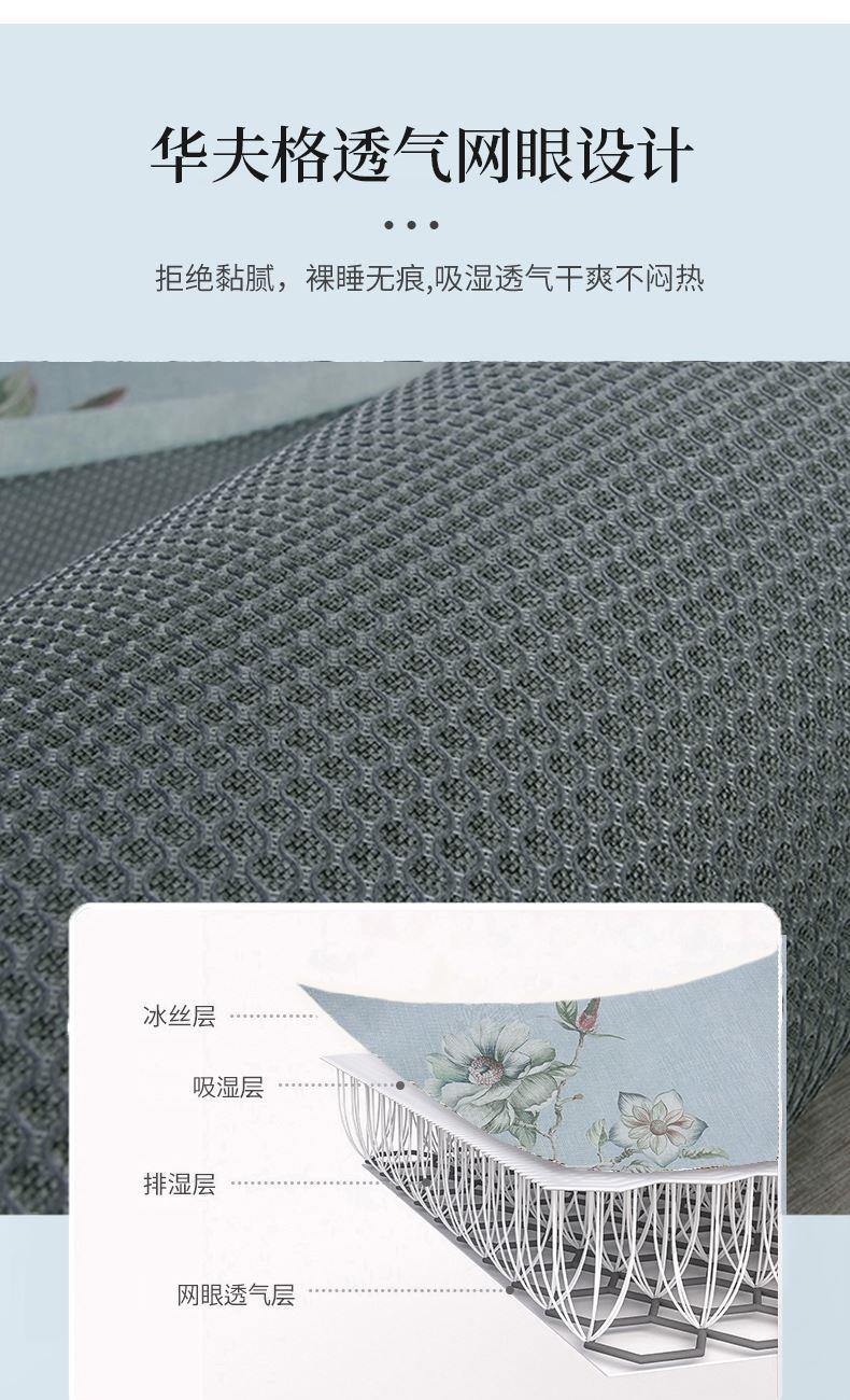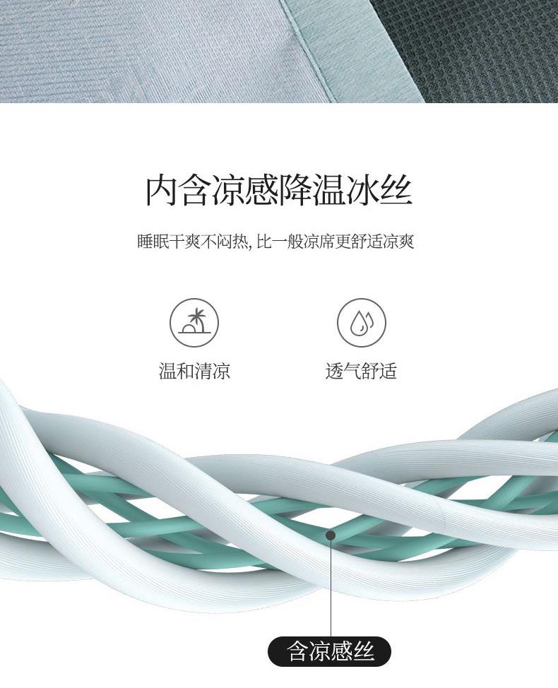 规格:180*200cm 枕套:48*74cm*2 面料:冰丝 复合料:三明治 执行标准:Q/TDY 01-2016 安全类别:GB18401-2010 B类 1.冰丝纤维自带降温功能,躺上体感温度直降3-5°C,再燥热的夏天,也抵不过它的丝滑舒爽,取材自然纤维,触感超柔软,细滑贴合肌肤,睡眠无拘束,触肤凉而不冰并且有良好的散热性能。