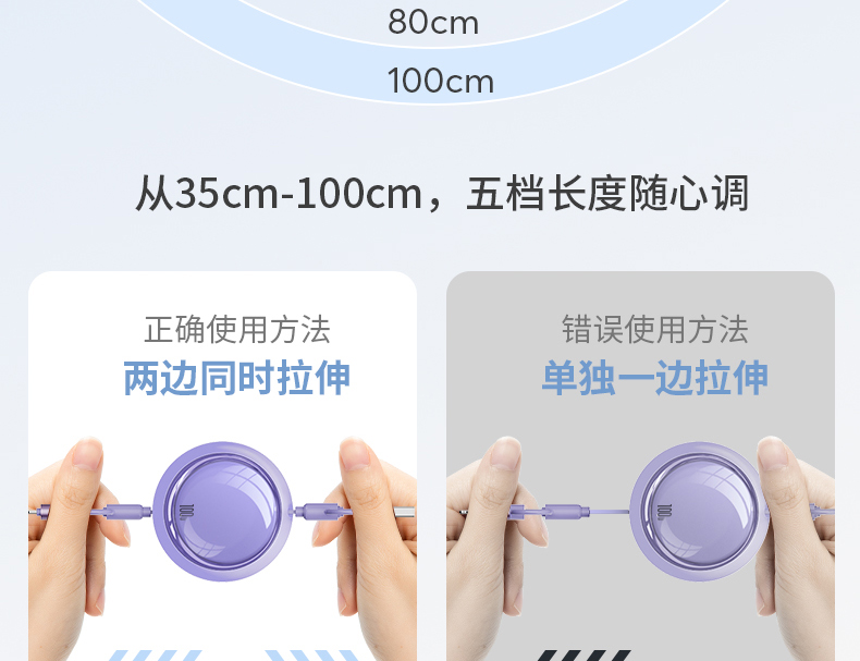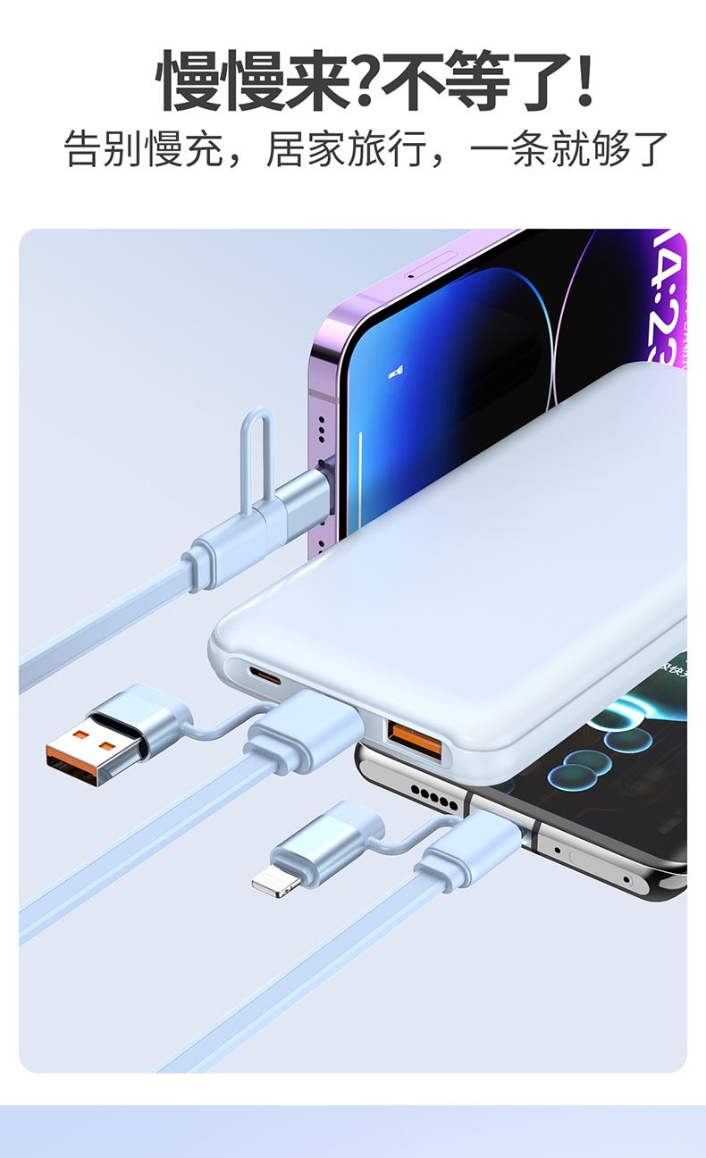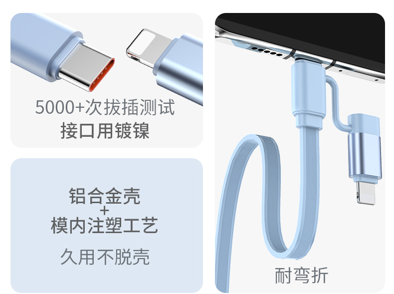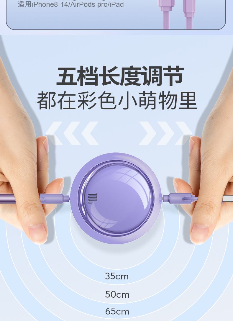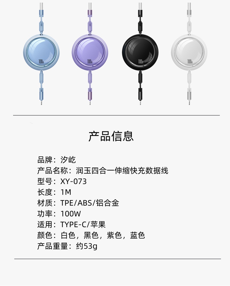 长度:1M 材质:TPE/ABS/铝合金 功率:100W 适用:TYPE-C/苹果 颜色:白色,黑色,紫色,蓝色 产品重量:约53g 产品包装尺寸:140*90*27mm(彩盒) 产品卖点:Type-c-Type-c,Type-c-Lightning,USB-Type-c,USB-Lightning,出门只带一条线,多协议适配多种机型设备使用, TPE环保材质,防缠绕,耐拉伸,经久耐用,加固接头,广泛兼容,适用市面绝大多数手机。