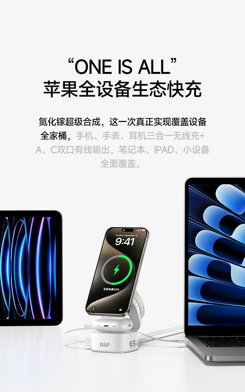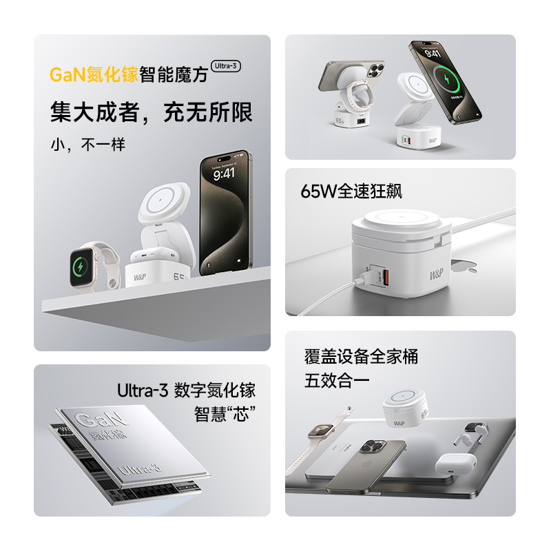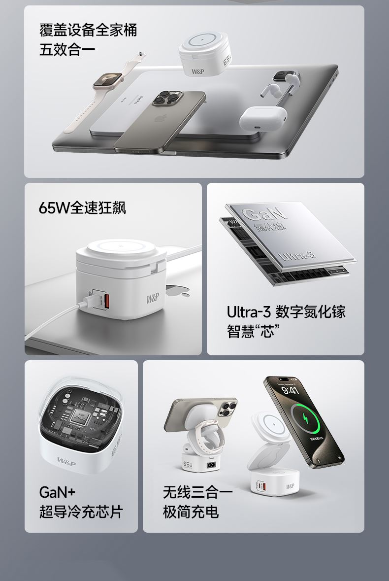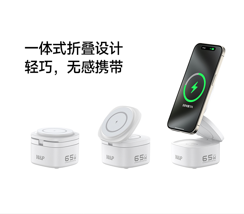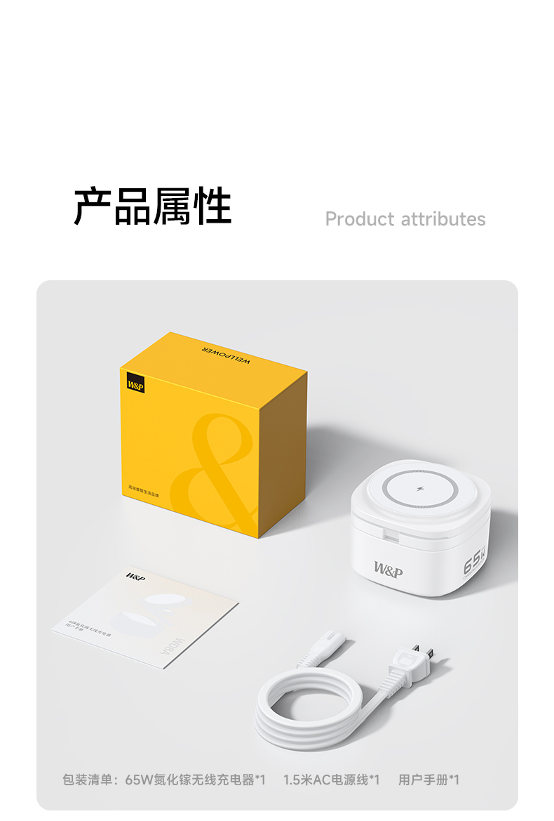 产品型号:W08A 产品尺寸:68.9*68.9*54.8mm 产品重量:约255g W&P65W氮化镓充无线充,科技赋能移动生活; 采用全新的第三代氮化镓数字芯片充电效率提升1.2倍; 覆盖设备全家桶五效合一; 先进制造芯片工艺,散热效率跃升50%; 3C认证,CQC认证,CB认证,权威认证,品质安全可靠; WP-N52.M稀土永磁体感受超级磁场吸引力; 一体式折叠设计轻巧,无感携带。