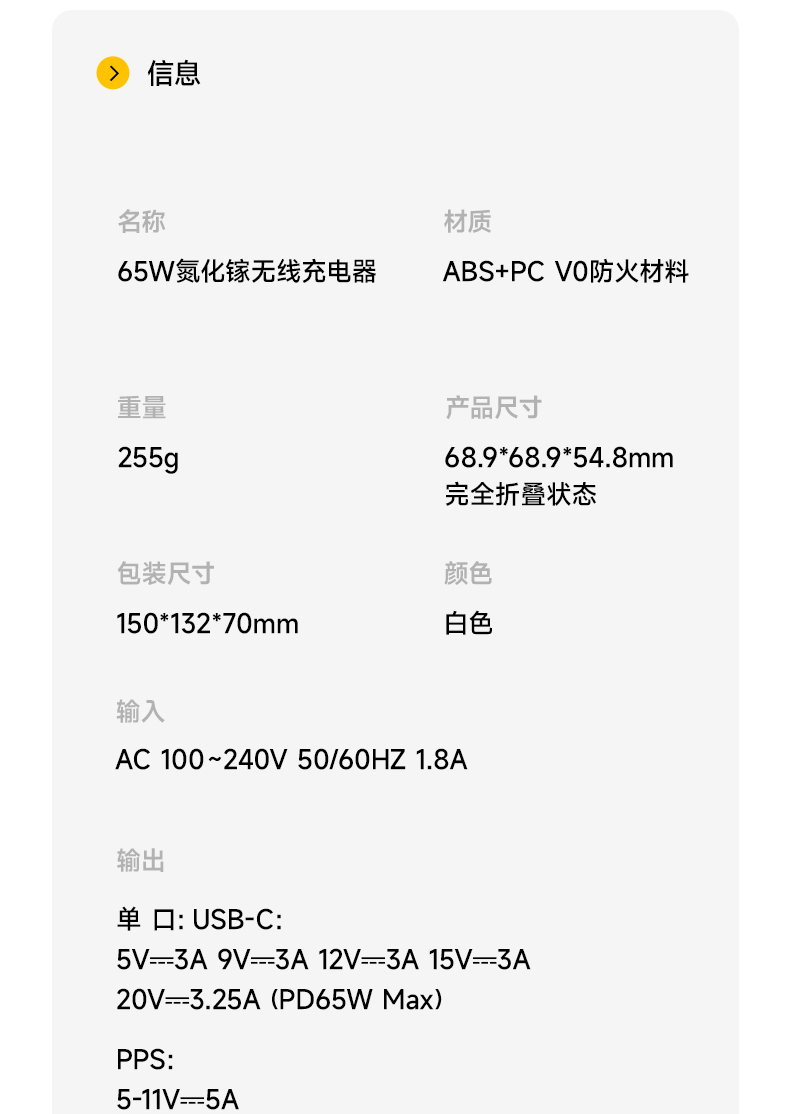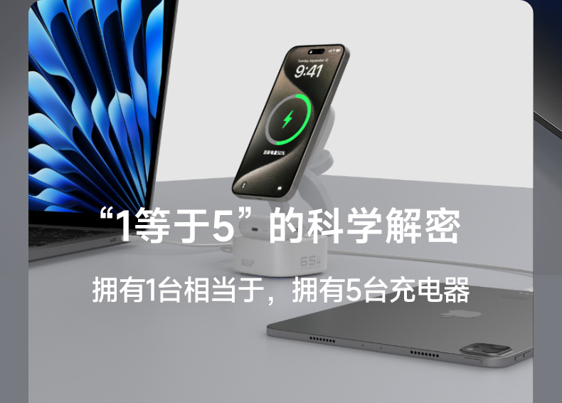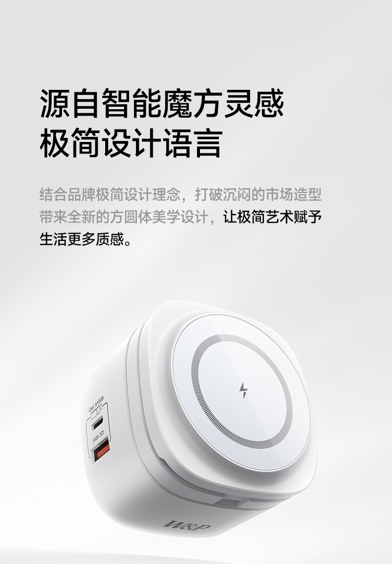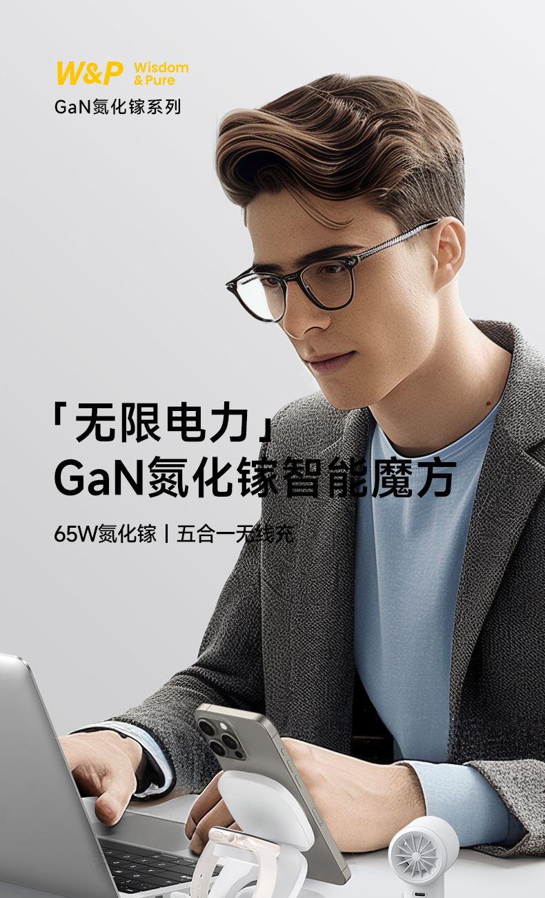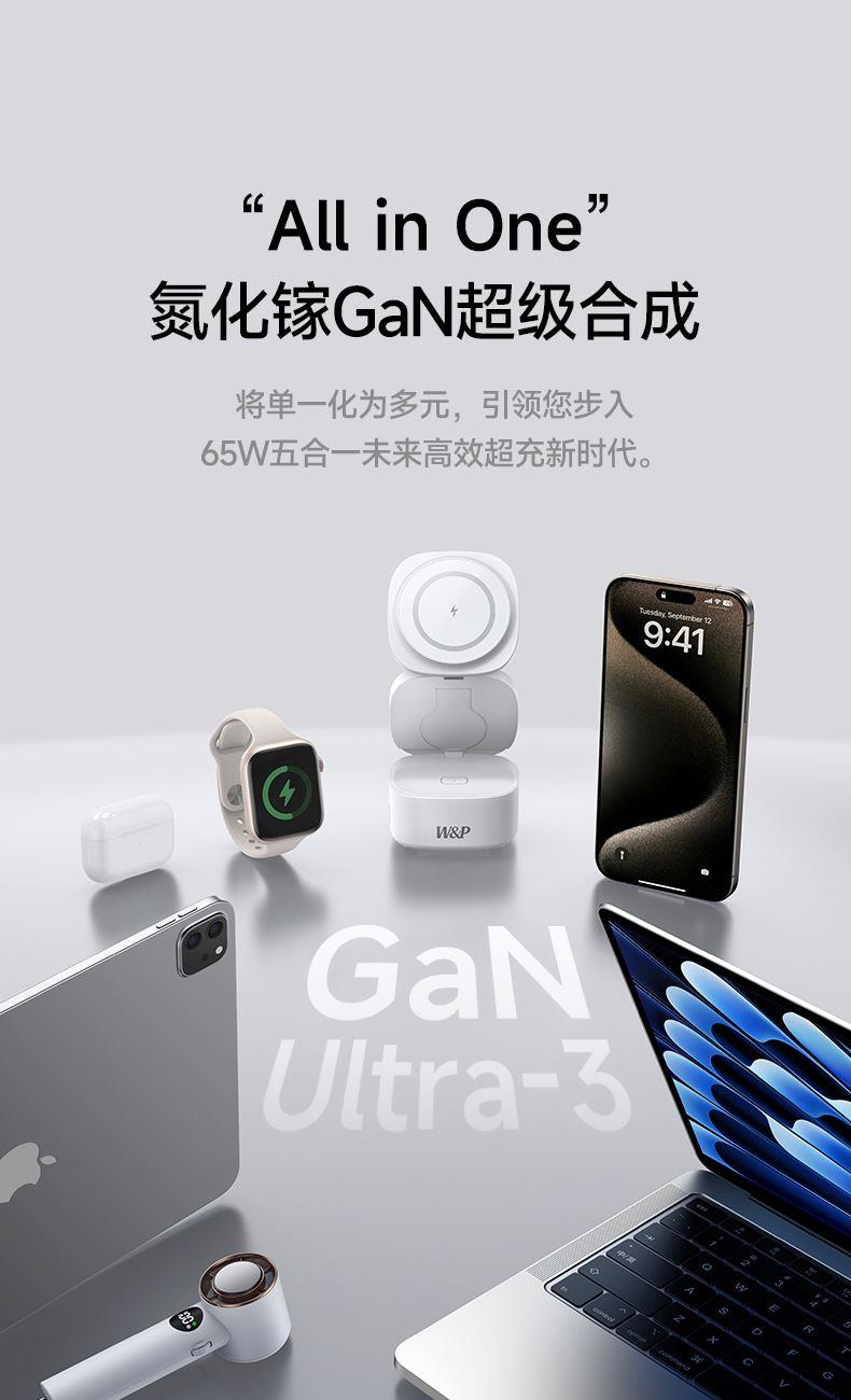 产品型号:W08A 产品尺寸:68.9*68.9*54.8mm 产品重量:约255g W&P65W氮化镓充无线充,科技赋能移动生活; 采用全新的第三代氮化镓数字芯片充电效率提升1.2倍; 覆盖设备全家桶五效合一; 先进制造芯片工艺,散热效率跃升50%; 3C认证,CQC认证,CB认证,权威认证,品质安全可靠; WP-N52.M稀土永磁体感受超级磁场吸引力; 一体式折叠设计轻巧,无感携带。