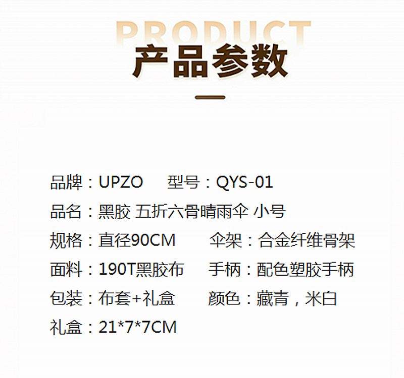 规格:直径90CM 伞架:合金纤维骨架 面料:190T黑胶布 手柄:配色塑胶手柄 包装:布套+礼盒 颜色:藏青,米白 礼盒:21*7*7CM (两色可选 藏青色主题梦想家 白色主题乐观)