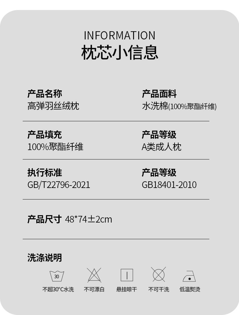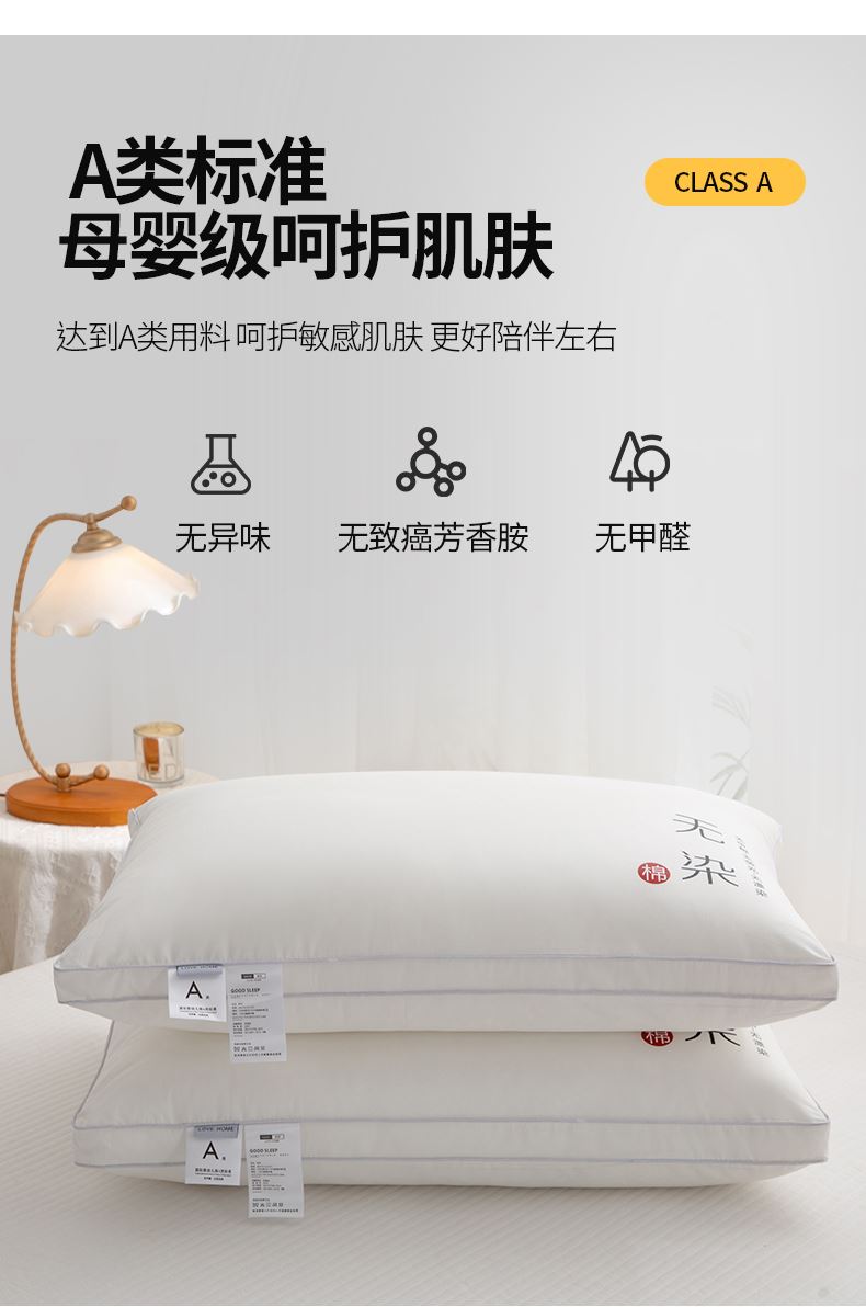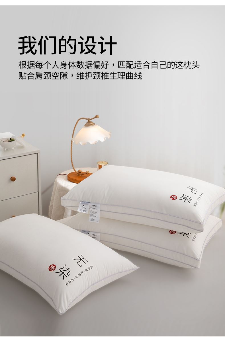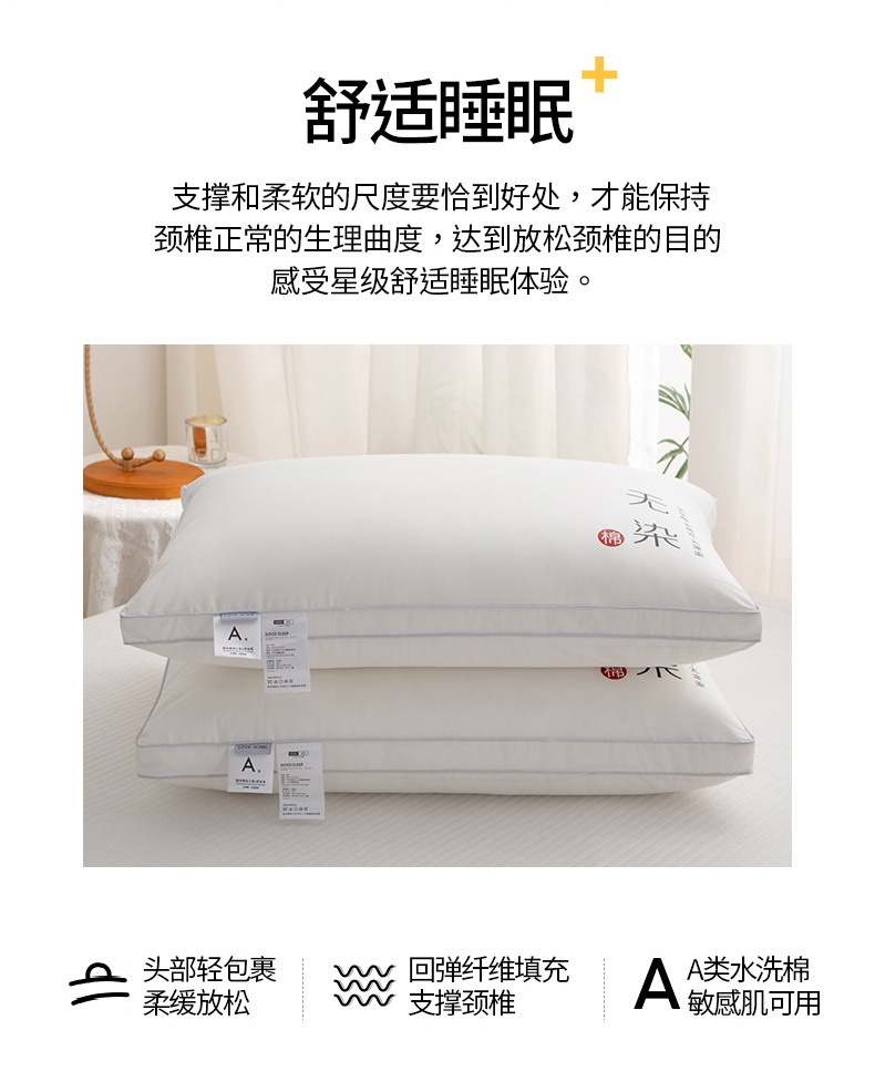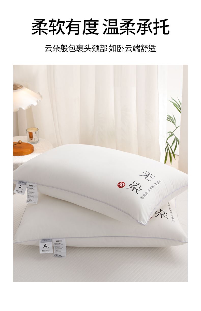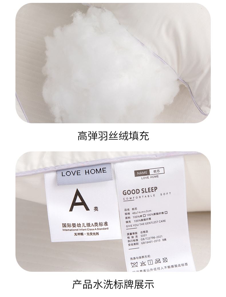 面料:聚酯纤维 规格:48cm*74cm 填充:三维卷曲棉(聚酯纤维) 印染工艺:活性 包装:精美提袋 枕头采用安全面料,填充超细旦纤维,柔软性更好,给您带来整夜的舒适睡眠。
