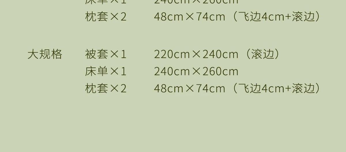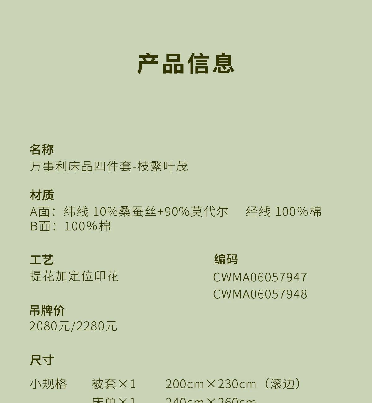 万事利床品四件套-枝繁叶茂 材质 A面:纬线10%桑蚕丝+90%莫代尔,经线100棉 B面:100棉 工艺:提花加定位印花 编码:CWMA06057947(小)、CWMA060579489(大) 吊牌价:2080元/2280元 小规格尺寸: 被套ㄨ1 200cm×230cm(滚边) 床单X1 240cmX260cm 枕套X2 48cm×74cm(飞边4cm+滚边) 大规格尺寸: 被套X1 220cm×240cm(滚边) 床单X1 240cmX260cm 枕套X2 48cm×74cm(飞边4cm+滚边)