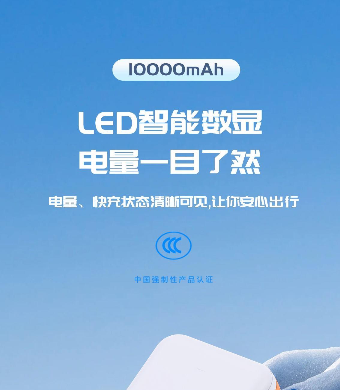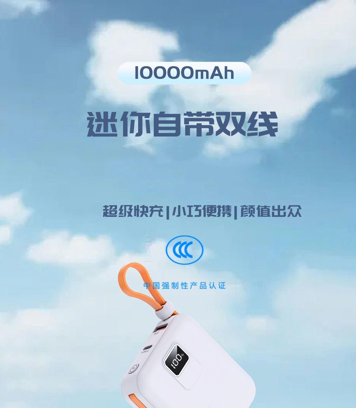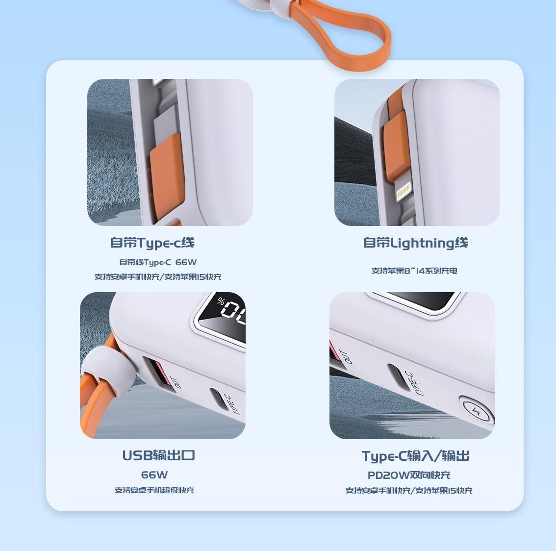 产品卖点:LED数显电量,掌握剩余电量,自带Type-c线支持苹果15,16快充,USB接口支持22.5W超级快充,充电宝支持快充蓄电,具有过压保护,过放保护,短路保护,过充保护等功能,可带上飞机。