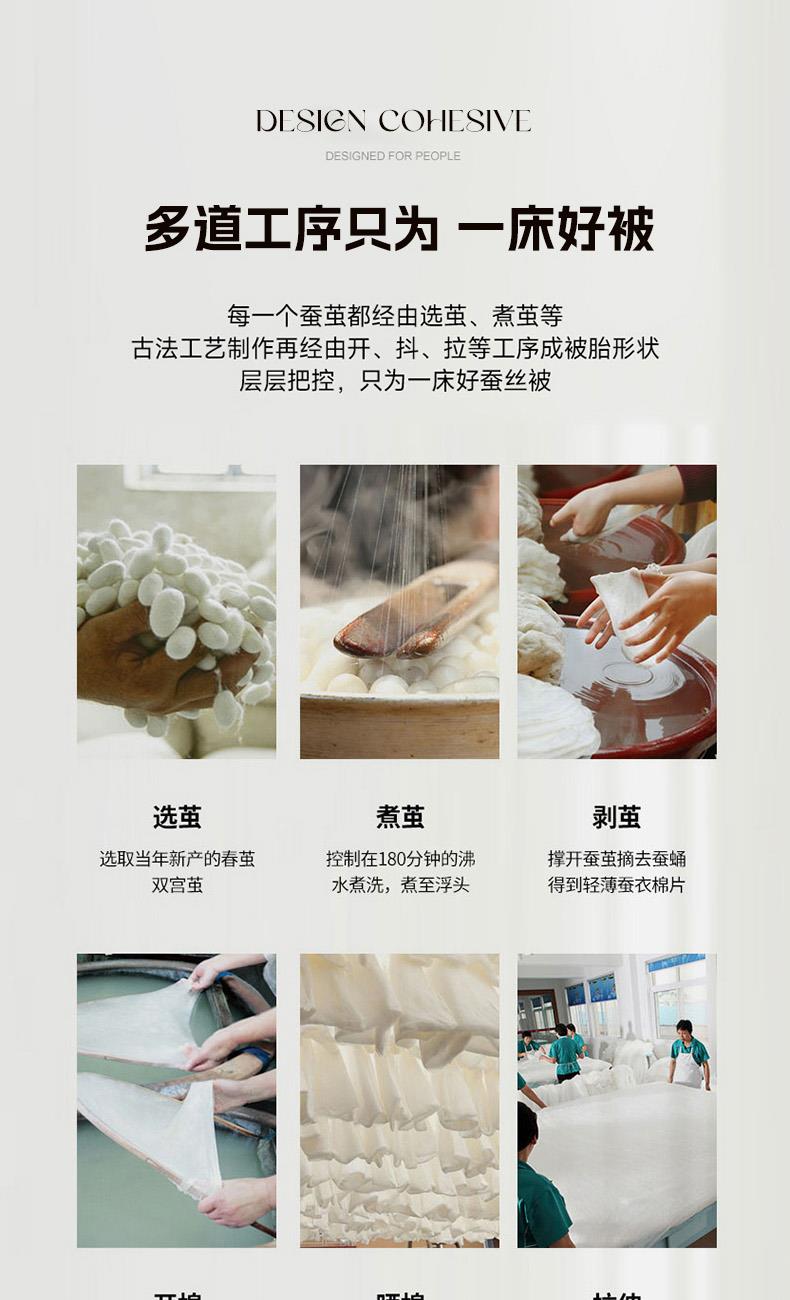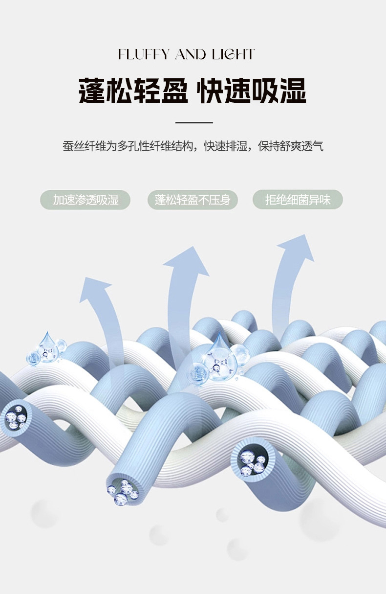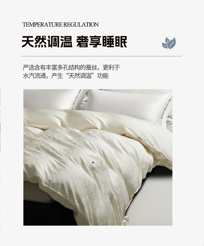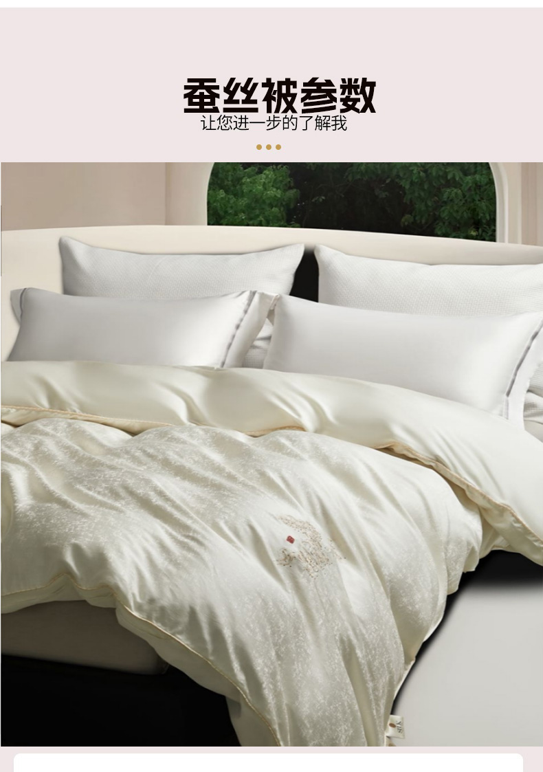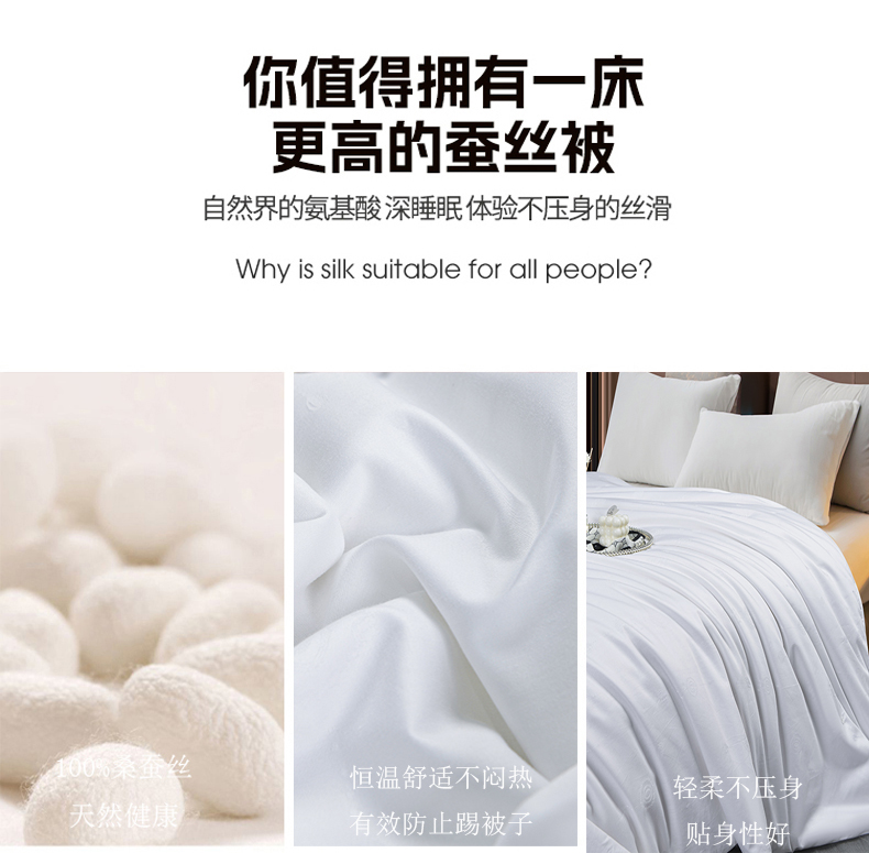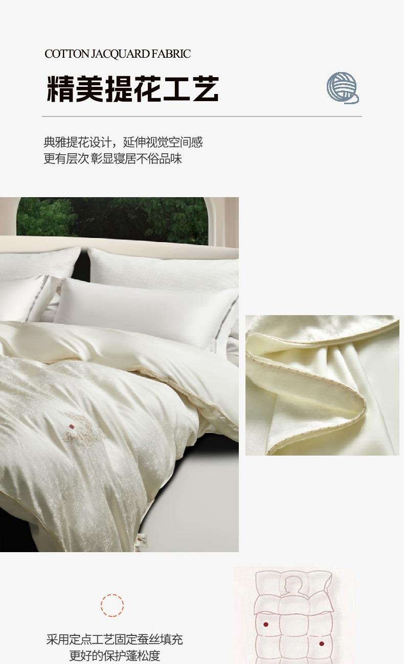 面料材质:60S天丝 填充:蚕丝 产品规格:200*230cm 克重:1900g 产品特点: 享爱蚕丝柔滑,享受拥享睡眠。会呼吸的面料,舒适软糯,躺在床上的一瞬间,感受渗透全身的惬意。
