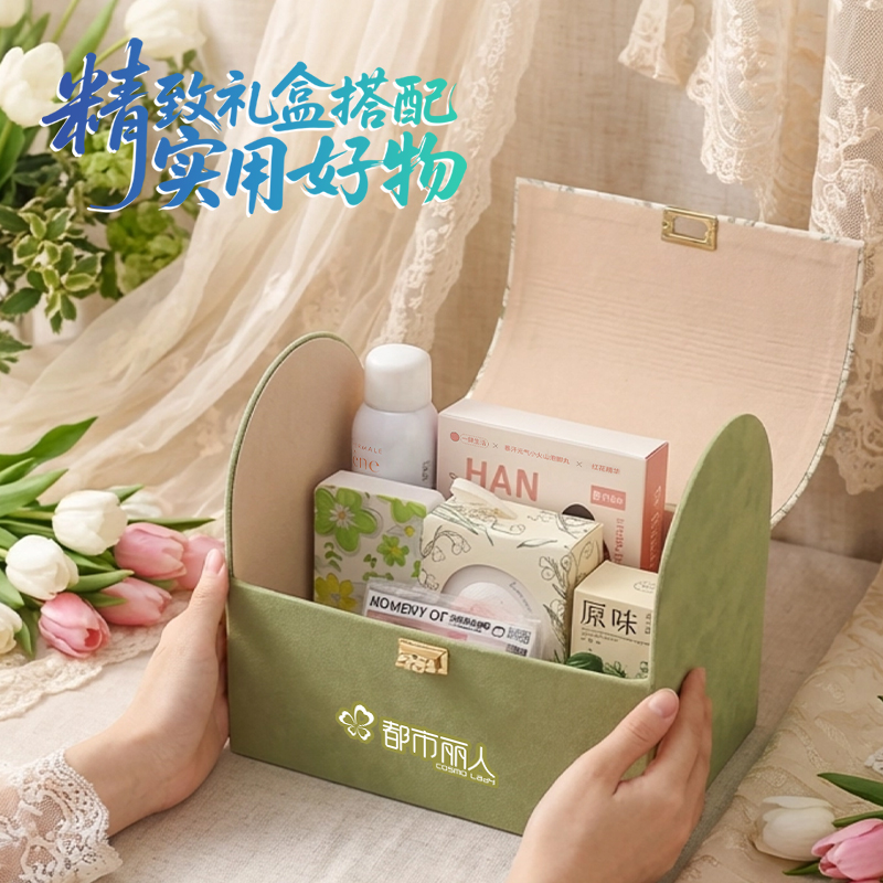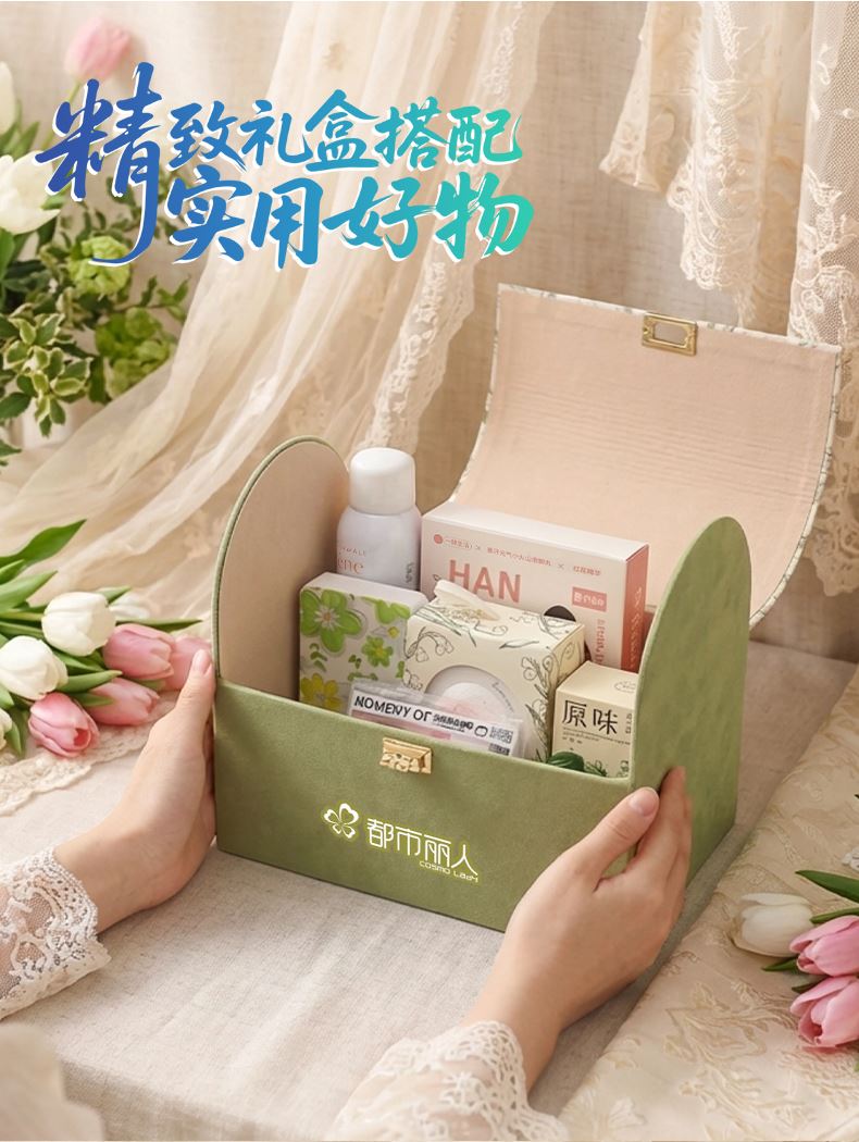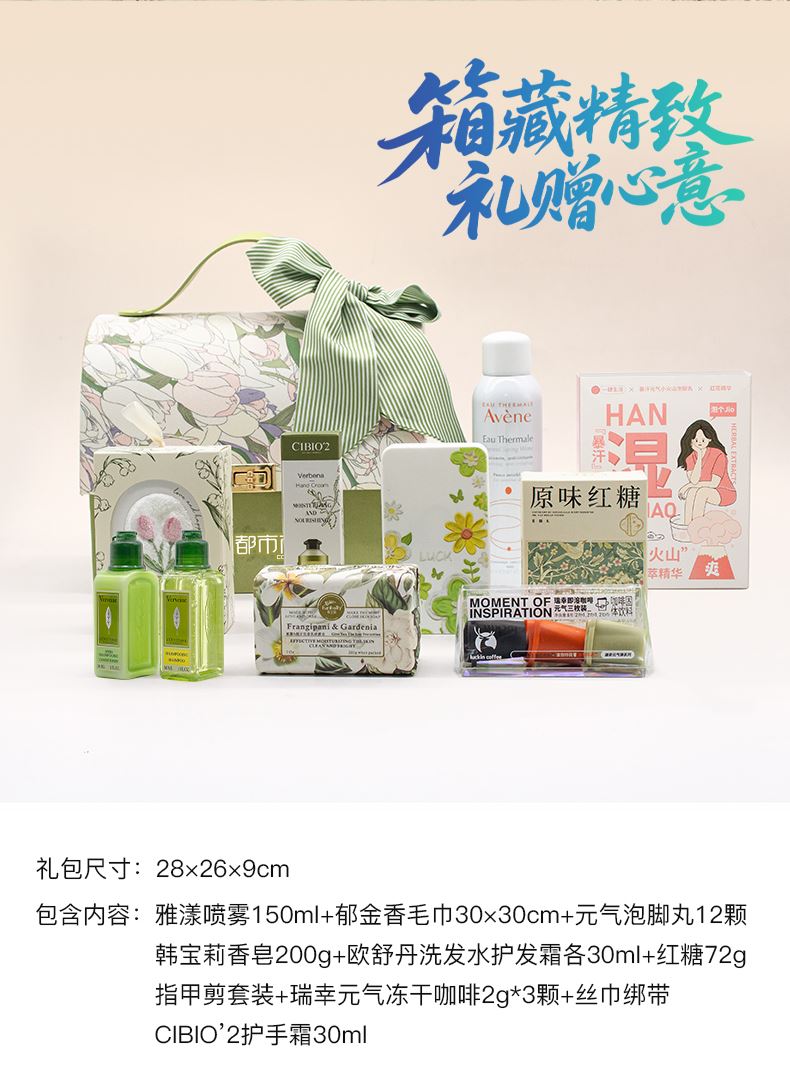 礼盒尺寸:28*26*9cm 雅漾喷雾:150ml 瑞幸元气冻干咖啡:2g*3颗 元气泡脚丸:12颗 原味红糖:72g 指甲剪套装 郁金香毛巾:0*30cm 欧舒丹洗发水护发素:各30ml CIBIO2护手霜:35ml 韩宝莉香皂:200g 丝巾绑带(颜色随机)