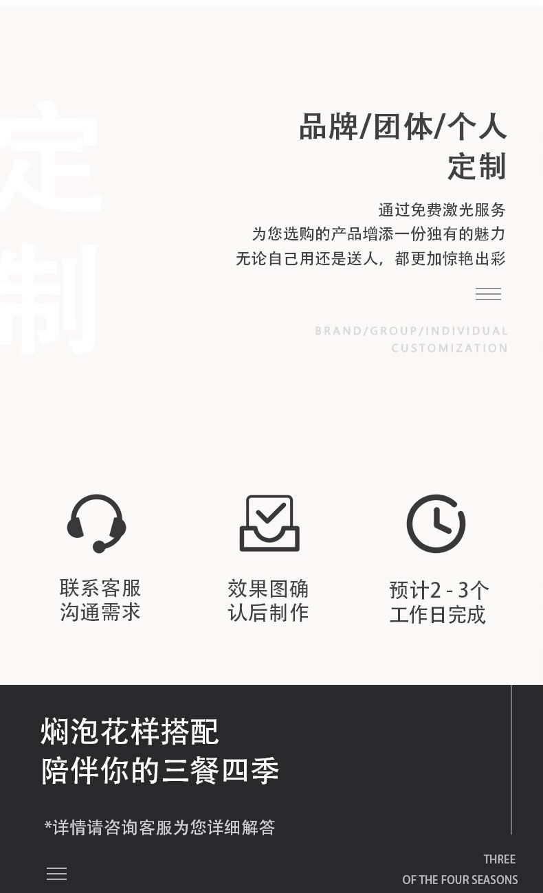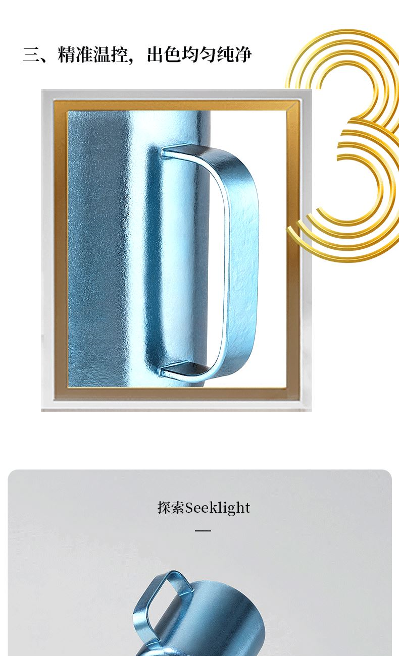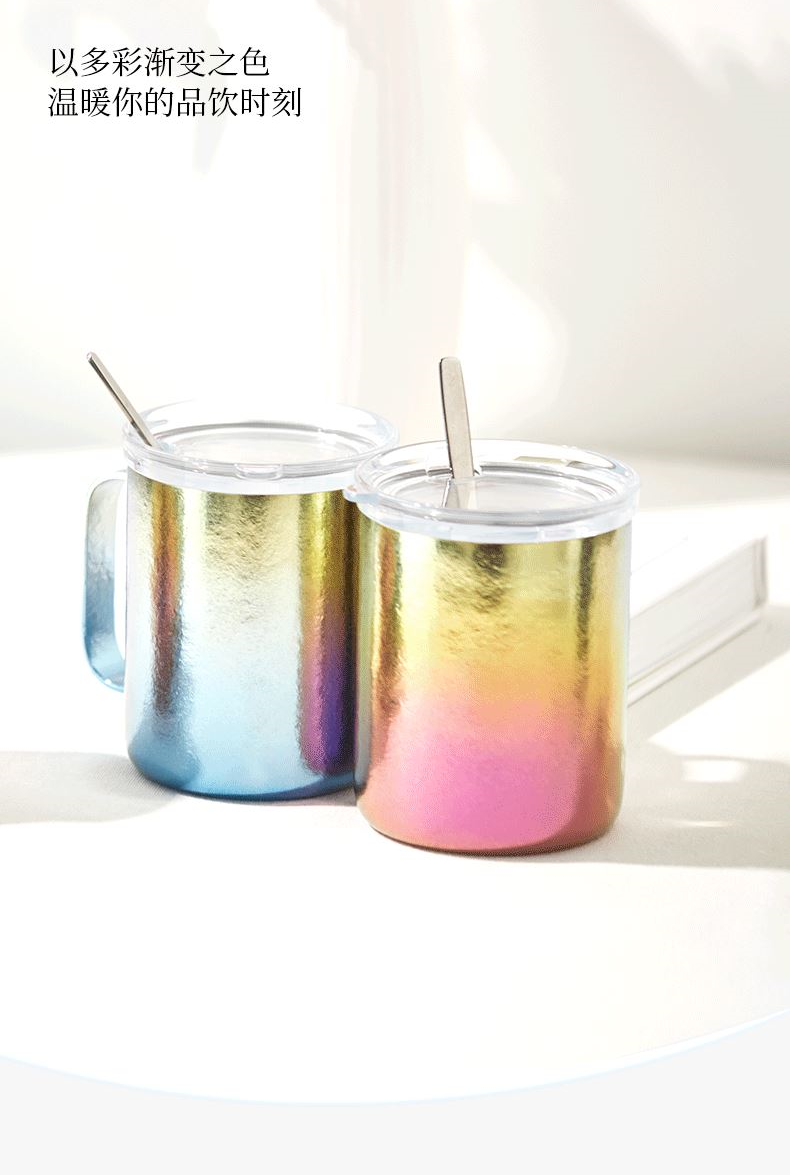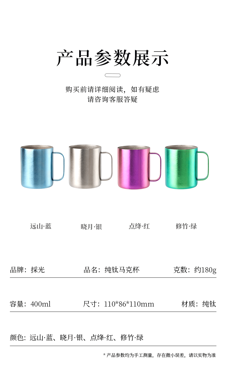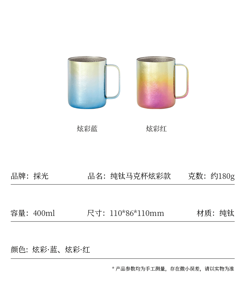 原创设计,造型简洁雅致,手握舒适 双层抽真空设计,隔热防烫,不凝露 内壁银色结晶,饮料茶汤色泽尽显 内外同品质纯钛,全覆盖结晶 型号:DCMK-0381/0382/0383/0385 CCMK-038B/038R 尺寸:110*86*110 mm 重量:约180 g 容量:400ML 颜色:远山 · 蓝 晓月 · 银 点绛 · 红 修竹 · 绿 炫彩 · 蓝 炫彩 · 红