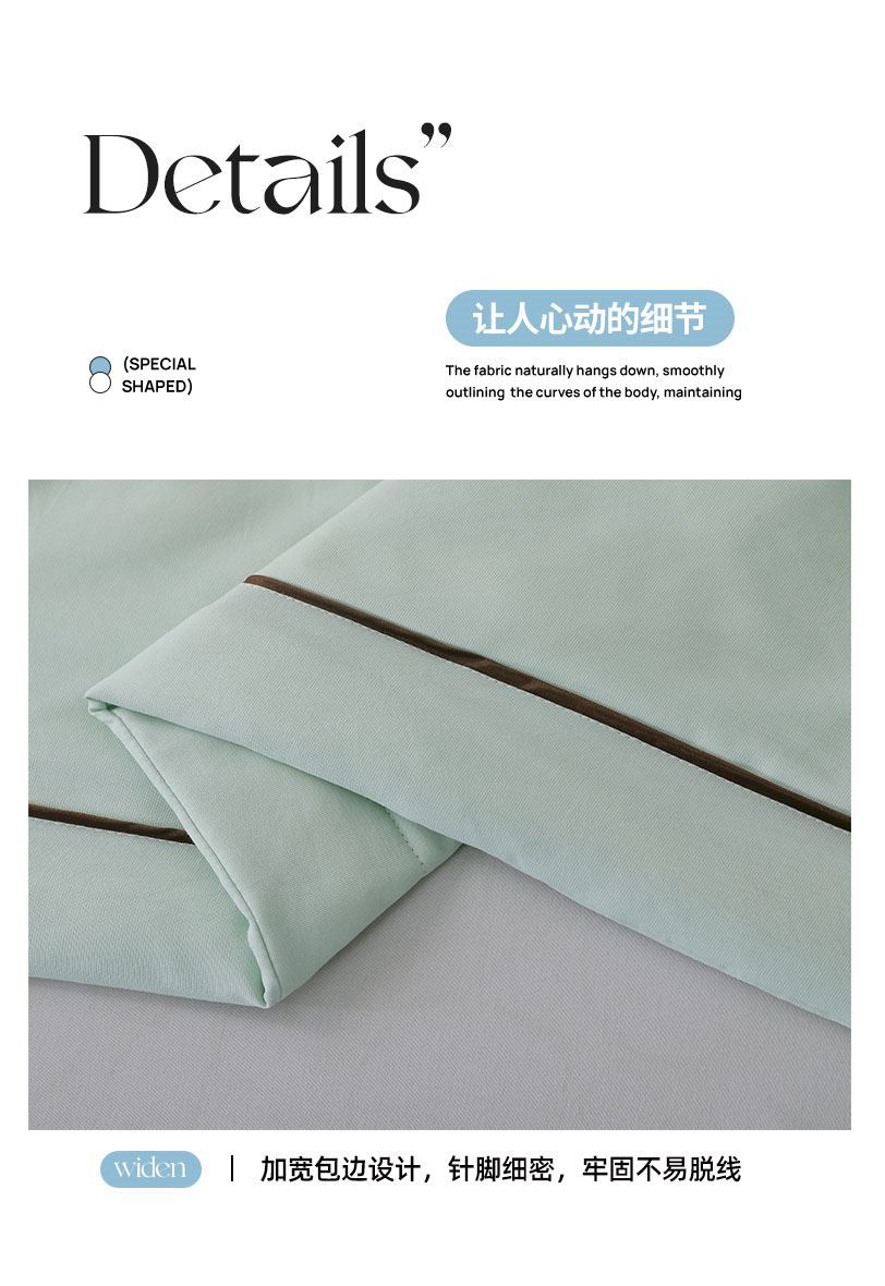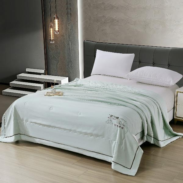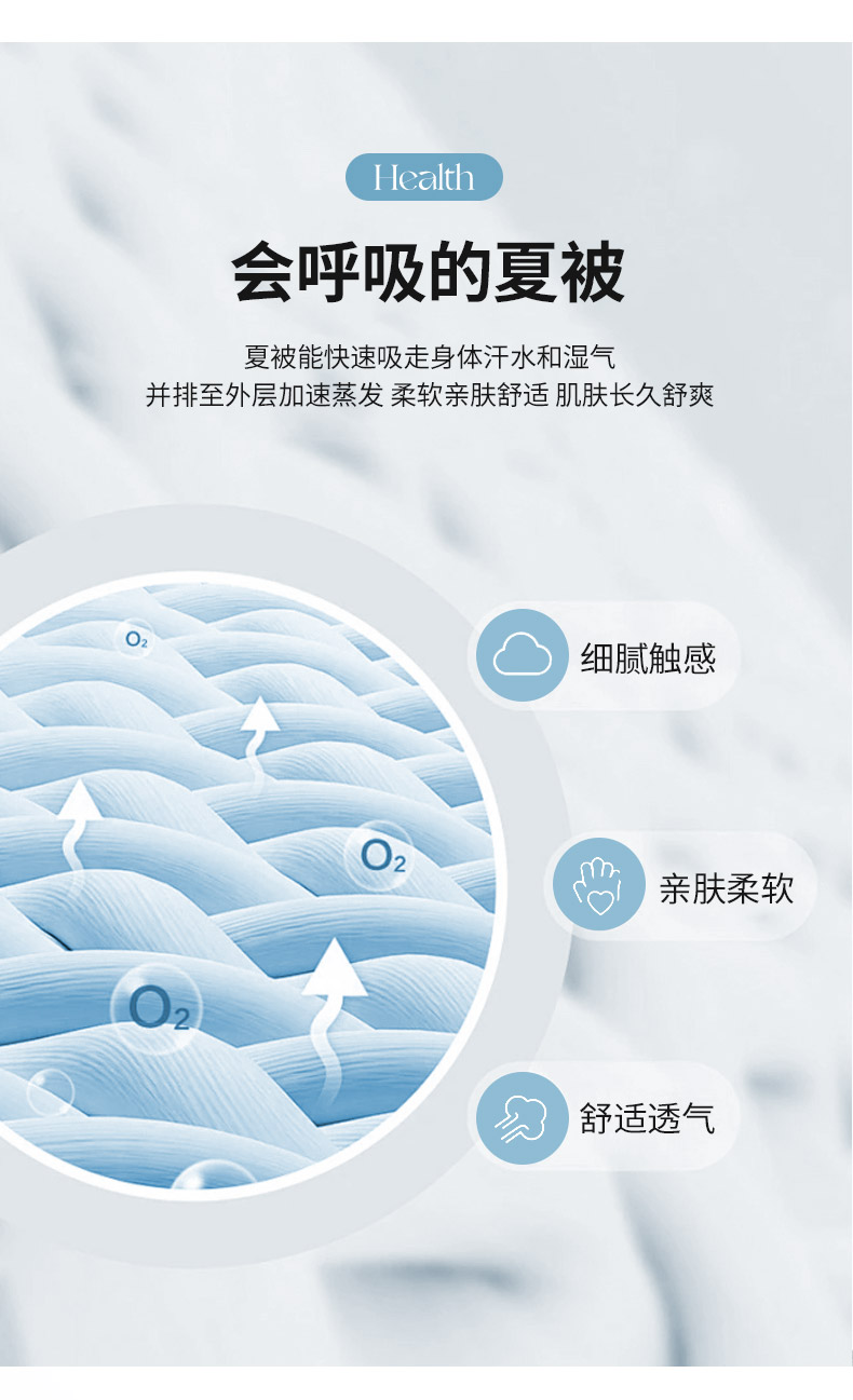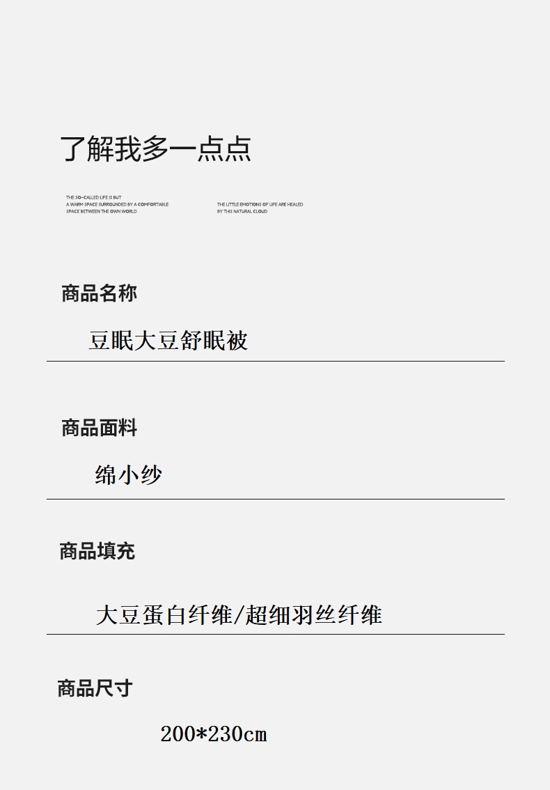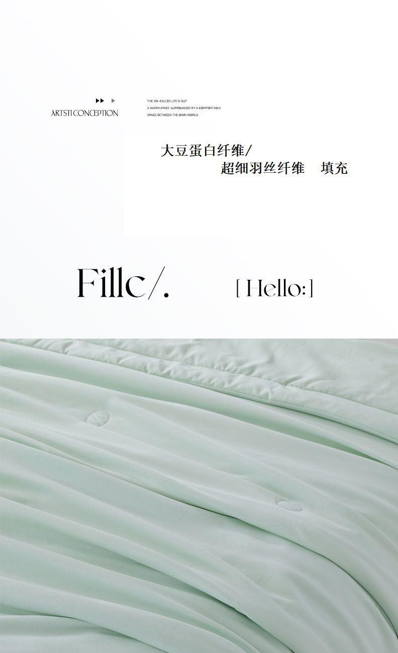 面料材质:绵小纱 填 充:大豆蛋白纤维/超细羽丝纤维 产品规格:200*230cm 克 重:1350g 产品特点: 1.面料绵小纱采用高支纱线混织而成,号称会呼吸的面料。 2.柔软顺滑、轻盈零压。 3.吸湿速干、保持凉爽③健康环保、亲肤安全,这三大核心特点。