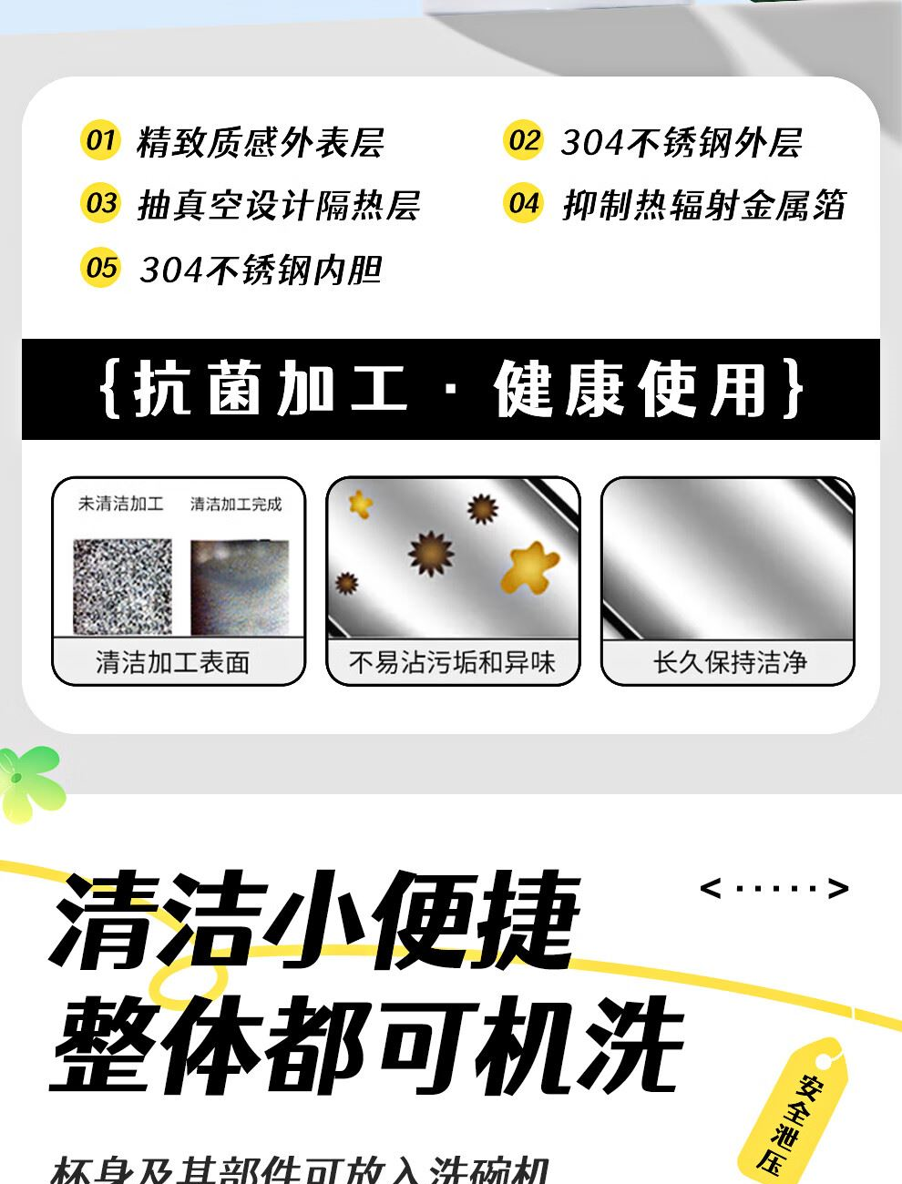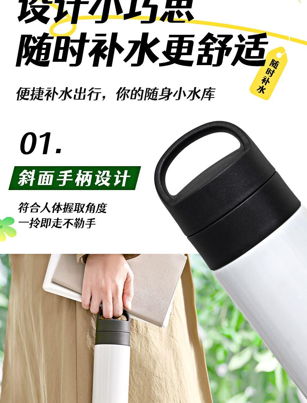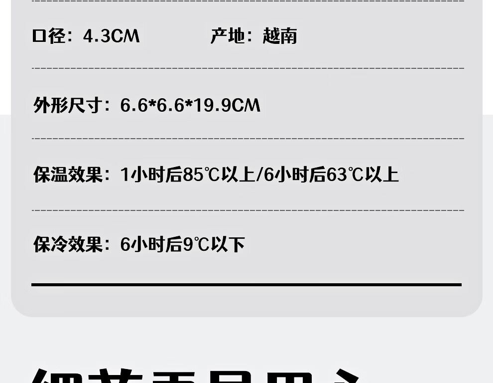 外形尺寸:6.6*6.6*19.9cm 容量:360ML 口径:4.3cm 重量:190g 产地:越南 保温效果:1小时后85°C以上/6小时后63°C以上保冷效果:1小时后9°C以下(保温:95°C沸水/保冷:4℃冰水倒入) 便携提手 保温保冷 可放碳酸饮品 可用洗碗机清洗 304不锈钢 出门便携