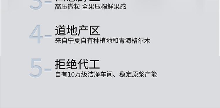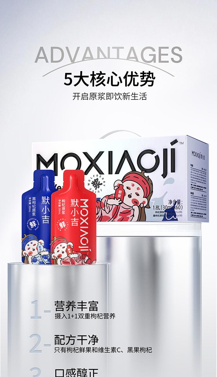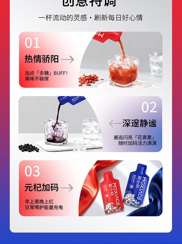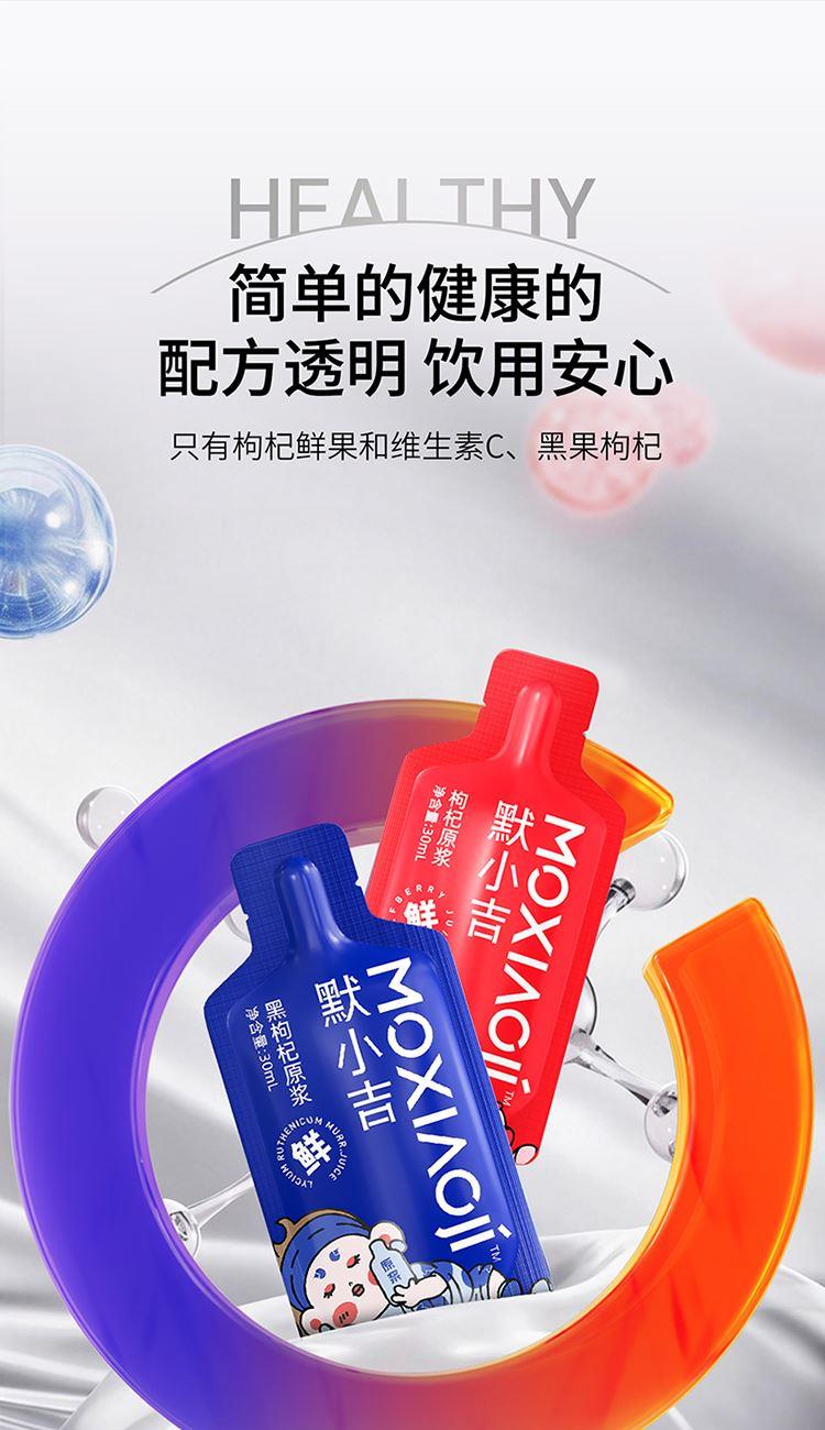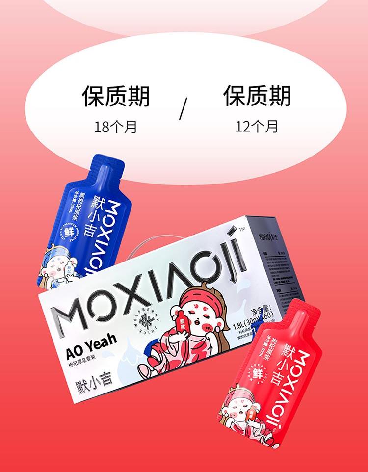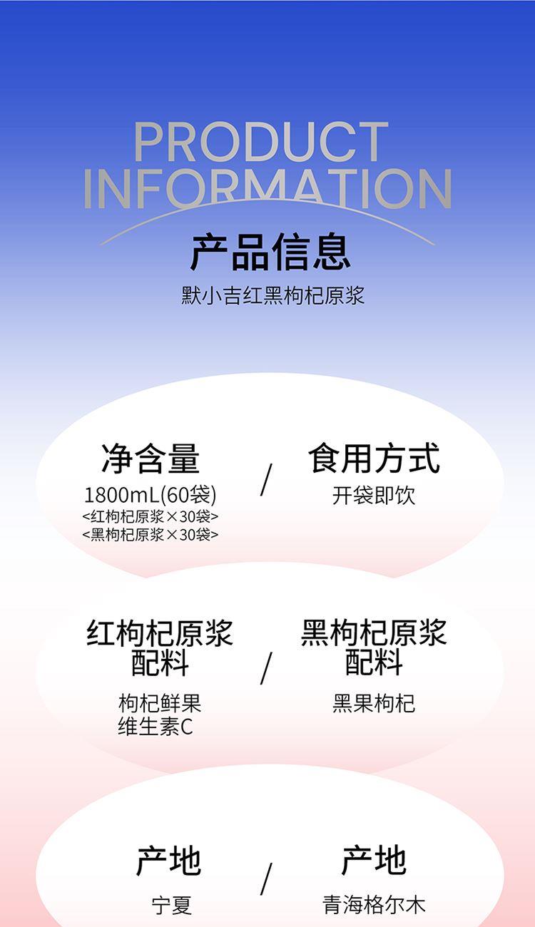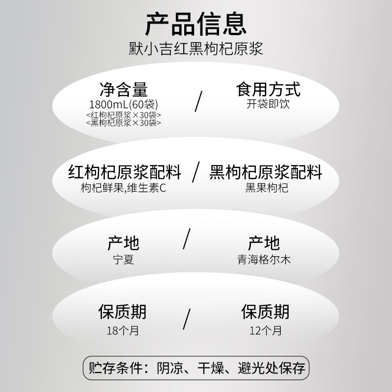 产品信息:默小吉红黑枸杞原浆 净含量:1800mL(60袋) 红枸杞原浆配料:枸杞鲜果,维生素C 黑枸杞原浆配料:黑果枸杞 食用方式:开袋即饮 产地:宁夏 保质期:18个月 产地:青海格尔木 保质期:12个月 贮存条件:阴凉、干燥、避光处保存