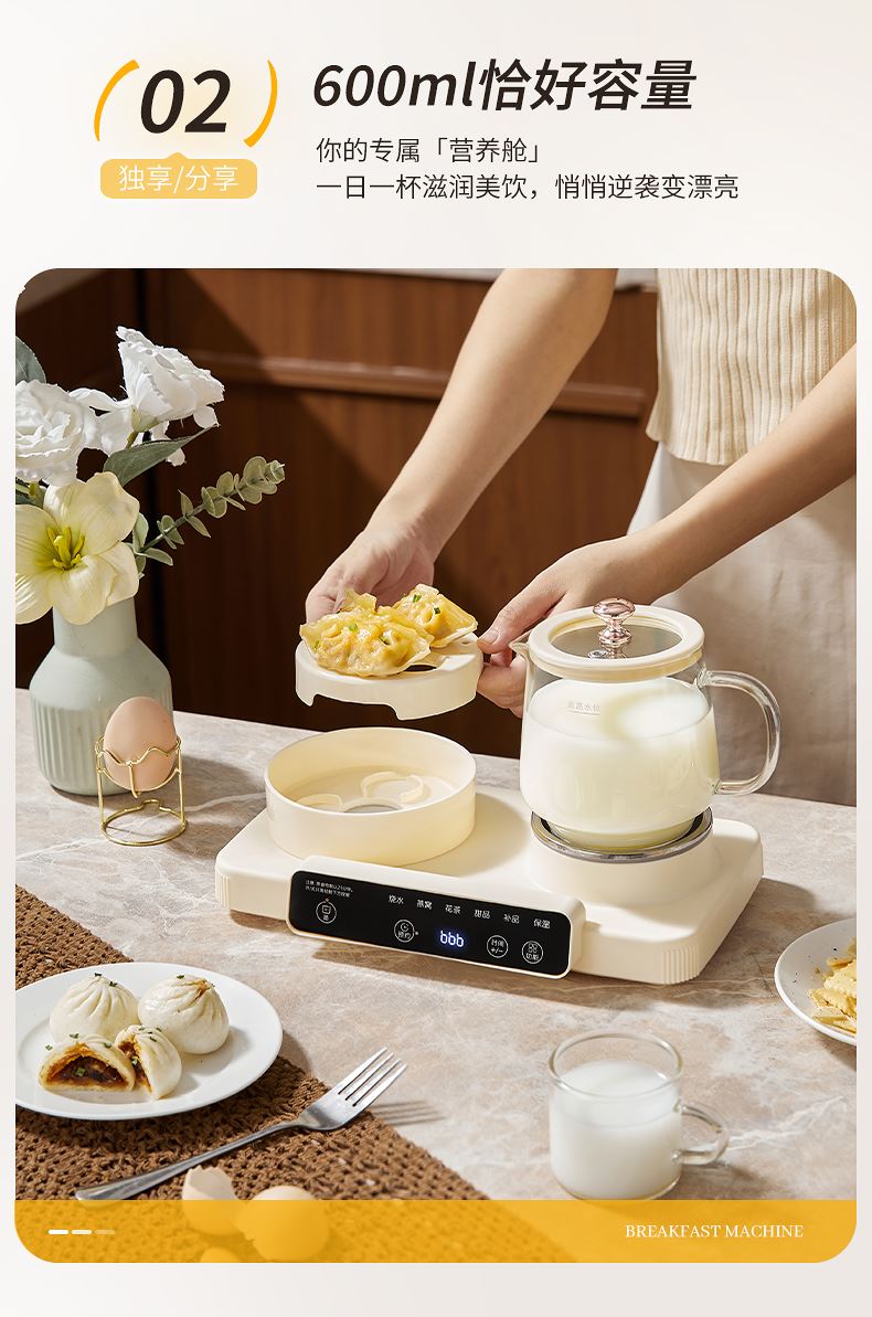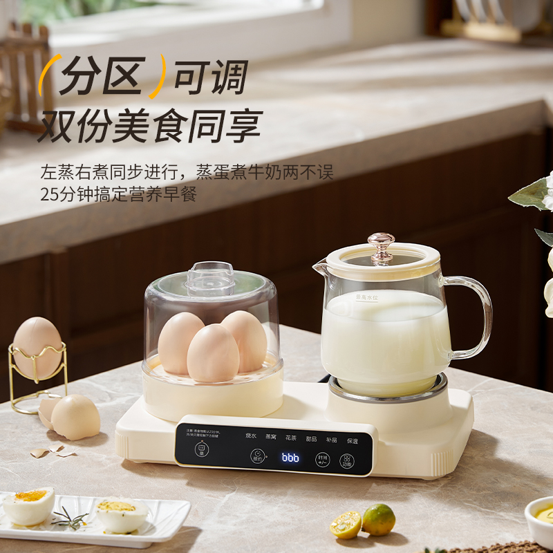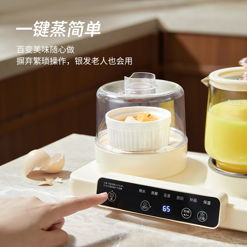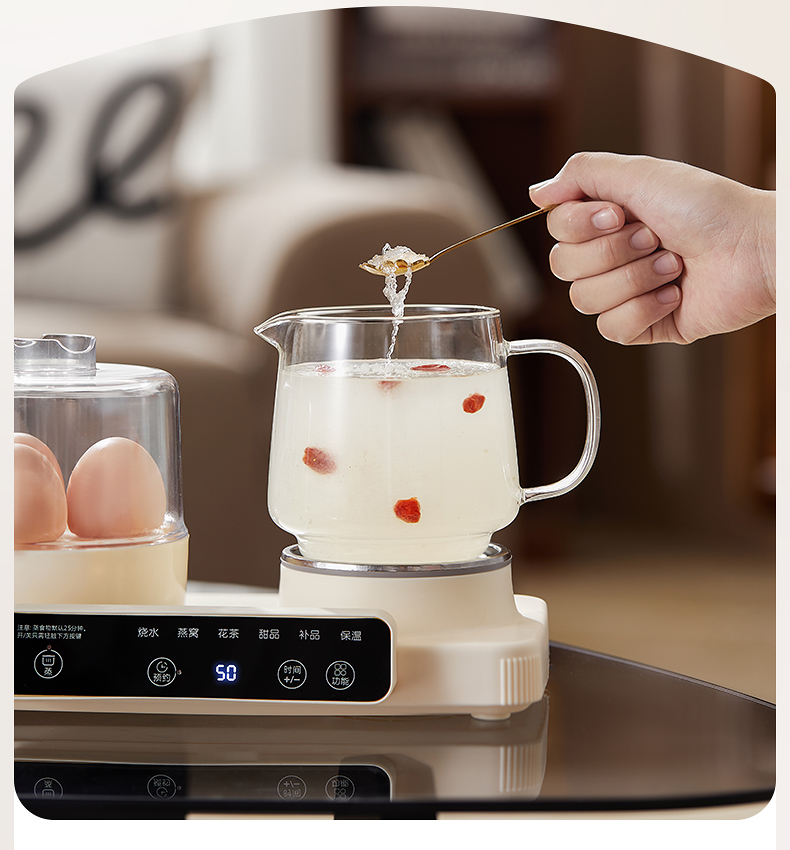 额定功率:470W 颜色:奶油白 主机容量:600ML 规格:二合一养生壶套装 产品款式:微电脑轻触操作 (带数显) 包装清单:蒸蛋架+高硼硅玻璃壶+底座 包装:彩盒包装 特色功能 1、一键蒸煮烹饪,右边炖煮同享; 2、6大预设功能,470W.炖煮更省心; 3、600ML炖煮养生杯恒温杯二合一; 4、分体式养生壶杯壶,清洗方便,提壶即饮; 5、高硼硅玻璃壶轻奢泡茶,高温防干烧自动断电; 6、轻松安装,自动断电,防干烧功能;一机多用,取下直接可用于婴儿暖奶及保温;