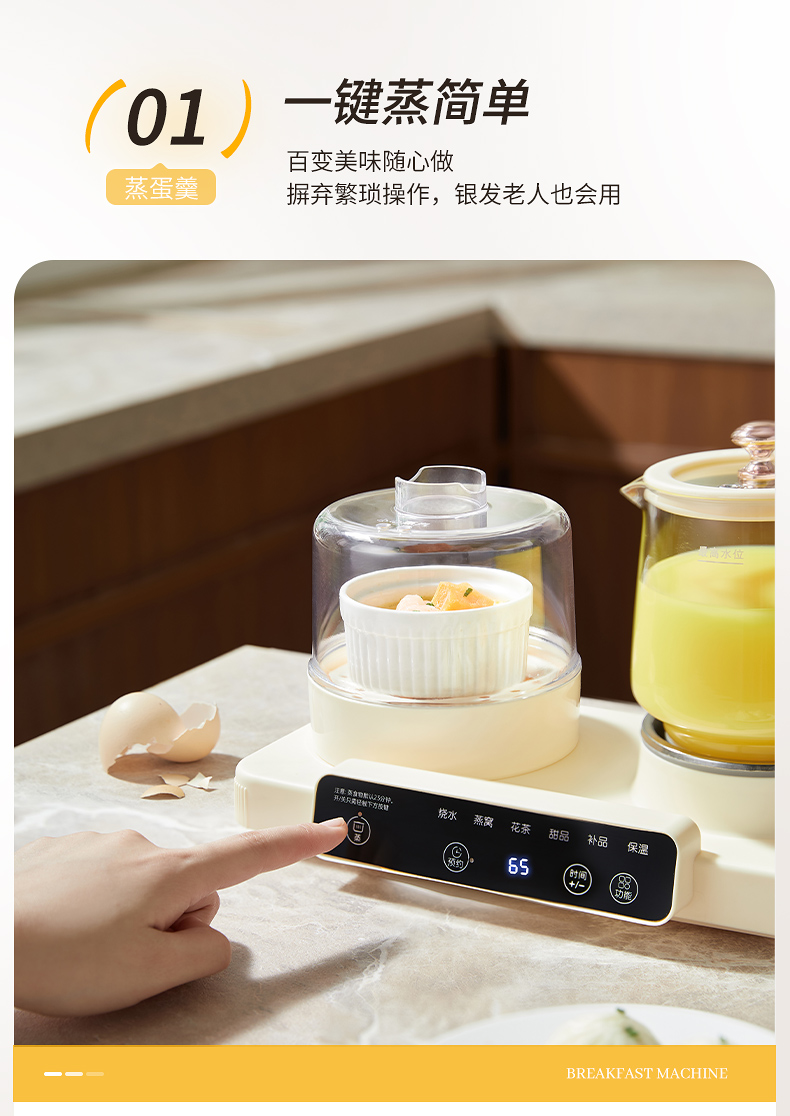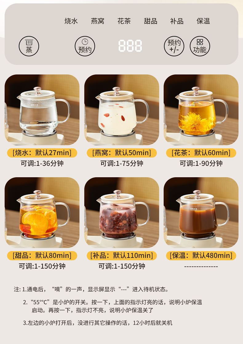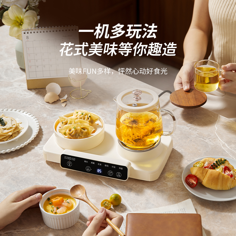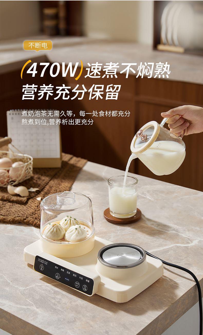 额定功率:470W 颜色:奶油白 主机容量:600ML 规格:二合一养生壶套装 产品款式:微电脑轻触操作 (带数显) 包装清单:蒸蛋架+高硼硅玻璃壶+底座 包装:彩盒包装 特色功能 1、一键蒸煮烹饪,右边炖煮同享; 2、6大预设功能,470W.炖煮更省心; 3、600ML炖煮养生杯恒温杯二合一; 4、分体式养生壶杯壶,清洗方便,提壶即饮; 5、高硼硅玻璃壶轻奢泡茶,高温防干烧自动断电; 6、轻松安装,自动断电,防干烧功能;一机多用,取下直接可用于婴儿暖奶及保温;